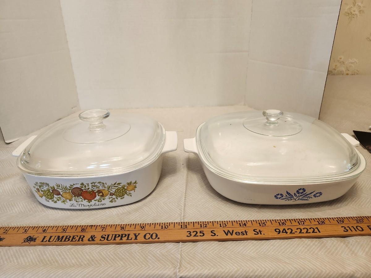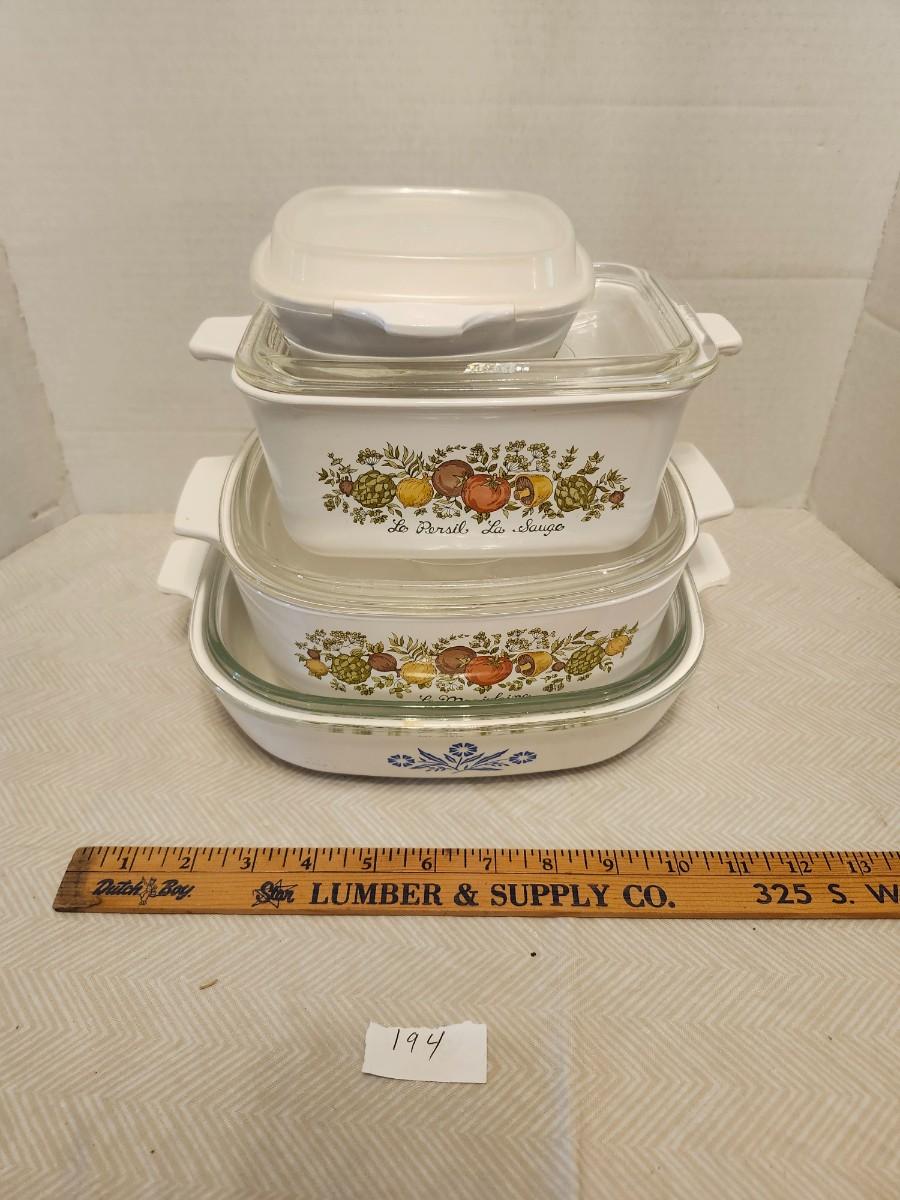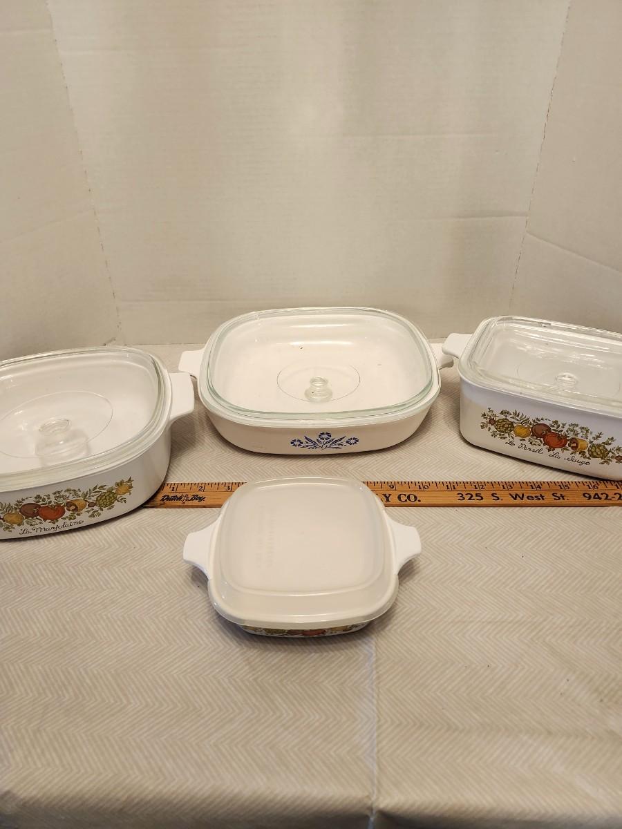 Vintage Corning Ware Spice of three Life La Marjolaine Casserole Dishes with Lids and one Vintage Cornflower Corningware