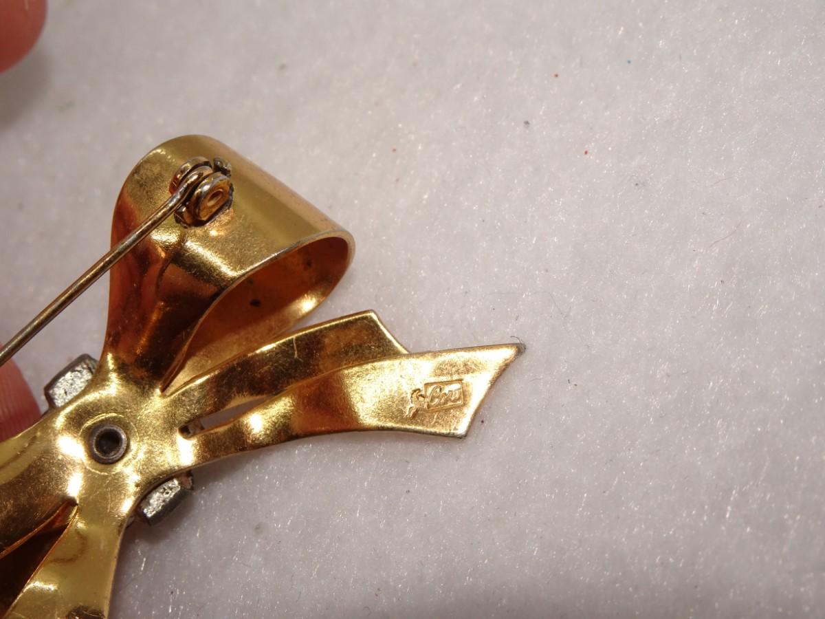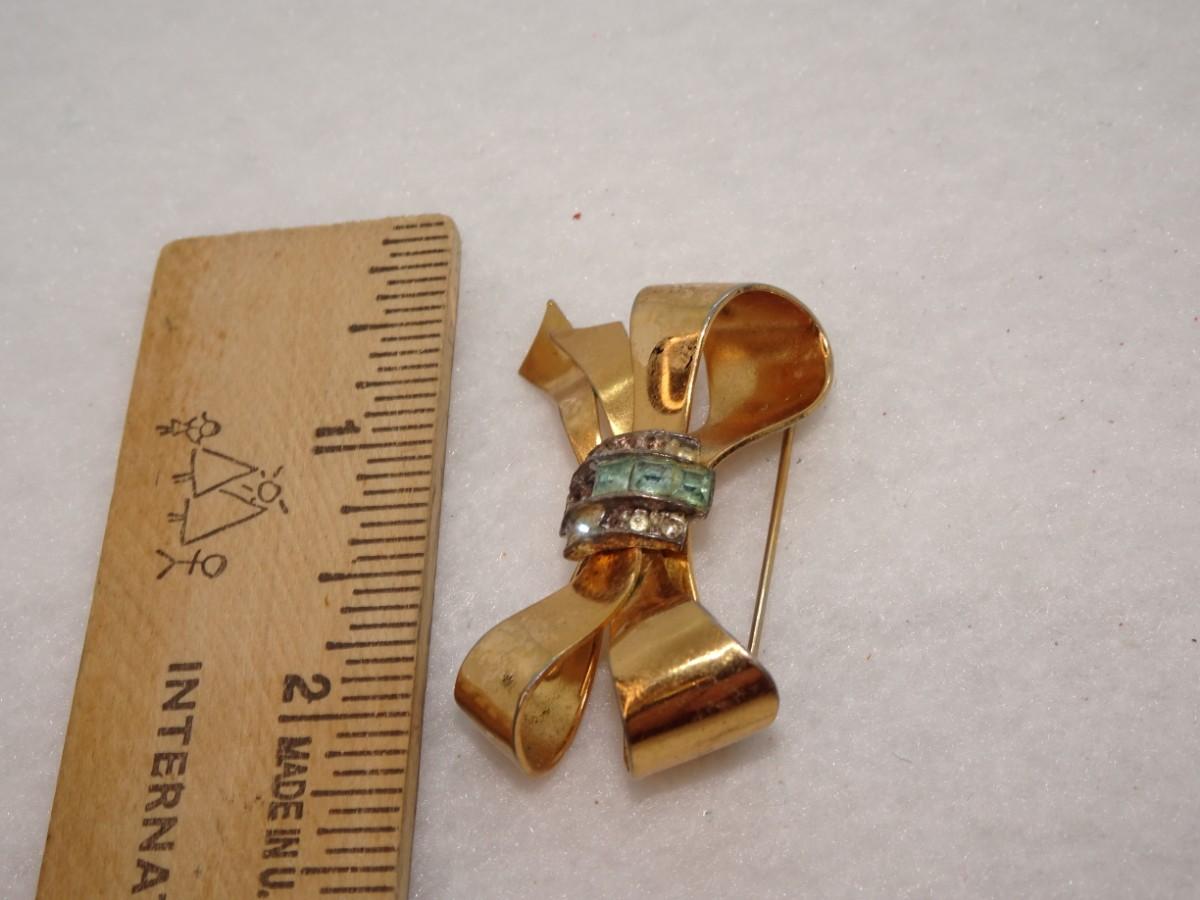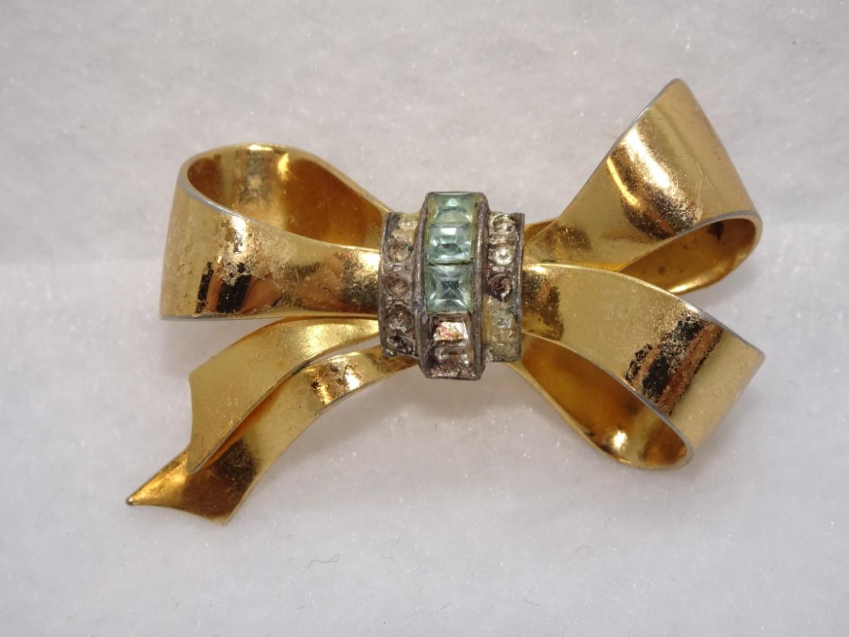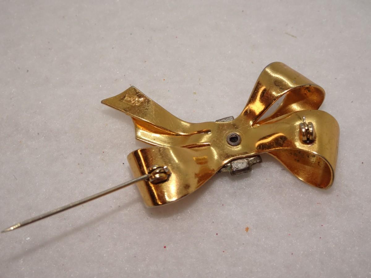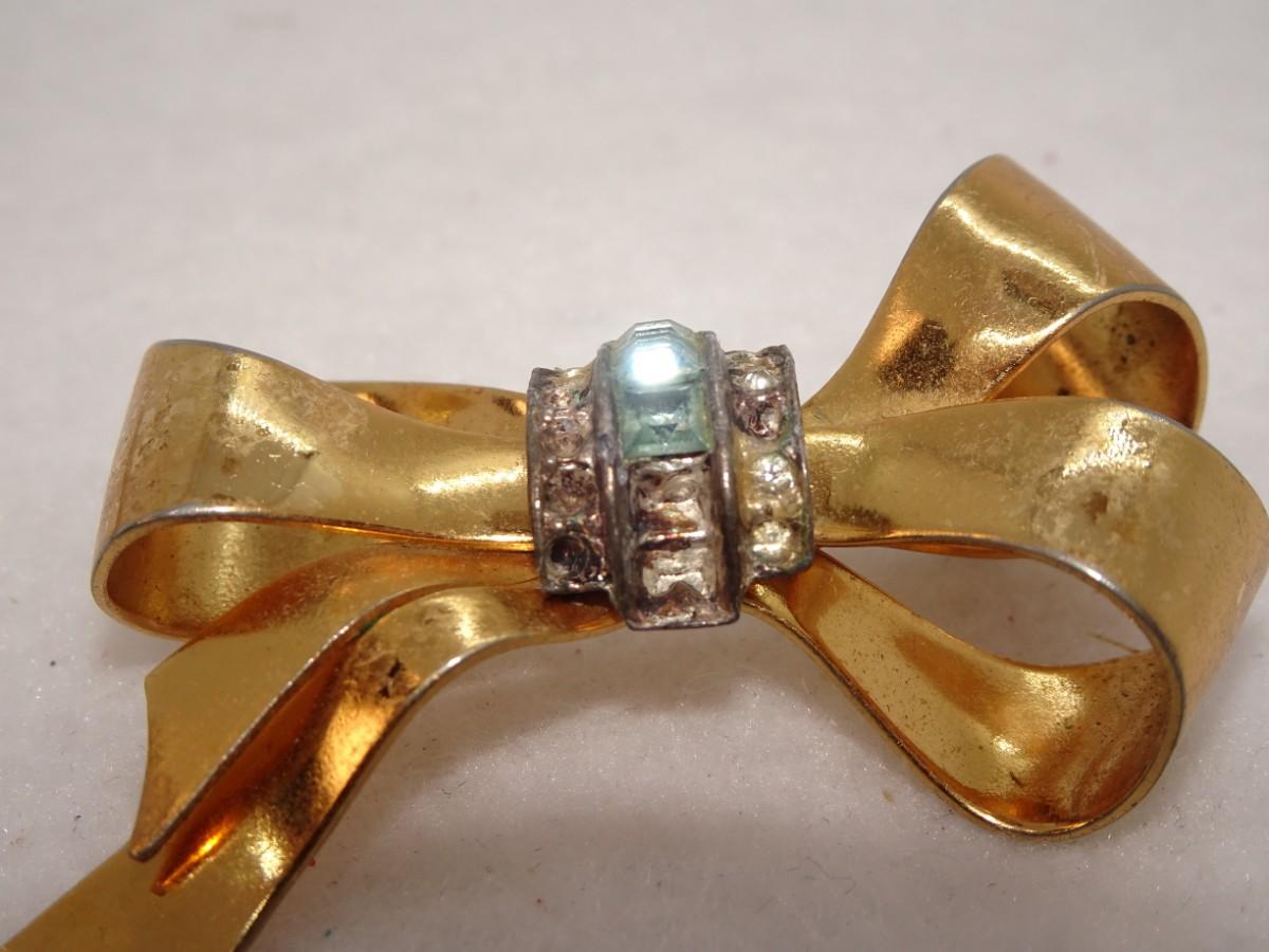 Vintage CORO Gold Rhinestone Bow Pin - missing stones