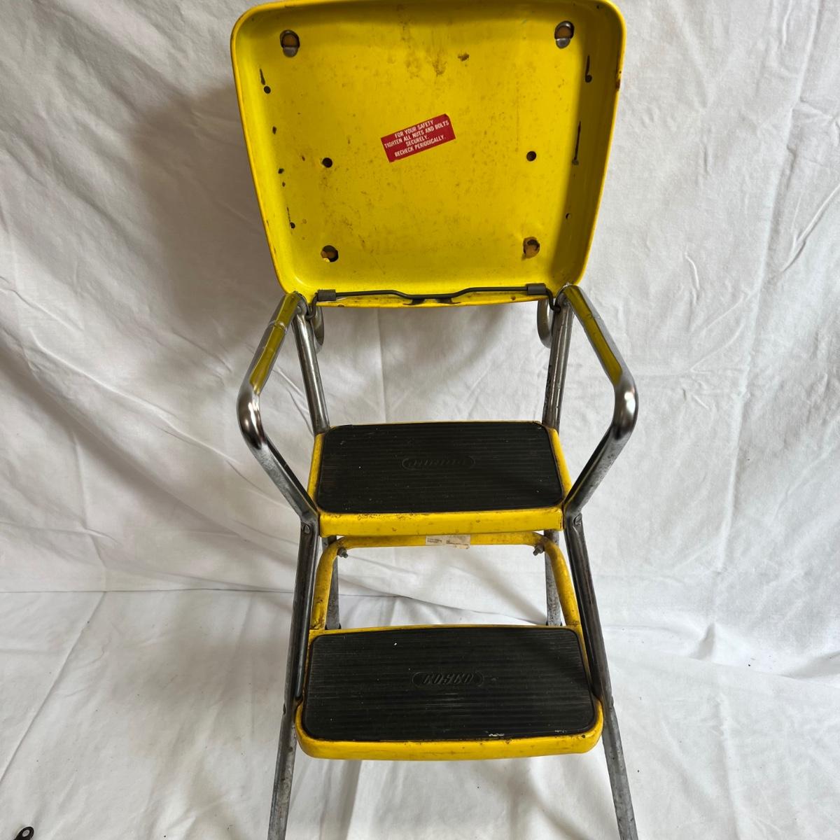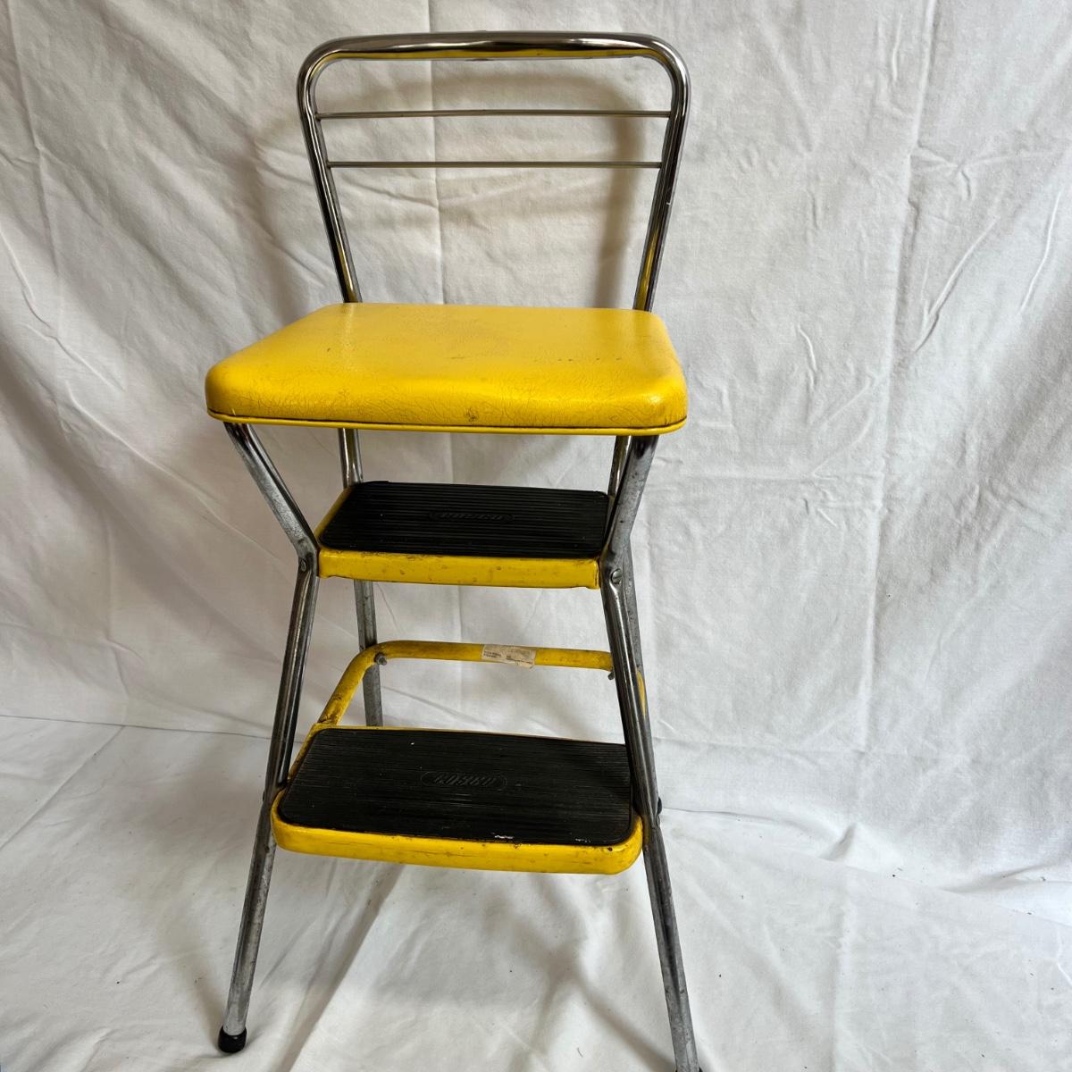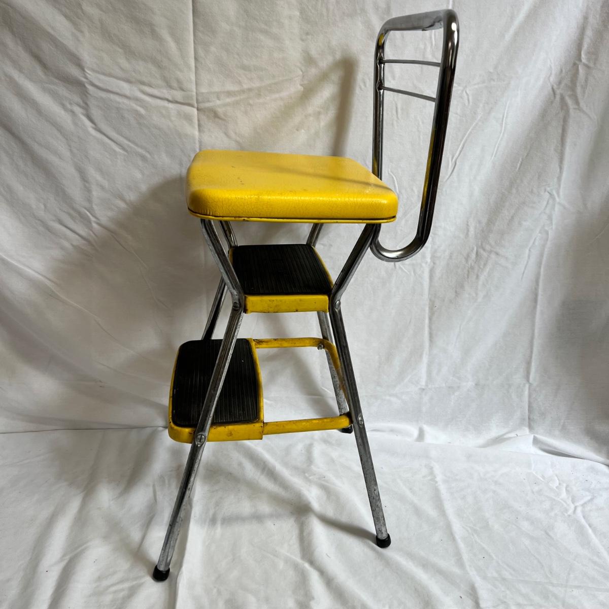 A VERY yellow vintage metal and vinyl chair and step stool. The stool measures 14” X 13” X 32”H.