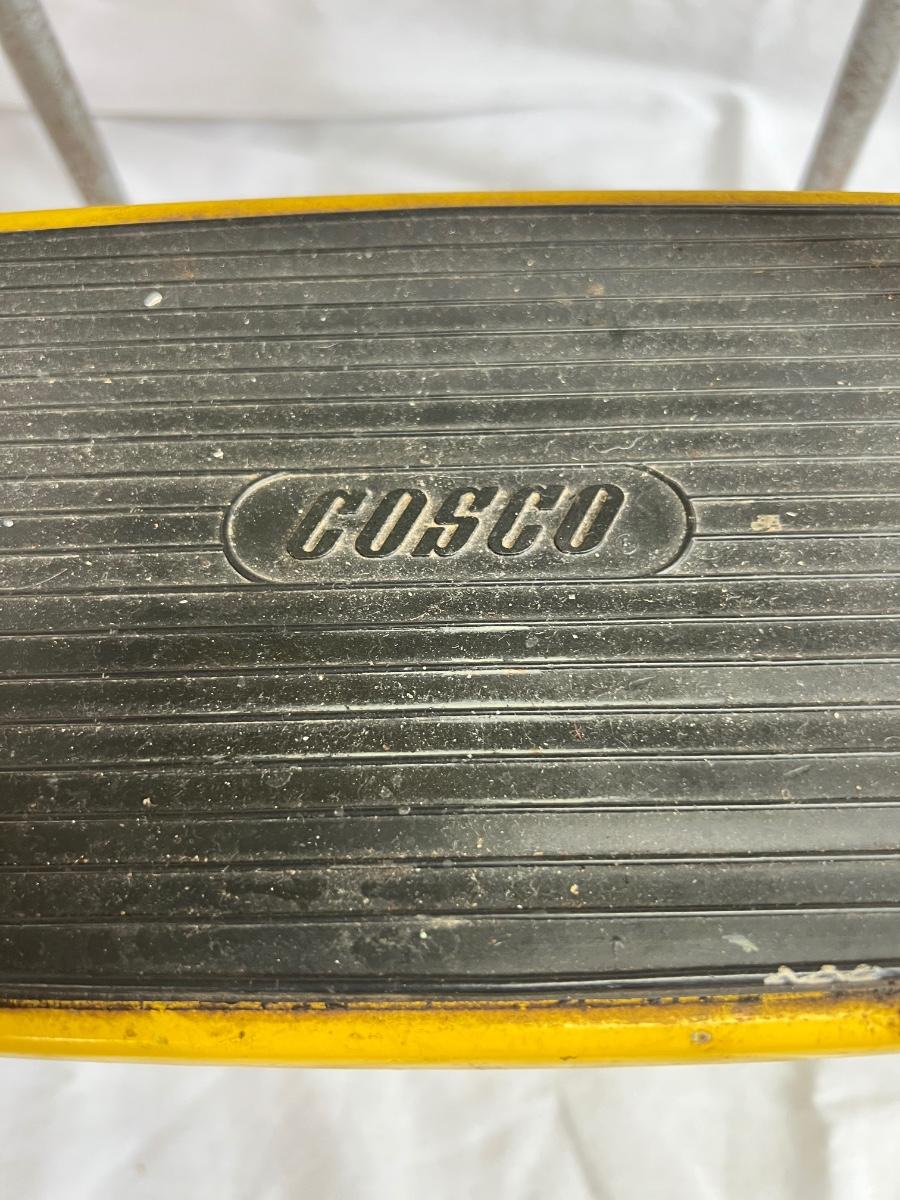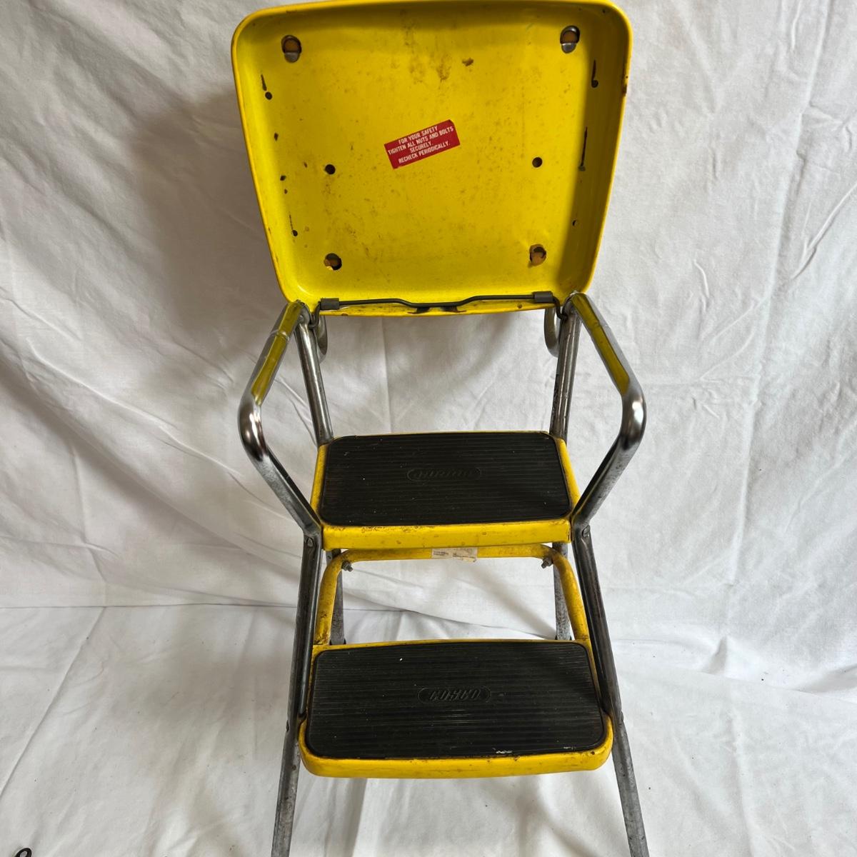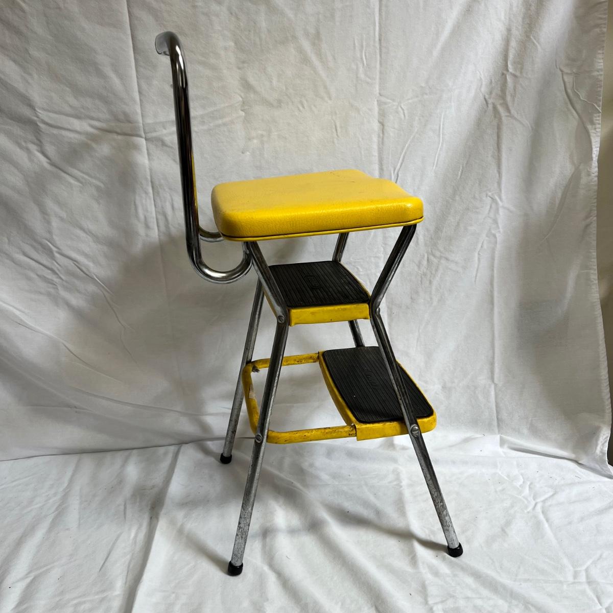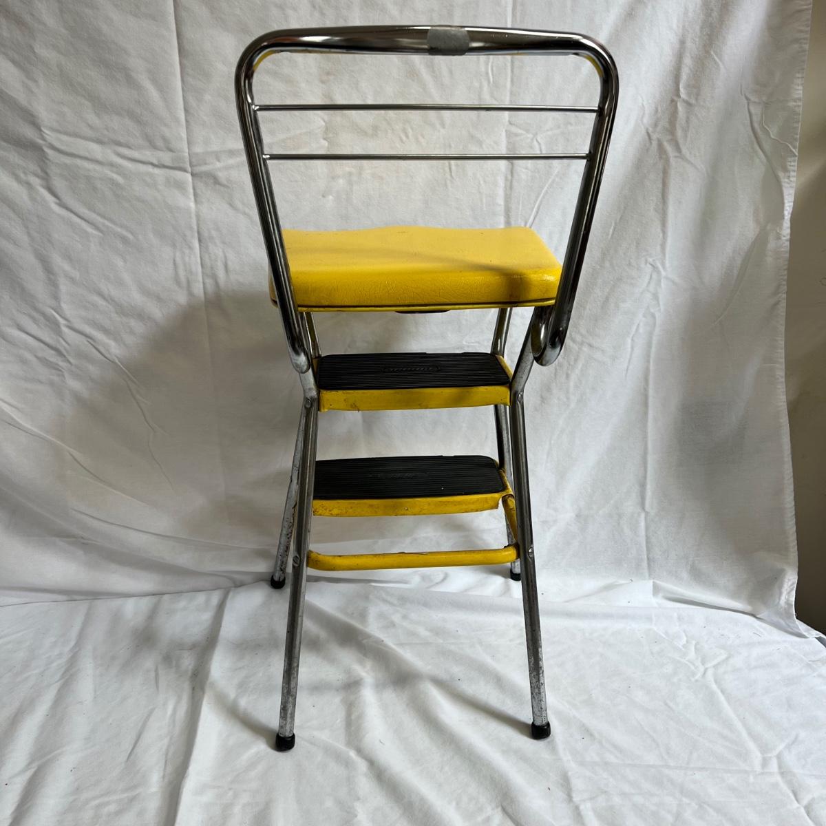A VERY yellow vintage metal and vinyl chair and step stool. The stool measures 14” X 13” X 32”H.