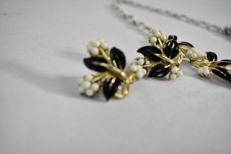 Vintage Costume Jewelry B&W Enamel & Gold Toned Necklace & Clip-on Earrings Coro