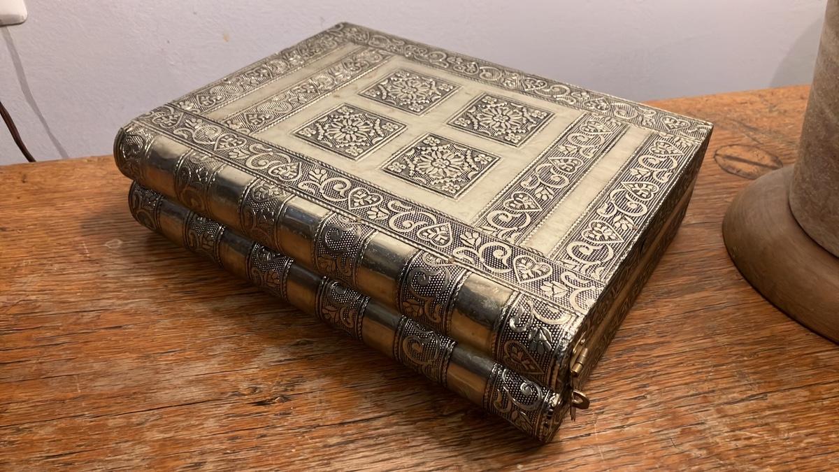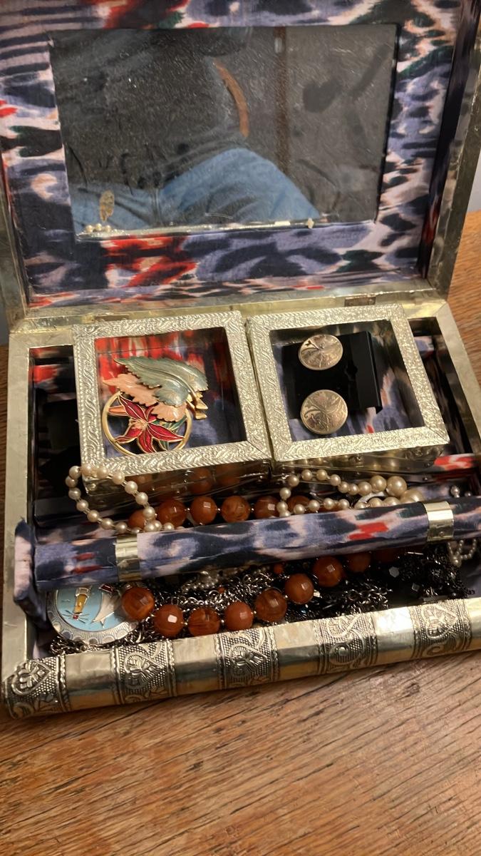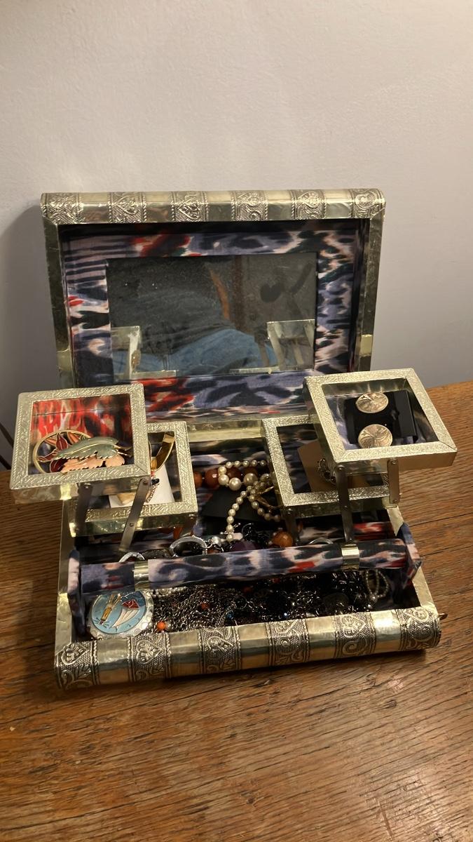 Also included is a clever folding jewelry box that closes to look like two elegant silver-toned "books" (perfect for a bookshelf disguise!). When closed: 11 inches wide x 8.5 inches deep. It unfolds into a multi-tiered organizer with compartments, ring holders, and lined sections — ideal for storing this collection or your own jewelry.