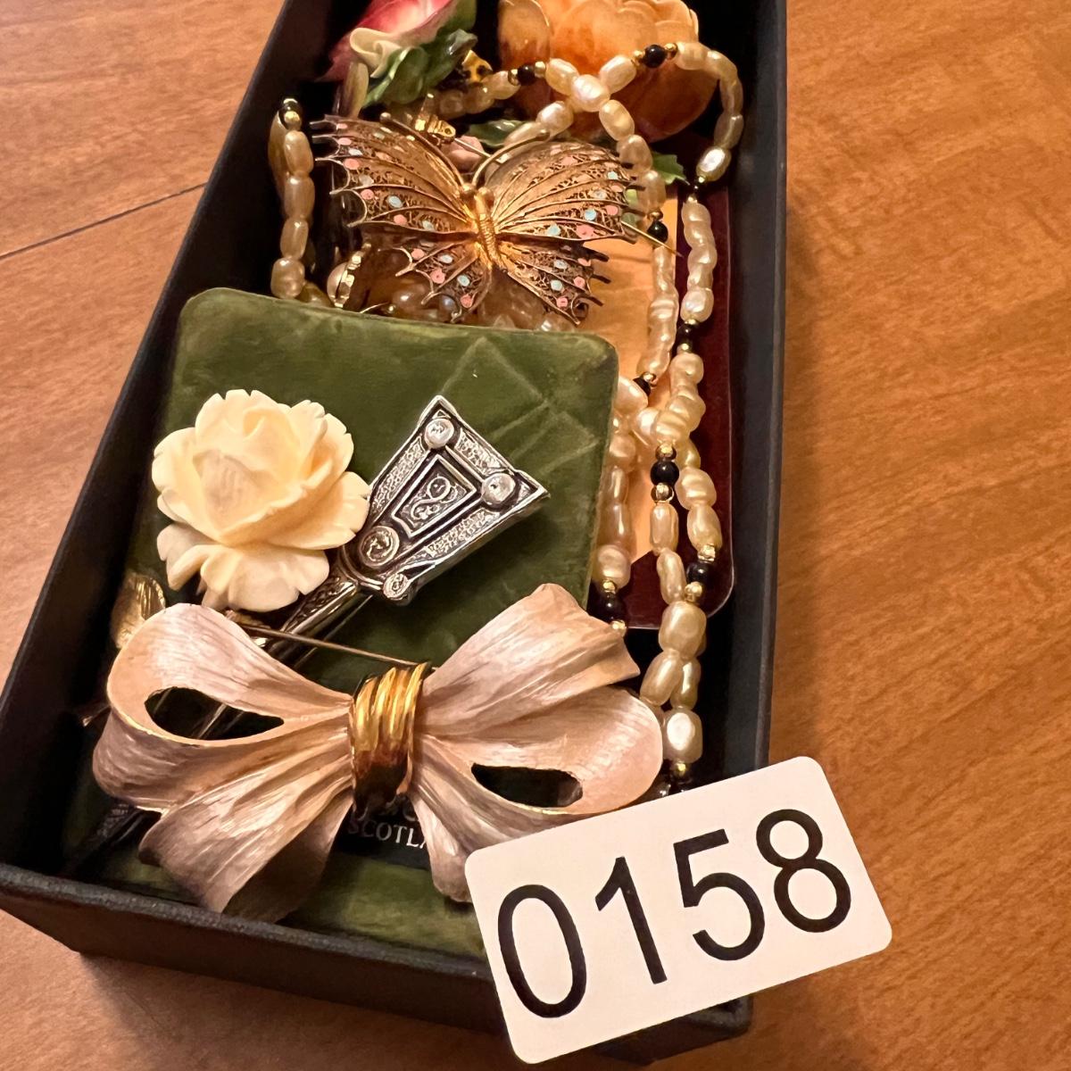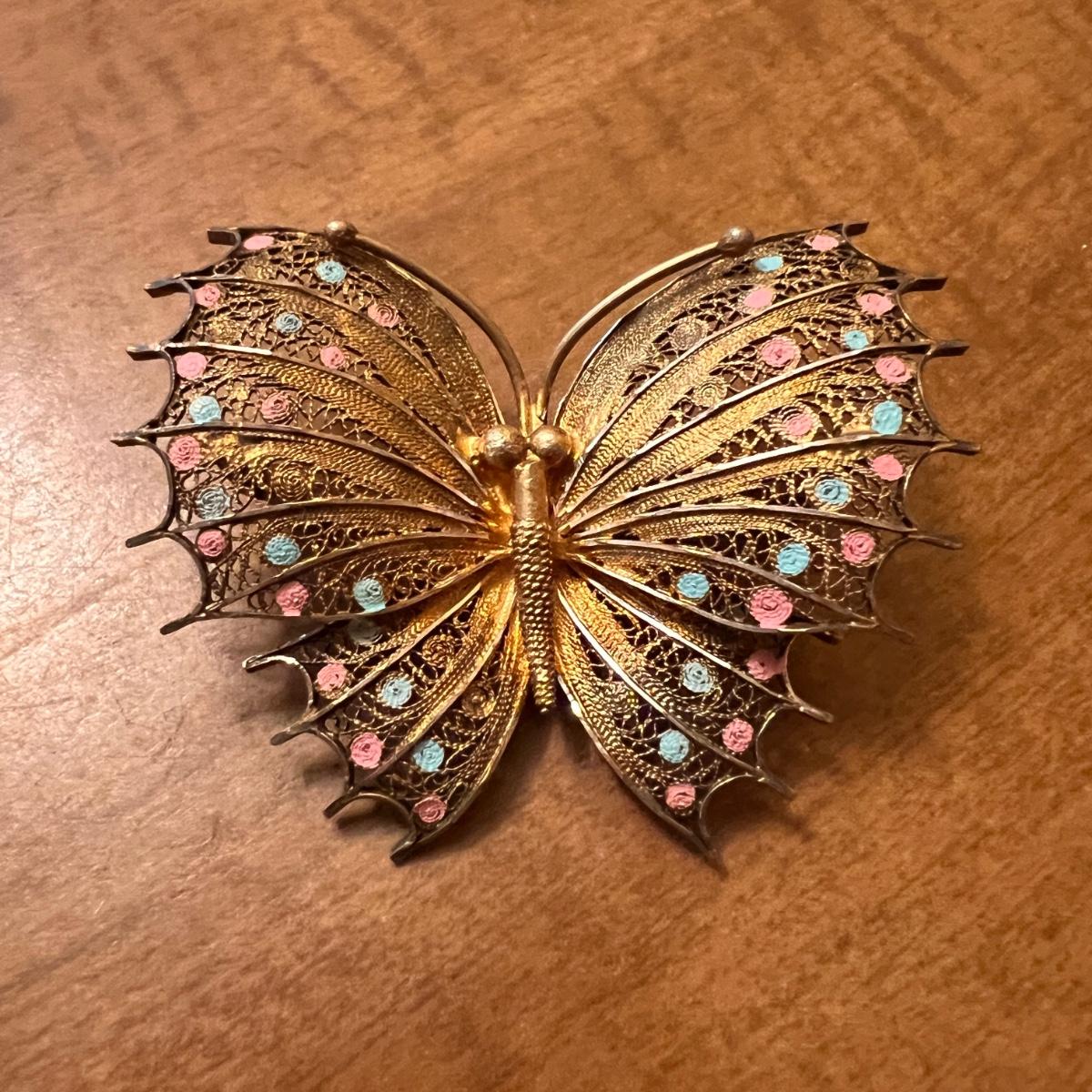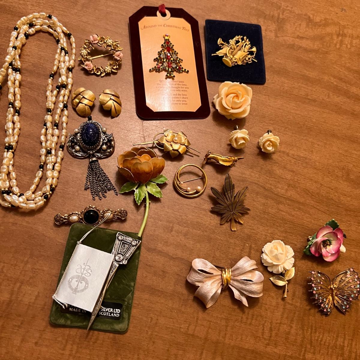 Vintage costume jewelry including designer pieces by Krementz, Staffordshire, Lisner. Mother of Pearl brooch, Butterfly is believed to be sterling silver and gold filigree enamel brooch. Art pewter Irish kilt pin.