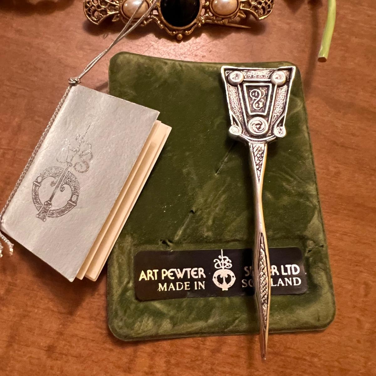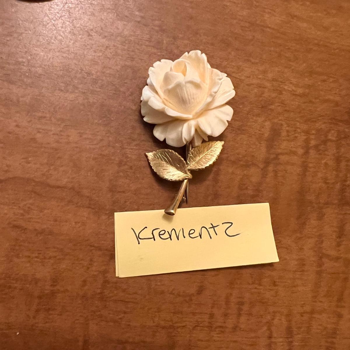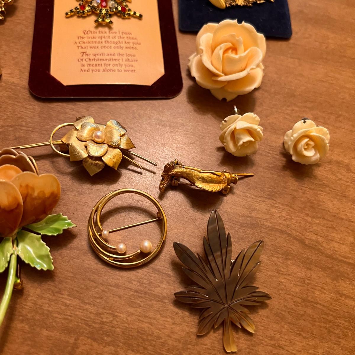 Vintage costume jewelry including designer pieces by Krementz, Staffordshire, Lisner. Mother of Pearl brooch, Butterfly is believed to be sterling silver and gold filigree enamel brooch. Art pewter Irish kilt pin.