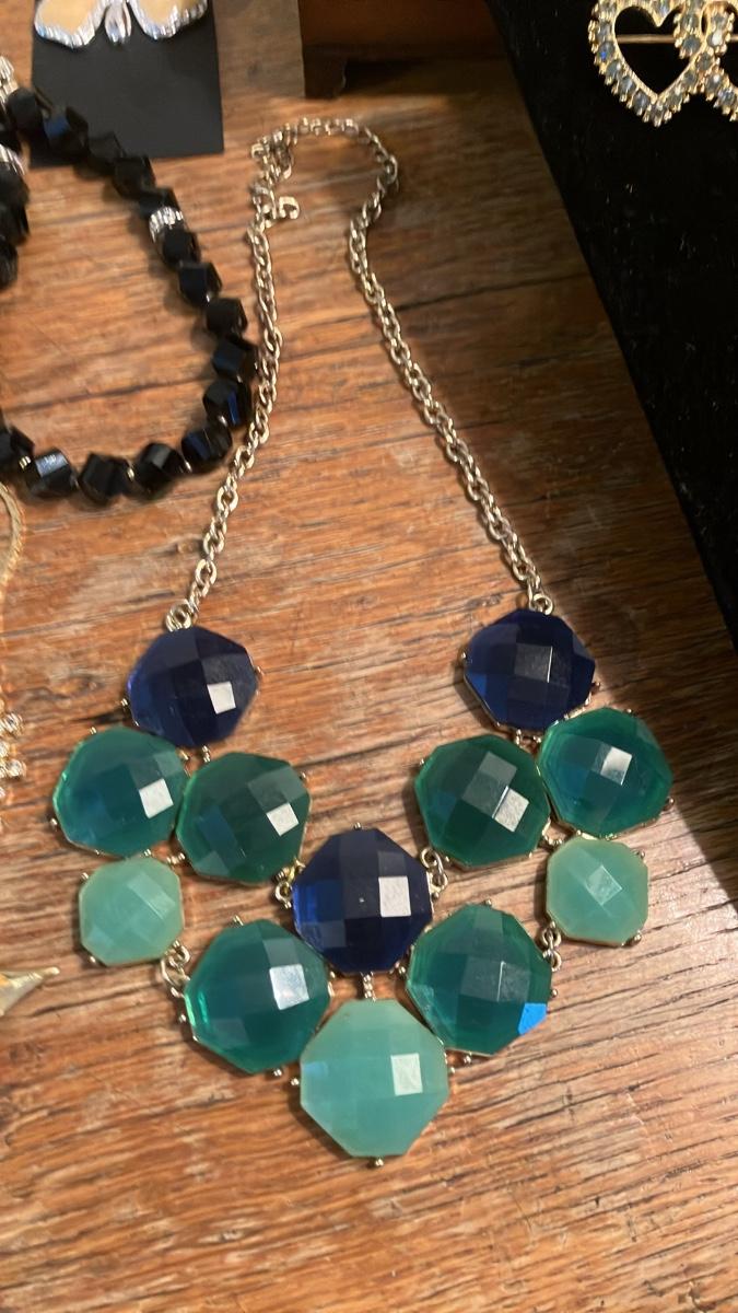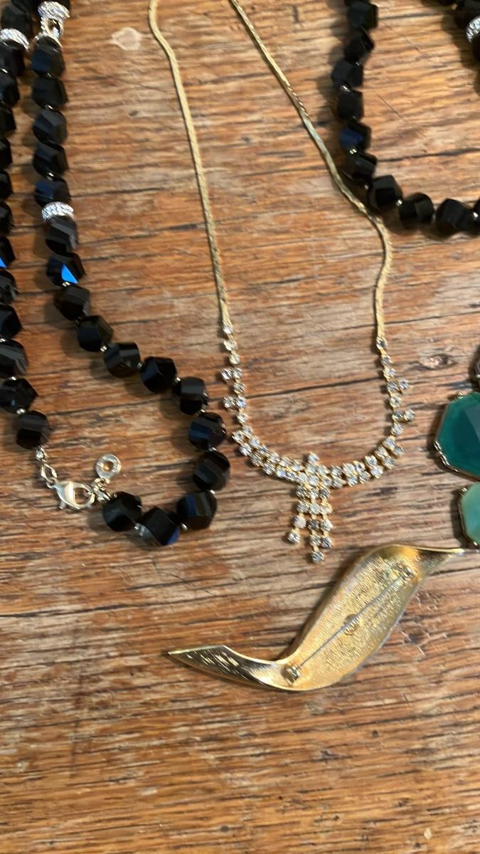 Estate-found collection of 15 vintage costume jewelry pieces from the mid-20th century (1950s–1980s era), featuring a wonderful mix of brooches/pins, necklaces, earrings, bracelets, and a watch fob-style item. Highlights include bold statement necklaces with green/blue faceted stones and dangling beads, sparkling rhinestone bangle/bracelet, gold-tone feather and floral motifs, black bead strand with accents, and several attractive brooches (some with winged or jeweled designs). A few pieces show classic styles from sought-after makers.