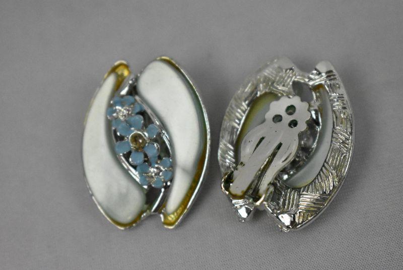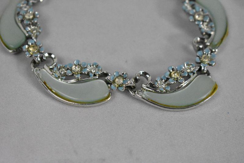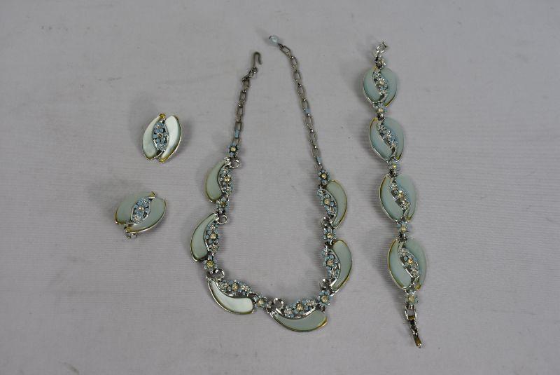 Vintage Costume Jewelry, 3 Piece Set: Pearly Blue & Floral Necklace, Bracelet & Clip on Earrings