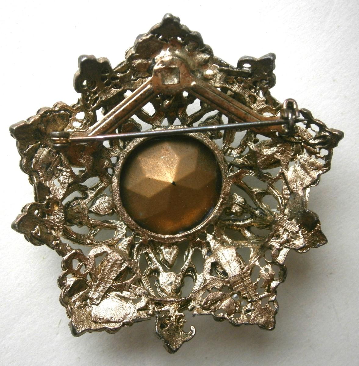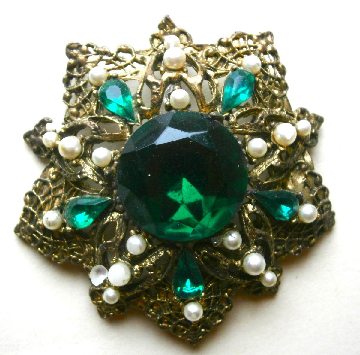 Vintage Costume Jewelry Pin/Brooch, 2 1/8 in. wide, faux stones and pearls on gold tone metal.