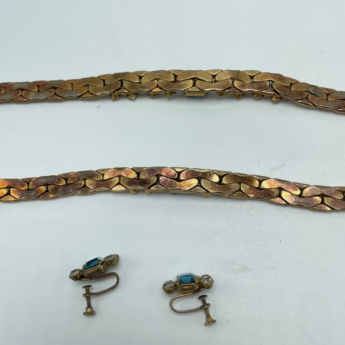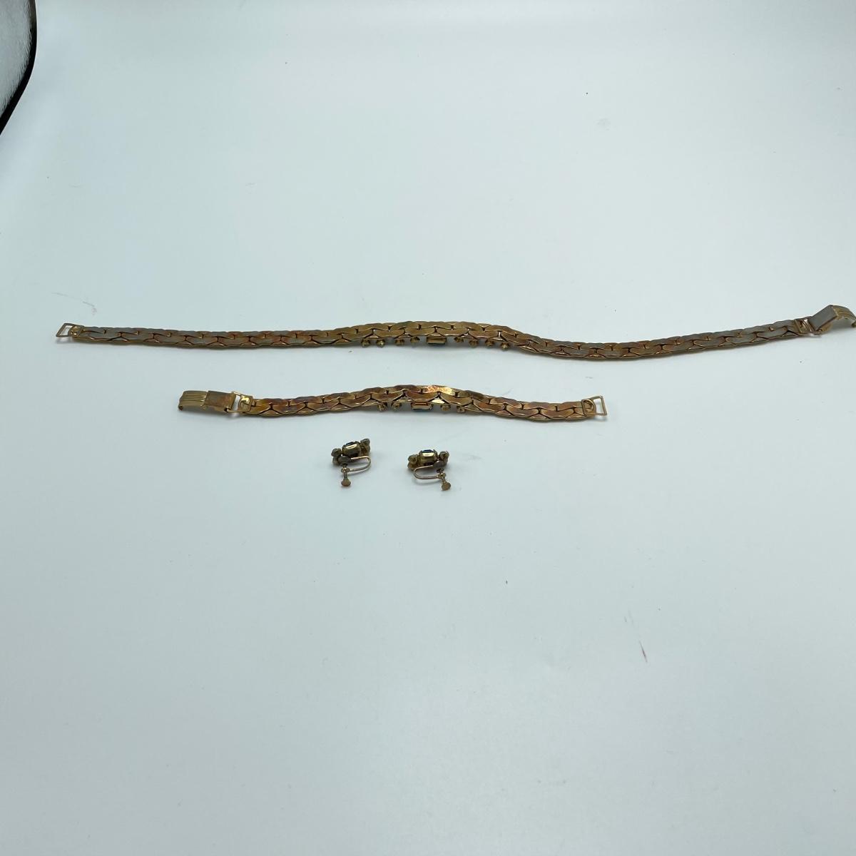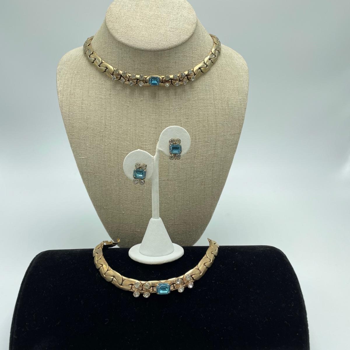 Matching set includes two clip earrings, a small choker style necklace and bracelet. Pieces are heavy and have a slightly reddish underside. See images. No markings were found. Shipping available.
