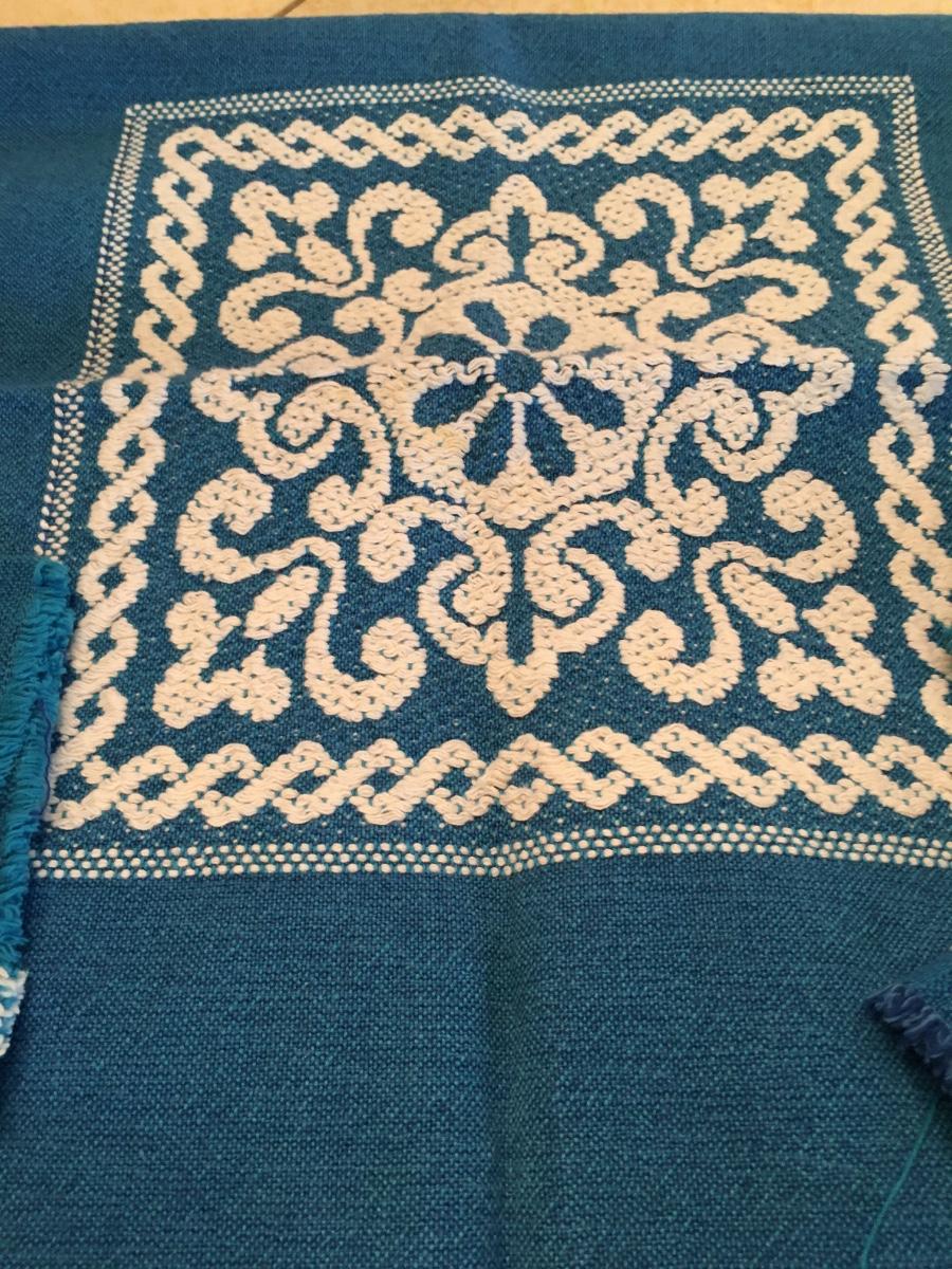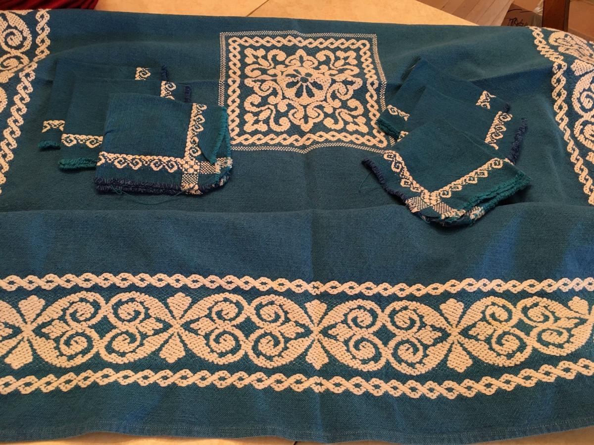 Thick cotton woven tablecloth with abstract center panel and trim. Comesw ith 6 napkins. Excellent condition