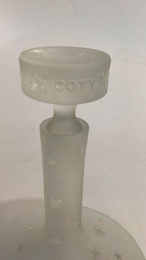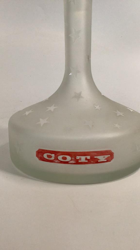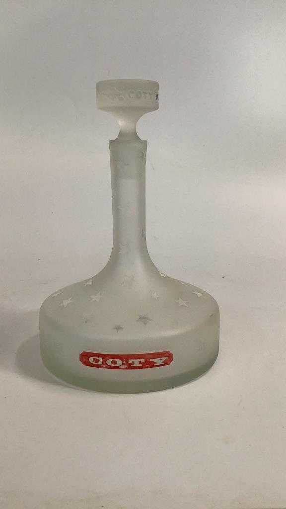 A Store Display bottle for Coty Cosmetics and PerfumeÂ…13 inches tall in a frosted glass with overall star patternsÂ…matching stopperÂ…the bottle is flat bottomed, COTY in Red at FrontÂ…these are hard to find with