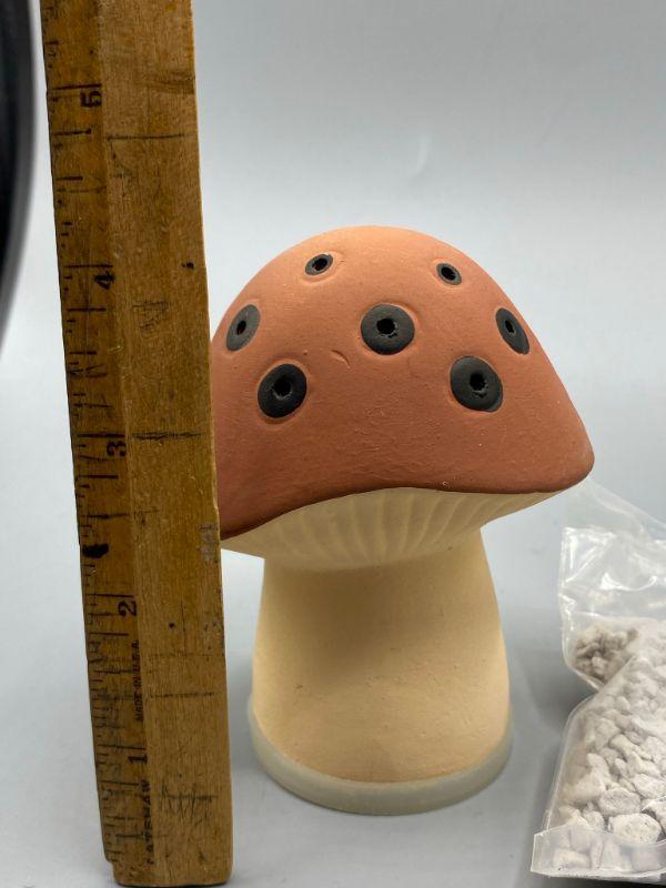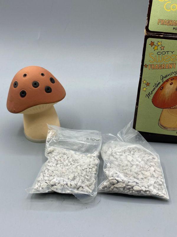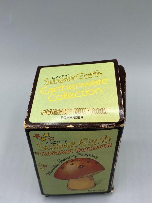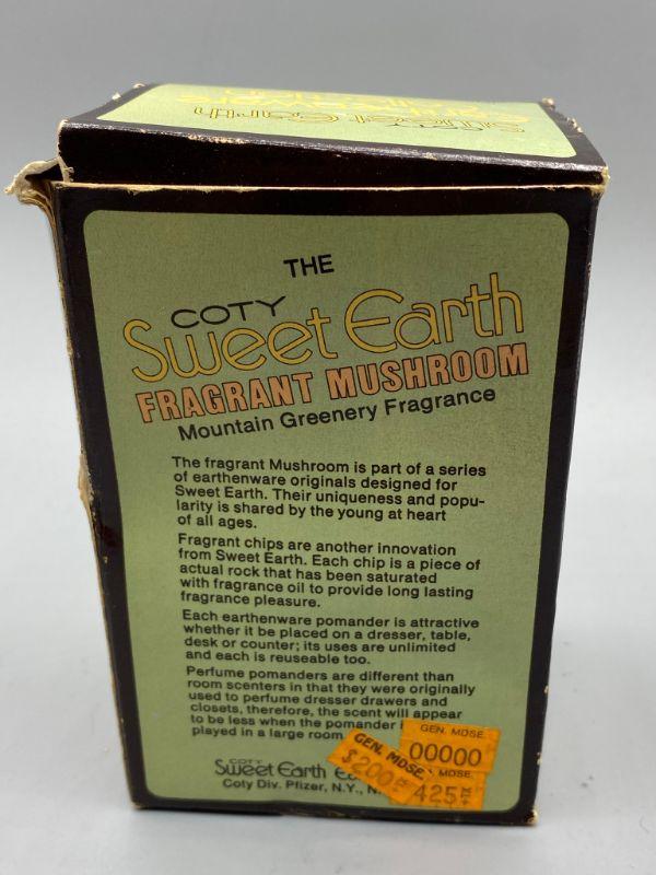Vintage Coty perfume Sweet Earth Fragrant Mushroom. Comes in original box. Has two bags of scent stones to put inside the mushroom. Original Coty fragrance has worn away but you could use essential oils or your favorite perfume in place for scent. Box has some wear but mushroom is in great condition. About 4" size.