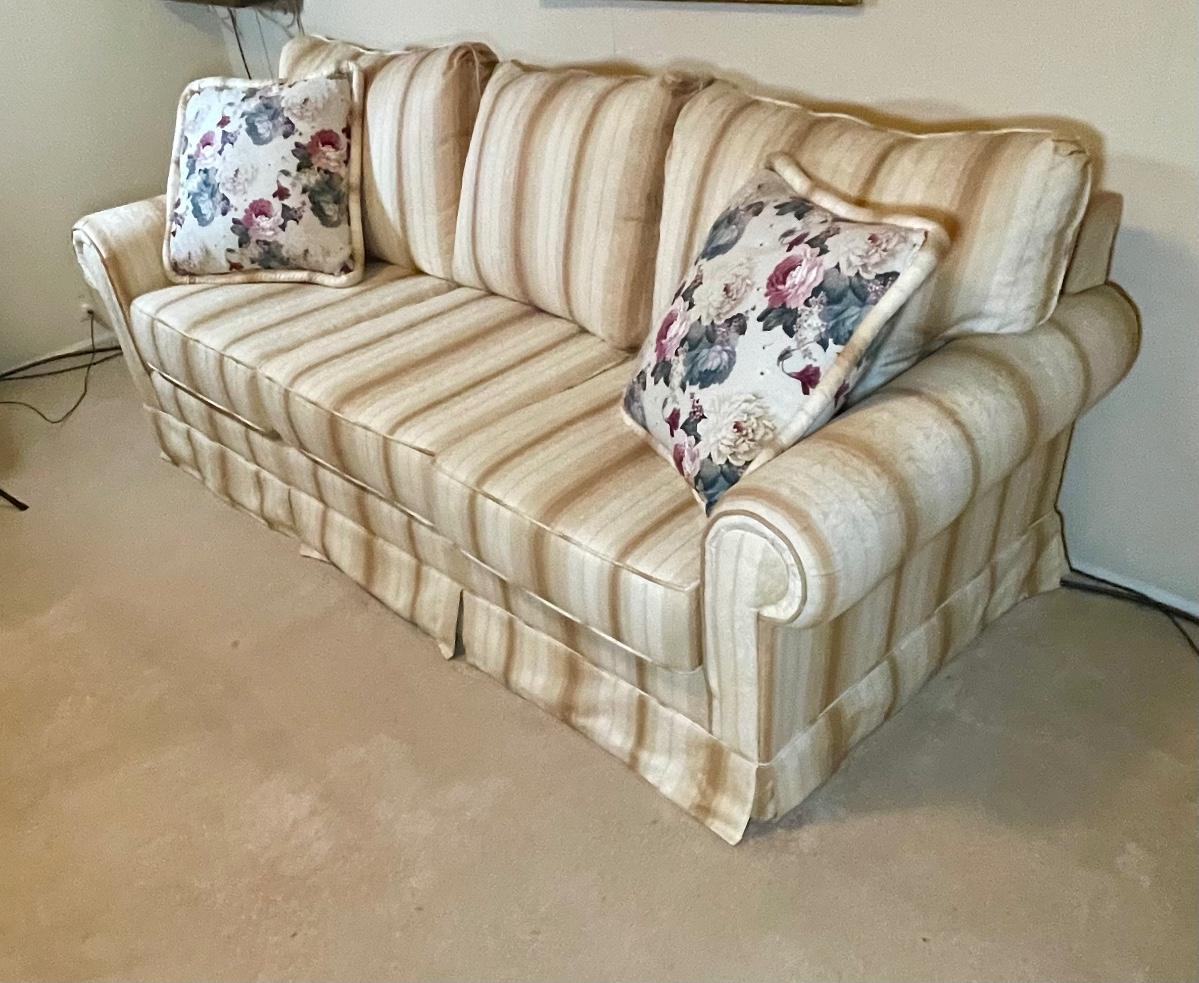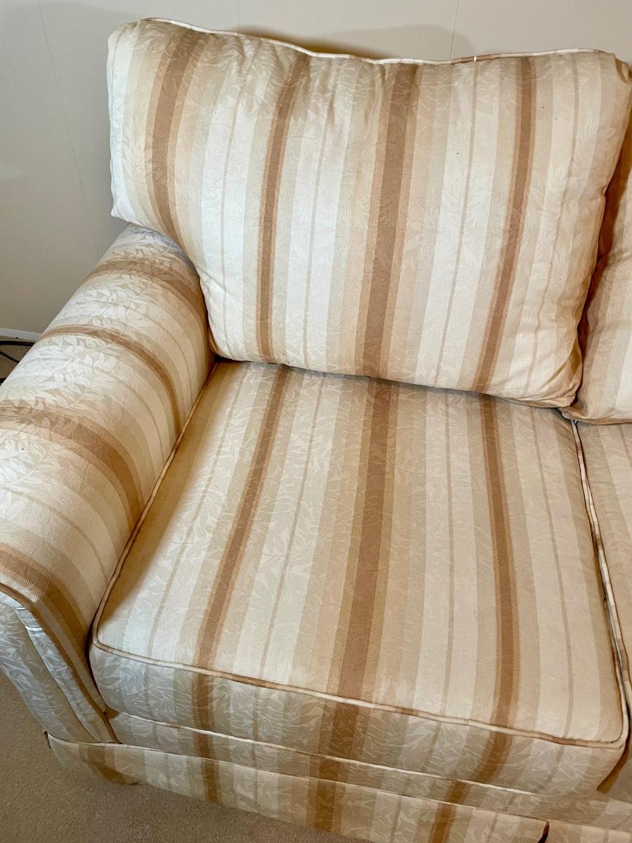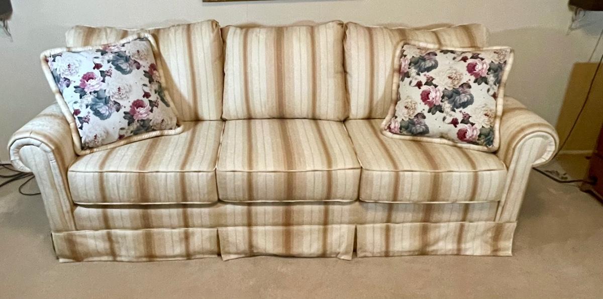 Manufacturer unknown. Has 2 matching square pillows, couch looks new, barely used. Measures approx. 92” long, 36” deep, 36” tall. No stains, tears or any visible damage.
