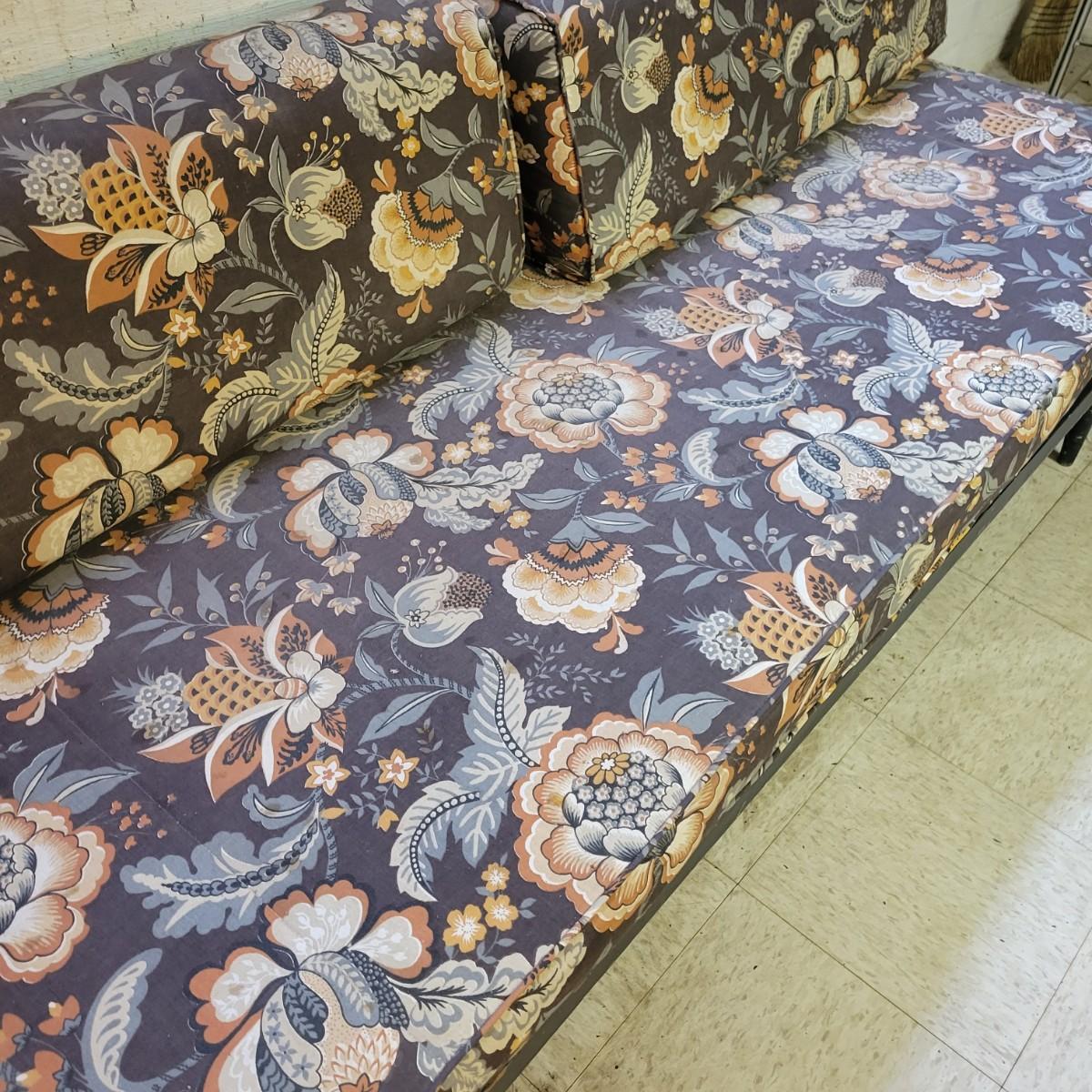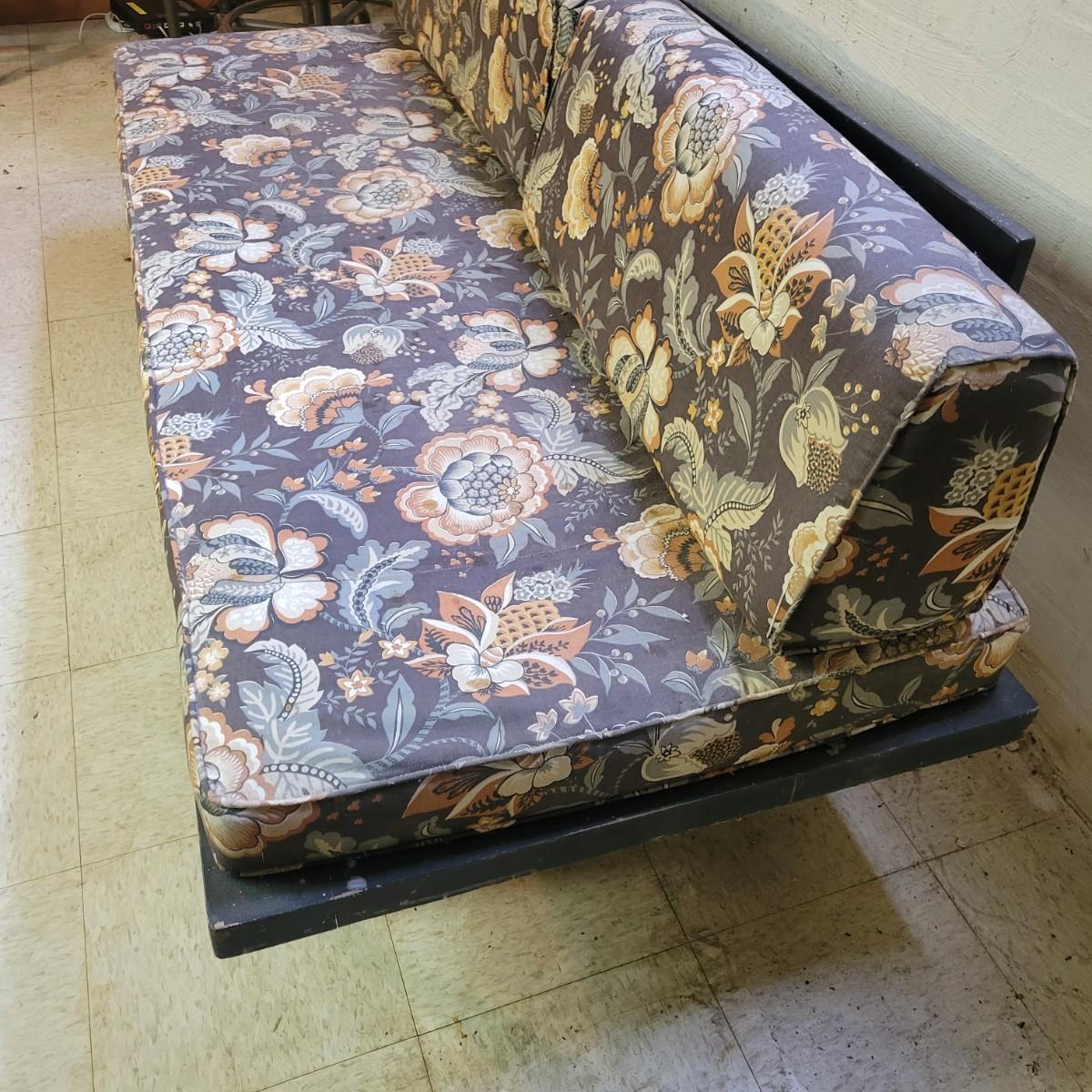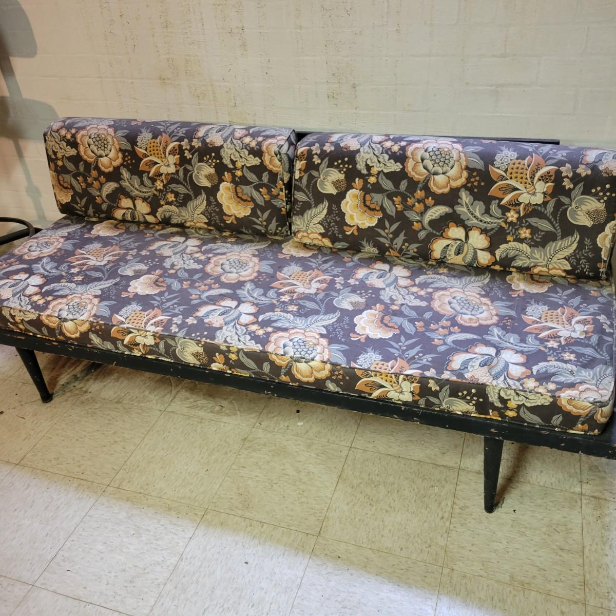 A vintage couch with removable cushions in a floral motif. Couch is in good to fair condition with some chipped paint on the wooden frame that could easily be refinished. Upholstery/cushion is a little faded and has a slight basement odor as it has been in a billiards room in the basement, but is not overwhelming. Couch measures approximately 75" x 30" x 29" with a seat height of 16.5". Local pickup only