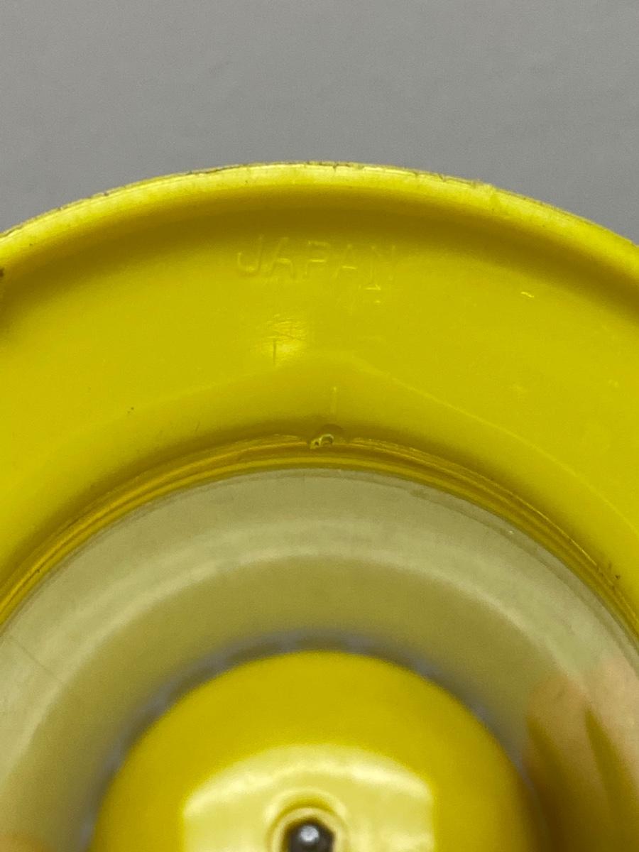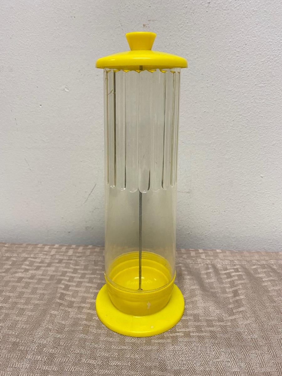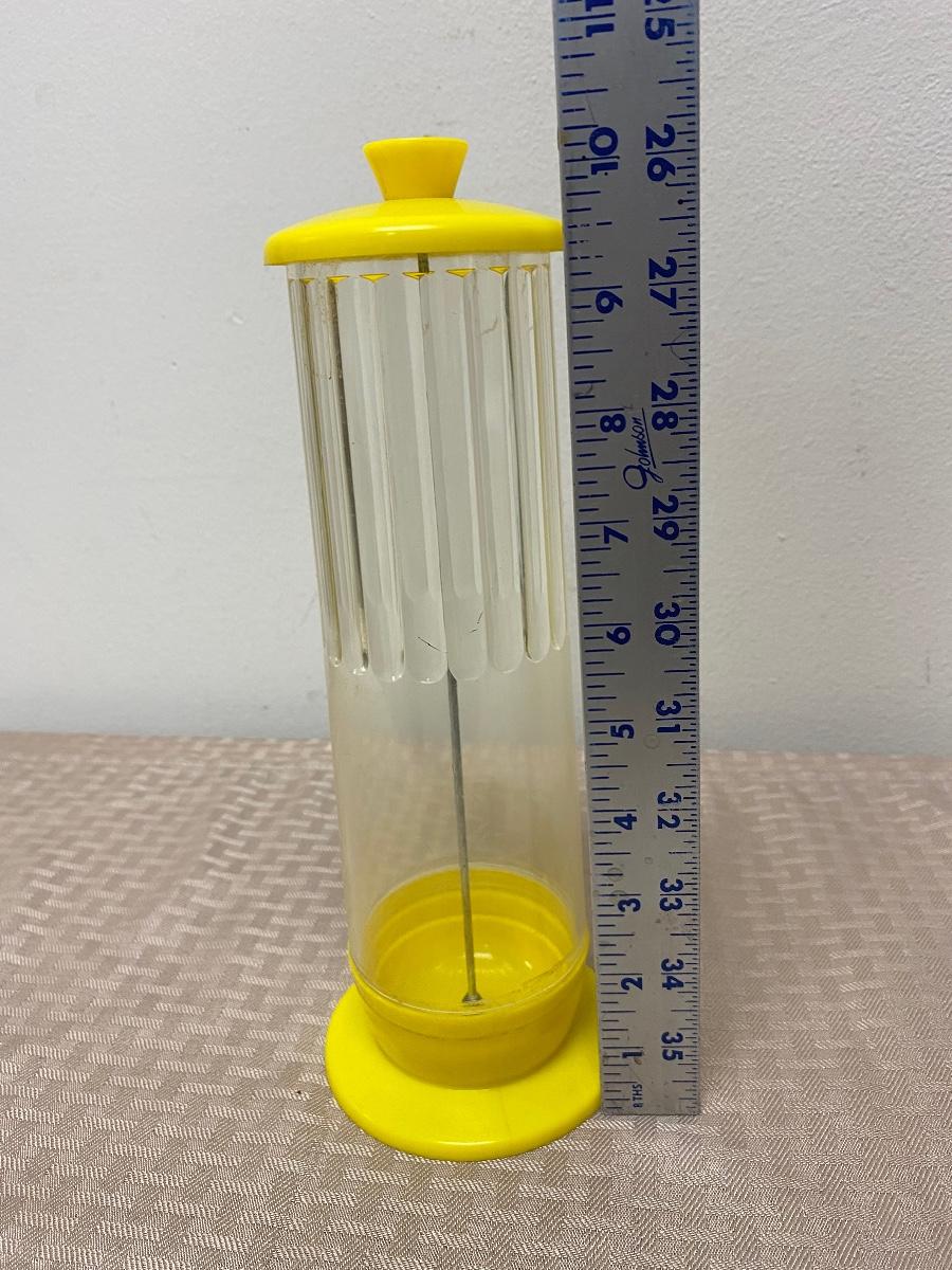 Vintage yellow plastic straw holder dispenser. Pull up on the top to get straw out. Overall good condition, does have signs of age. Made in Japan.