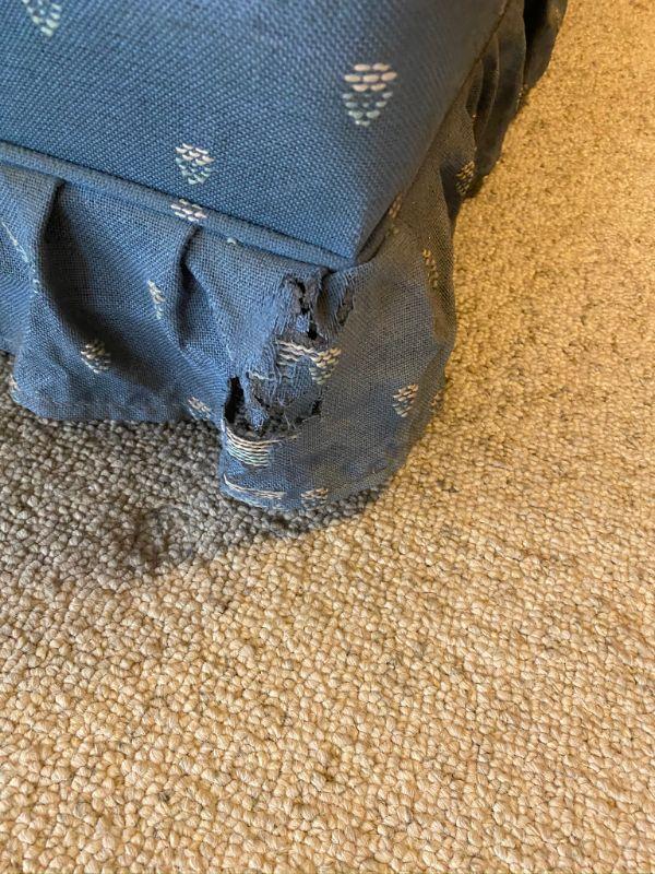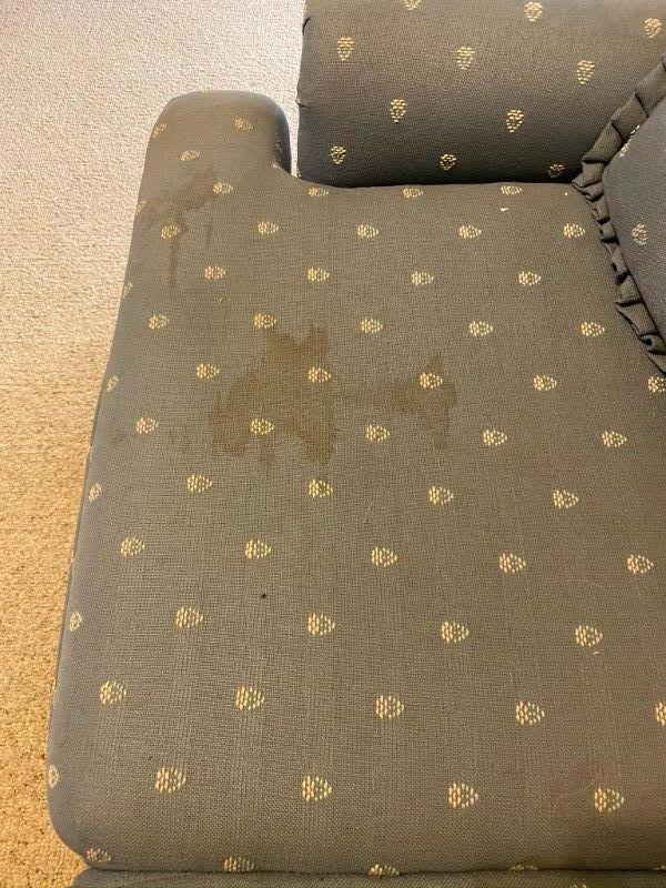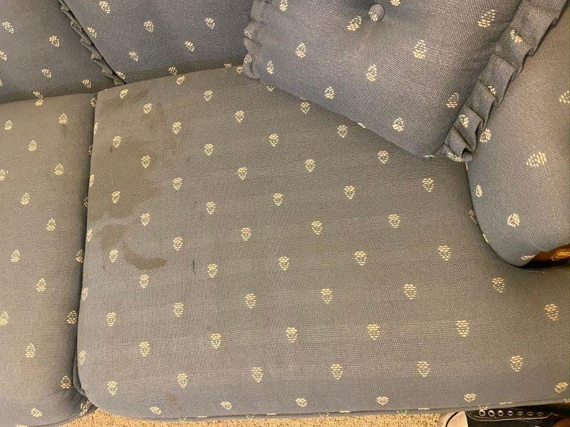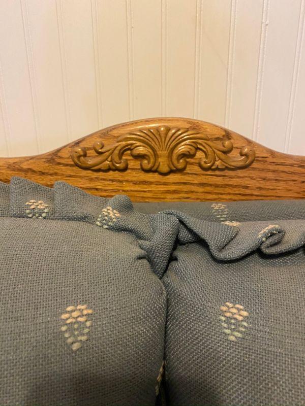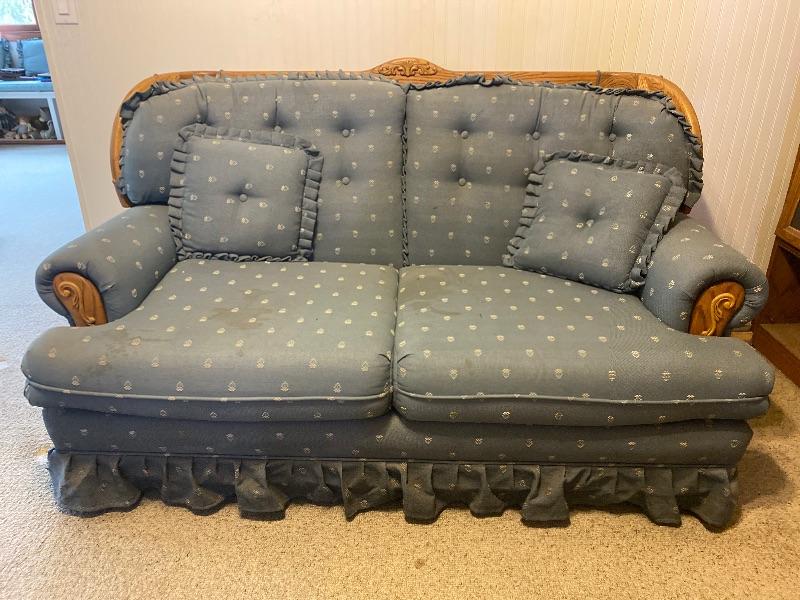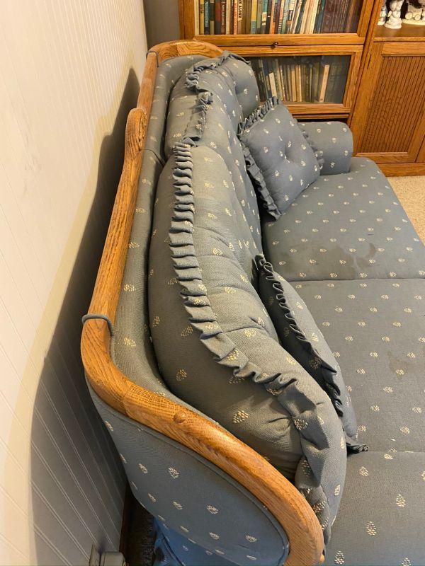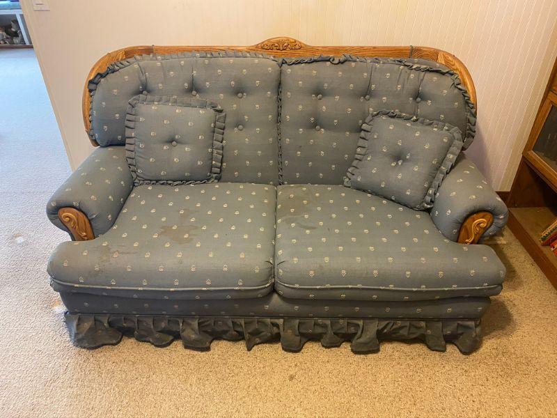 Vintage country blue love seat couch. Measures roughly 60”w. Oak trim around the top. Does have some spots and discoloration, it is also dusty. Not sure how clean it might come.