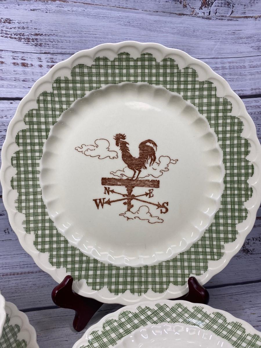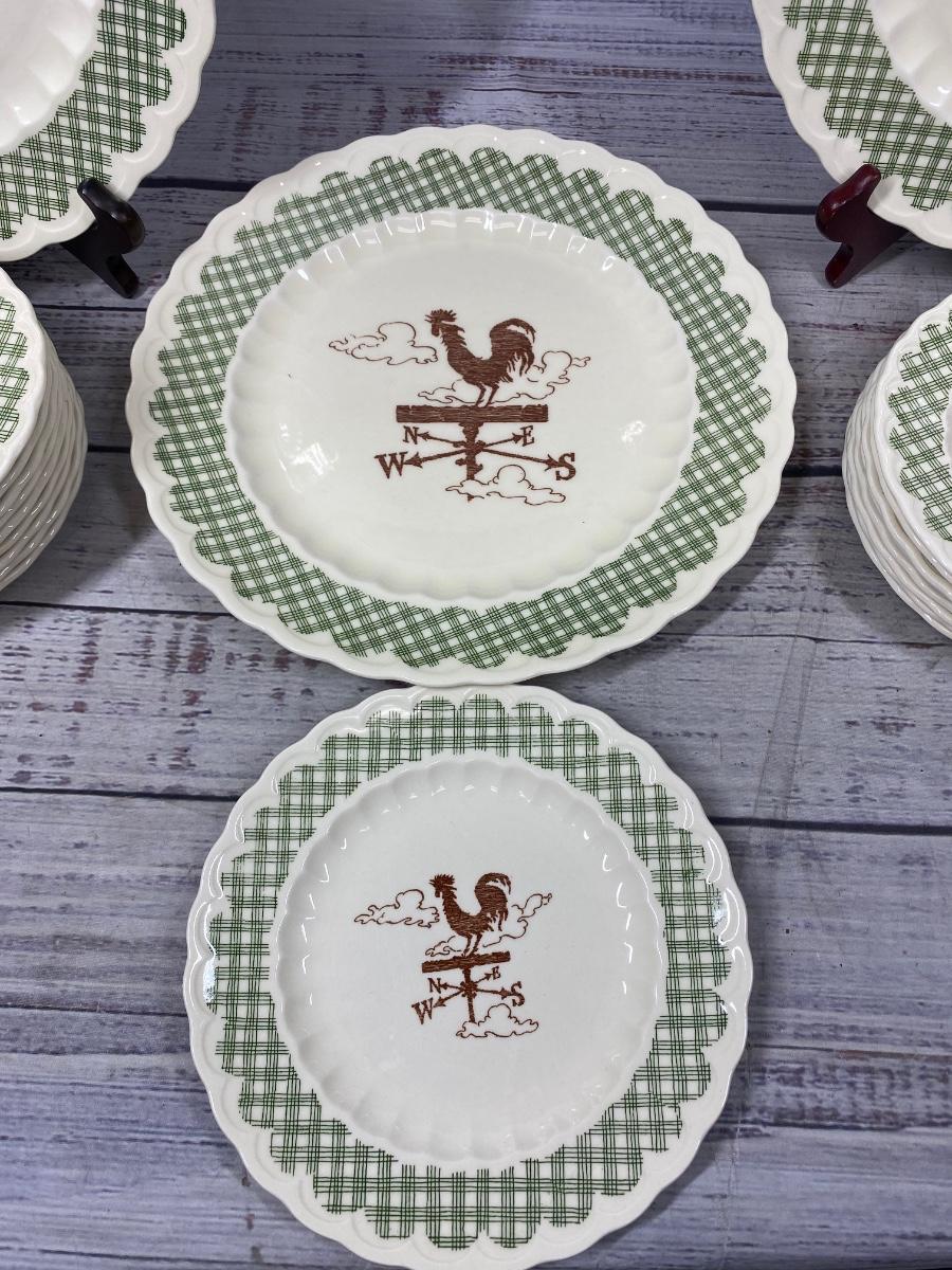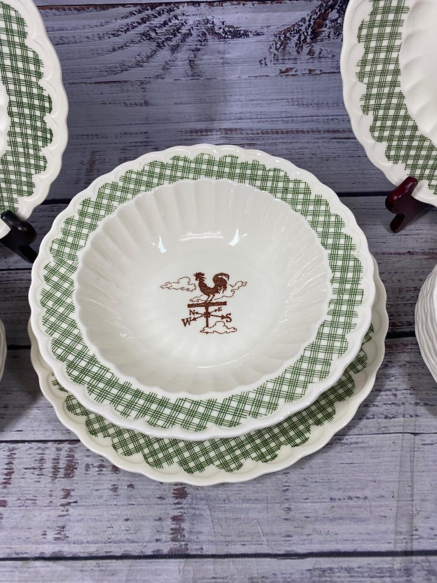 Cute Vernon Kilns RFD Rooster dishware set. Scalloped edge with a green plaid pattern and a rooster weathervane in the center. Mixed set includes 3 dinner plates, 2 small plates, 8 bread plates, a serving bowl, and fruit bowls. All pieces are in good vintage conditions, no chips. May have light discolor from age.