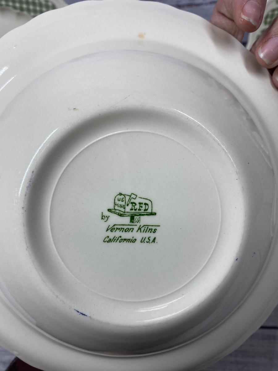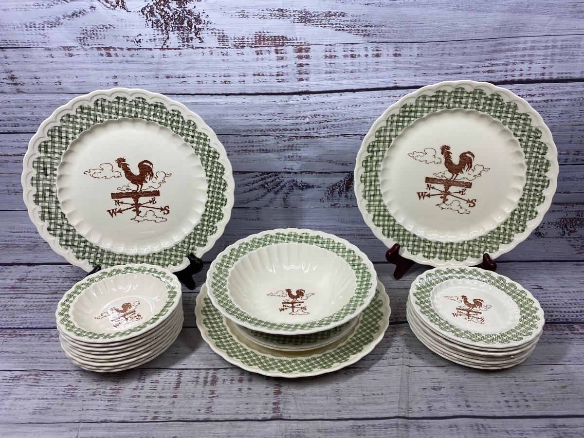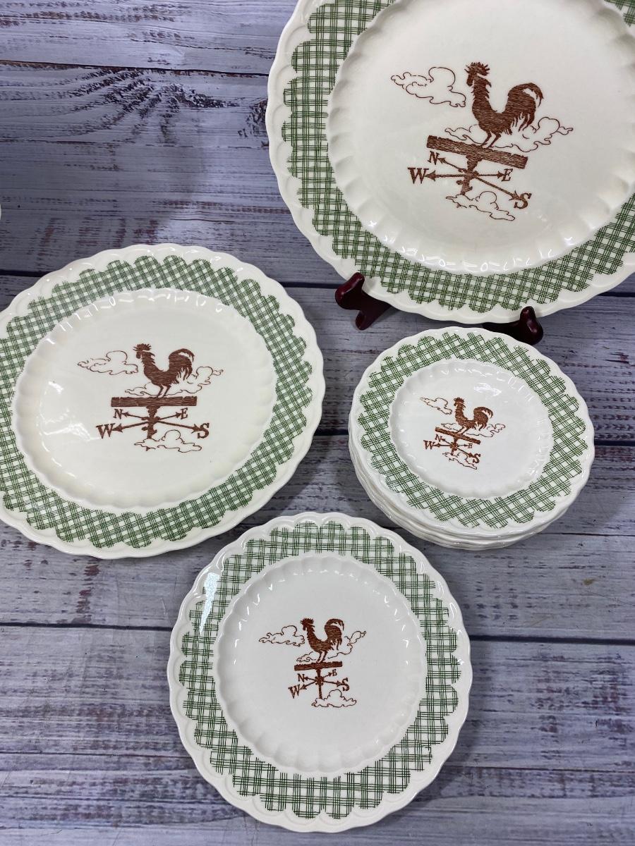 Cute Vernon Kilns RFD Rooster dishware set. Scalloped edge with a green plaid pattern and a rooster weathervane in the center. Mixed set includes 3 dinner plates, 2 small plates, 8 bread plates, a serving bowl, and fruit bowls. All pieces are in good vintage conditions, no chips. May have light discolor from age.