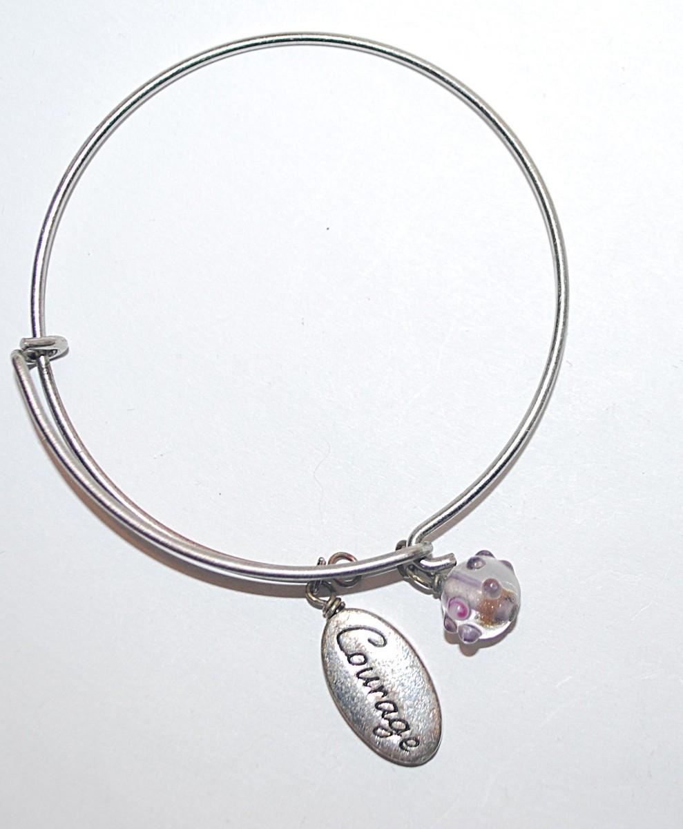 Vintage "COURAGE" BRACELET (2½" Opening) with Silver Tone Oval Charm & Lumpy Acrylic Bead on Curved Hook Closure