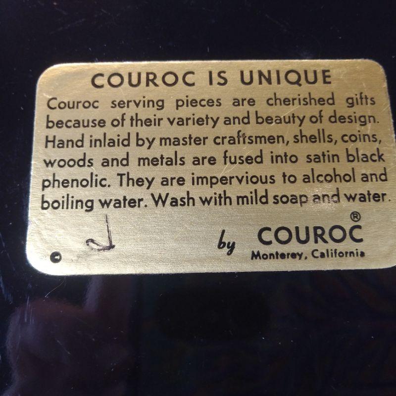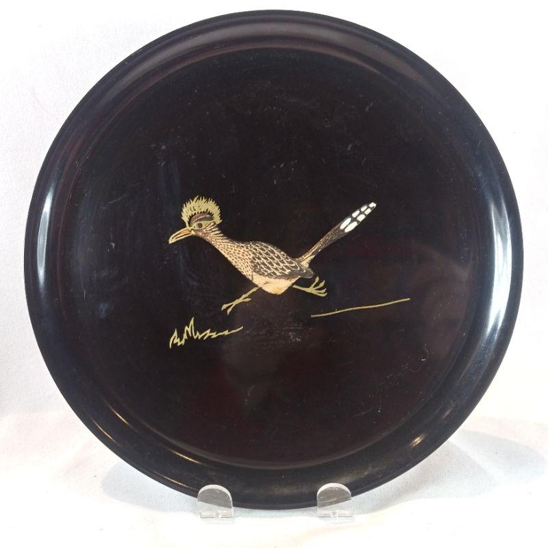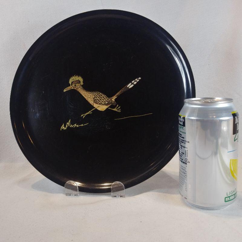 This is a round vintage Couroc "Roadrunner" Black Tray. It was made in Monterey, CA and is 10 1/2-inches in diameter. Wear is consistent with age and use. Overall appears very good with lots of useful life ahead. Very mid-century in look and style.