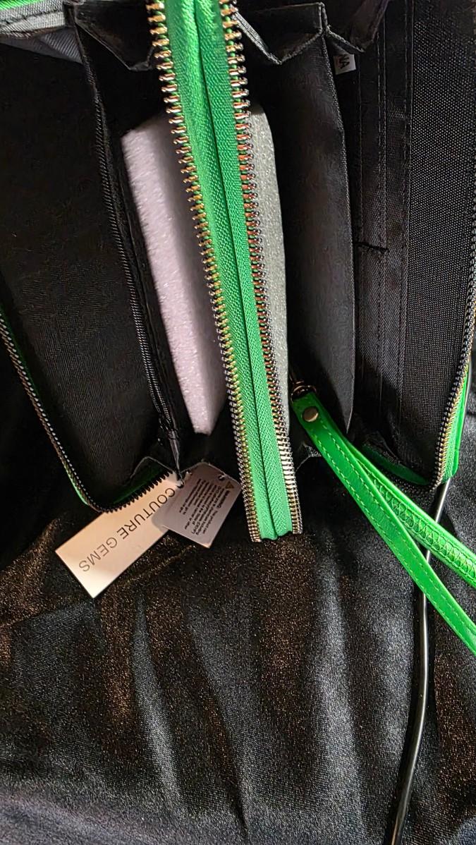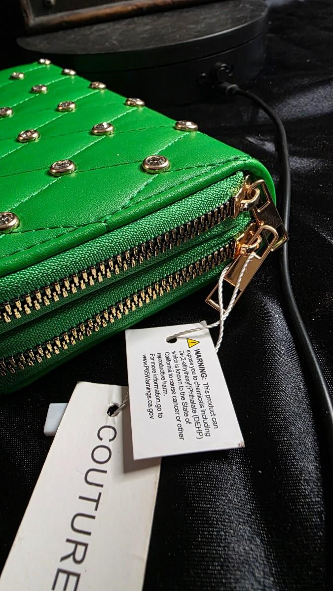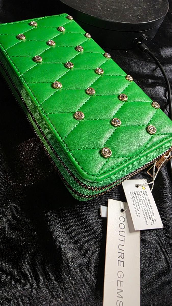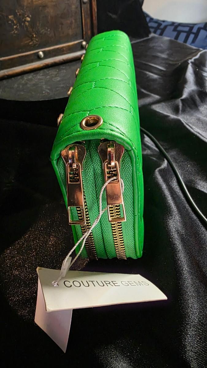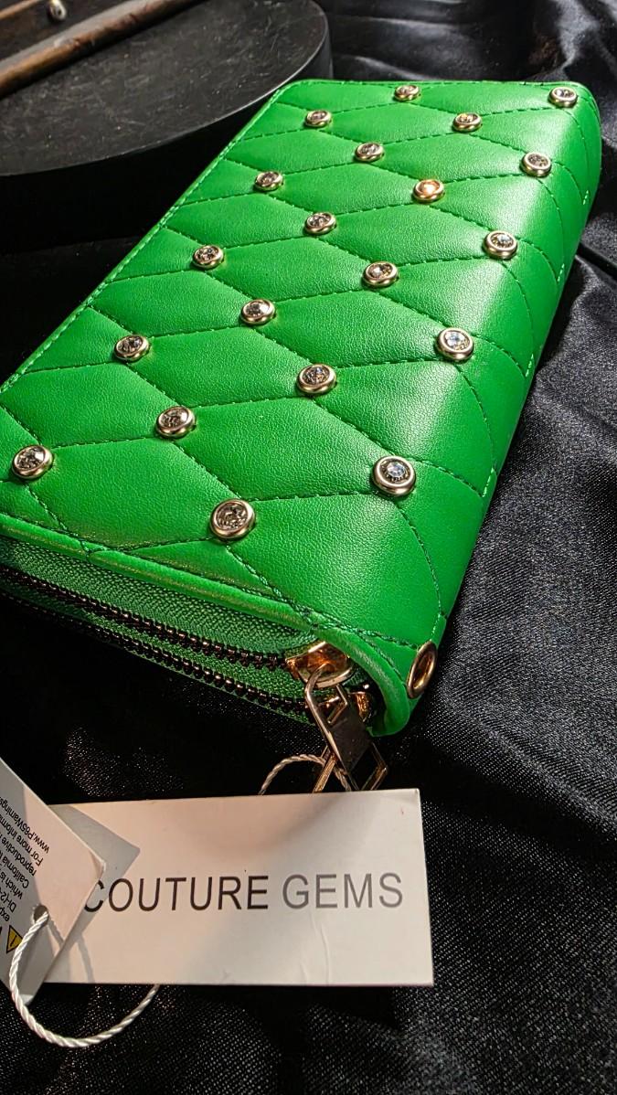 In the electric pulse of a city night, where neon reflects off wet pavement and every glance is a statement, a Couture Gems mini wallet ignites in bold Kelly green—a quilted vegan leather surface stitched in diamond patterns, each intersection crowned with a gleaming gold stud that flashes like streetlights on chrome, the double zipper opening with gold-tone pulls to reveal card slots and a coin pouch lined in black satin, the detachable wrist strap looping like a secret bracelet ready for midnight adventures. The entire piece vibrates with modern edge, the green so vivid it seems to glow from within, turning the simple act of paying into a moment of unapologetic style.