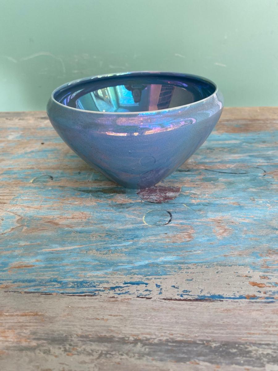 Cowan Pottery Luster bowl #555 . The quality of color is a rich blue/purple and pink depending on the angle and light. Cowin lusster line is prone to scratch, so difficulttofind a piece as PRISTINE. There is no damage. Height 3 1/4" base 3/4", rim 4 3/4