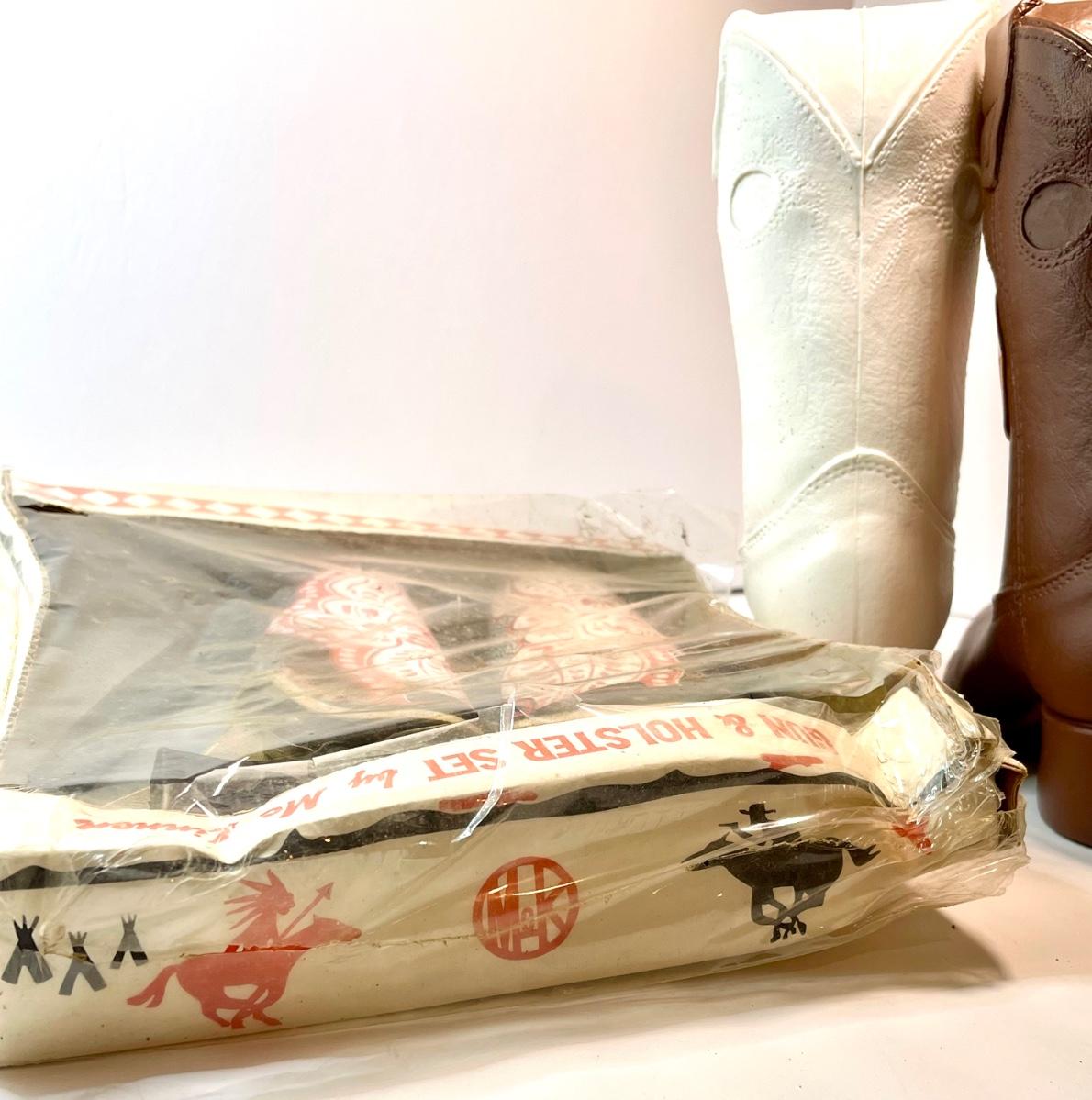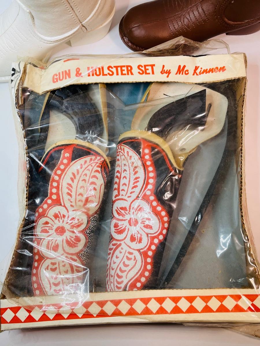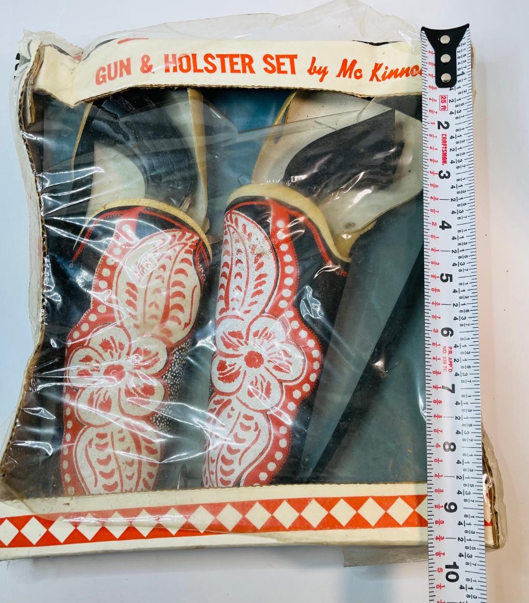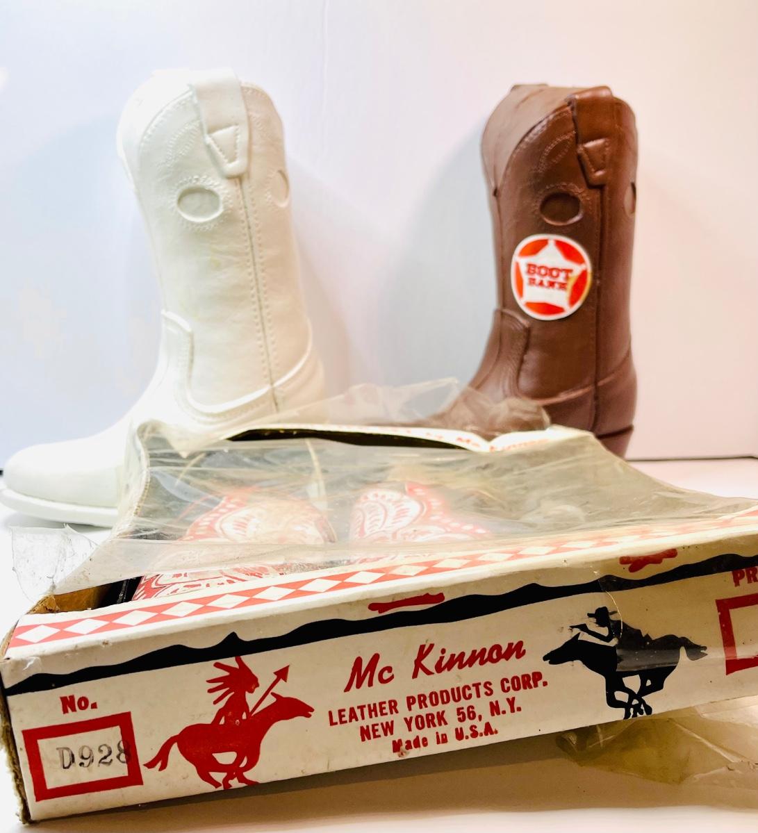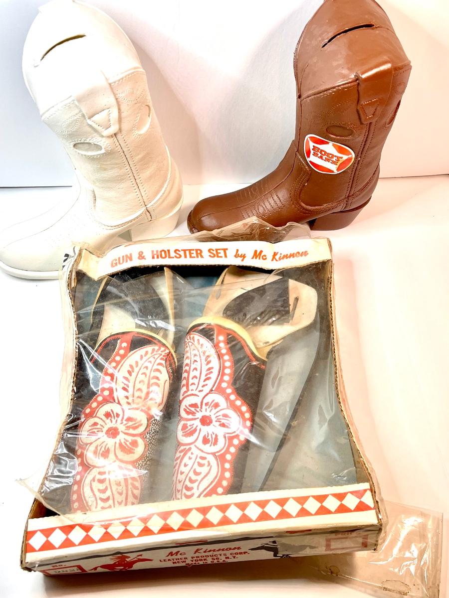 These are such cute Cowboy and Indian pistols! Vintage McKinnon is a great vintage find!! They have dirt and signs of age. Box is somewhat crushed but I decided to leave them in box because the graphics on the box are great! The two boot banks have the stoppers. Super cute lot!