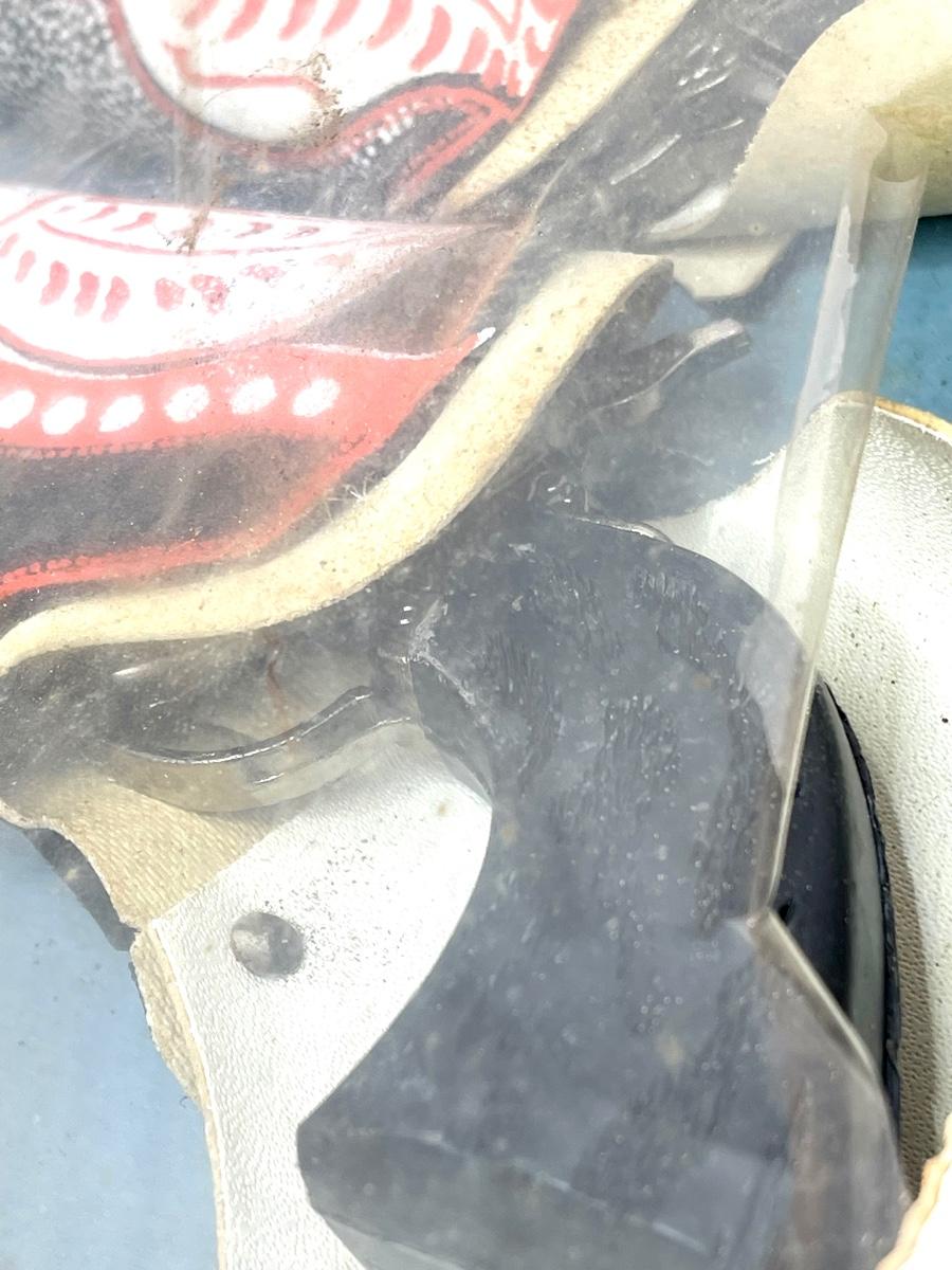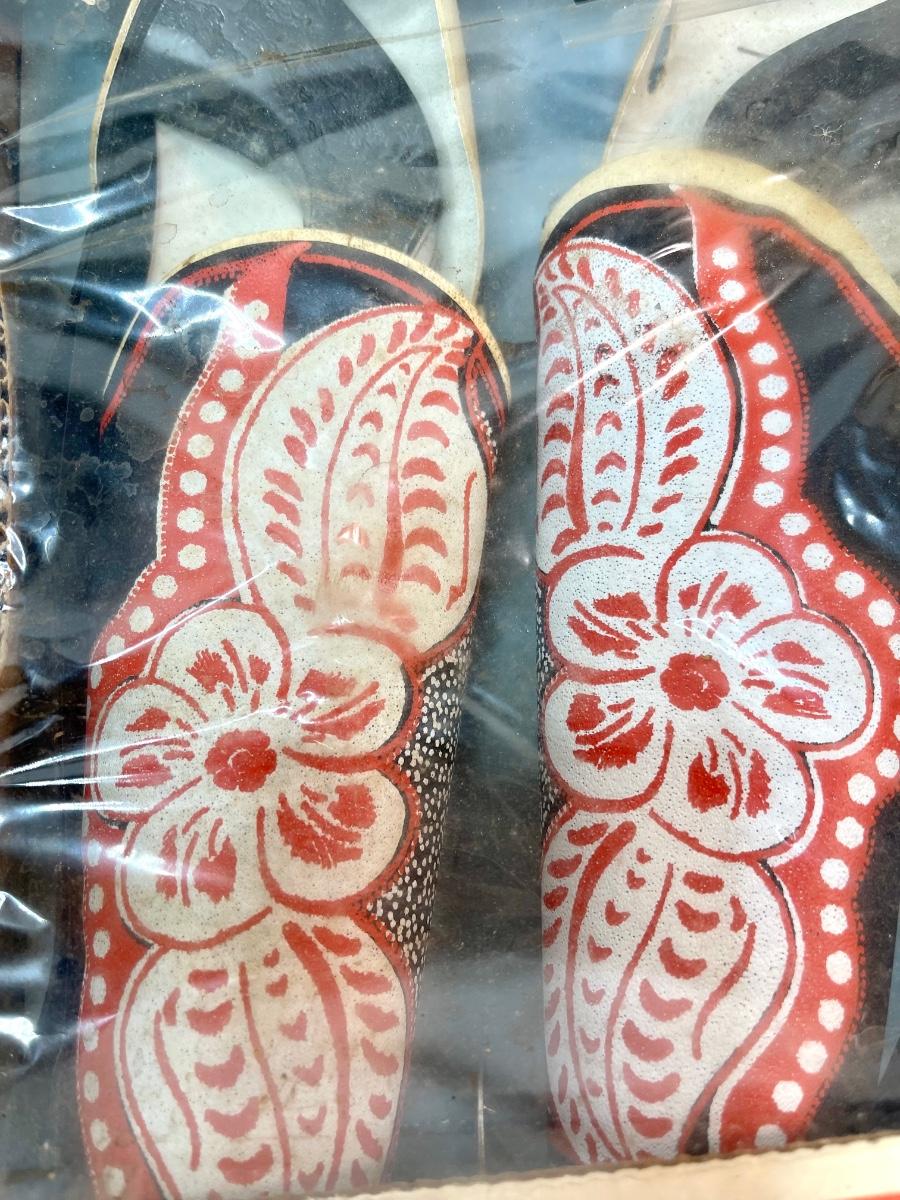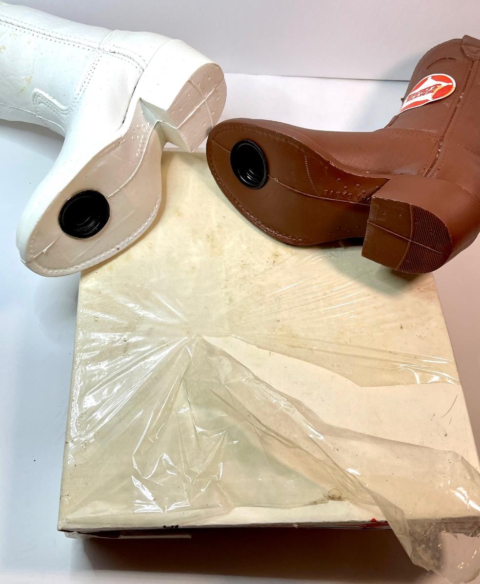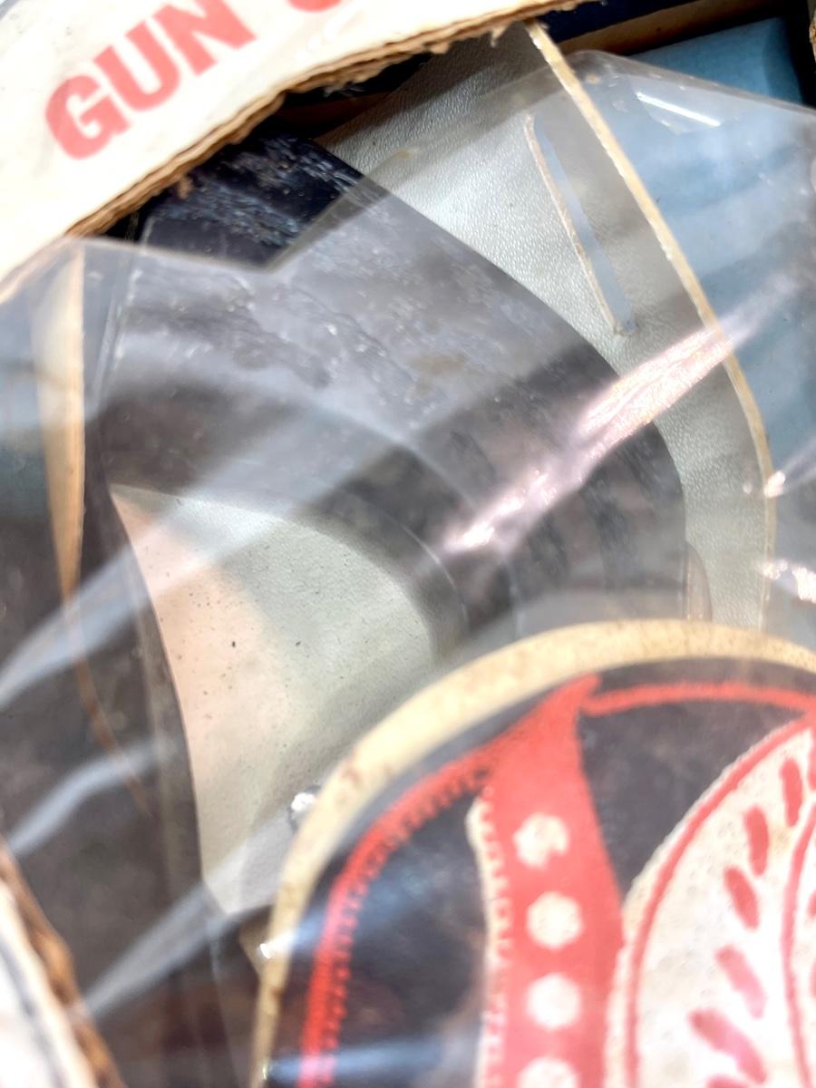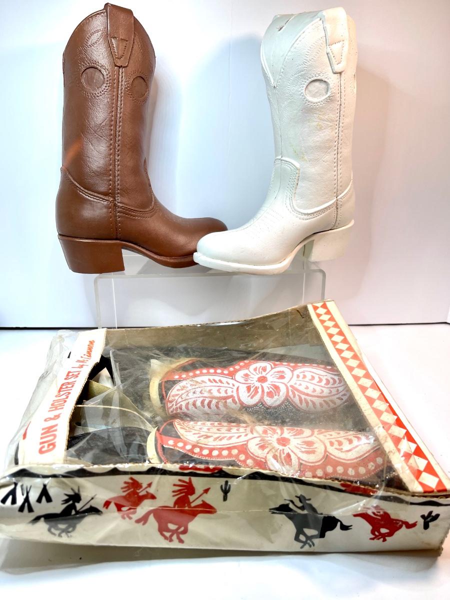 These are such cute Cowboy and Indian pistols! Vintage McKinnon is a great vintage find!! They have dirt and signs of age. Box is somewhat crushed but I decided to leave them in box because the graphics on the box are great! The two boot banks have the stoppers. Super cute lot!