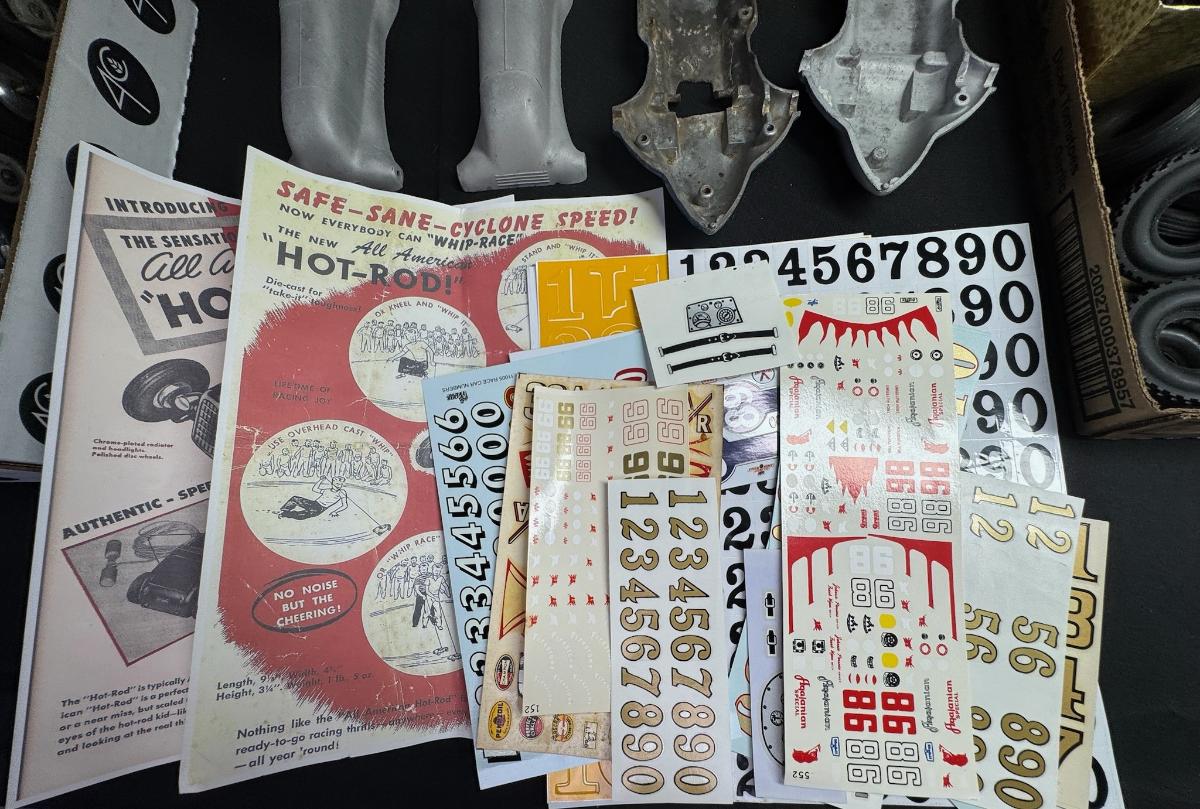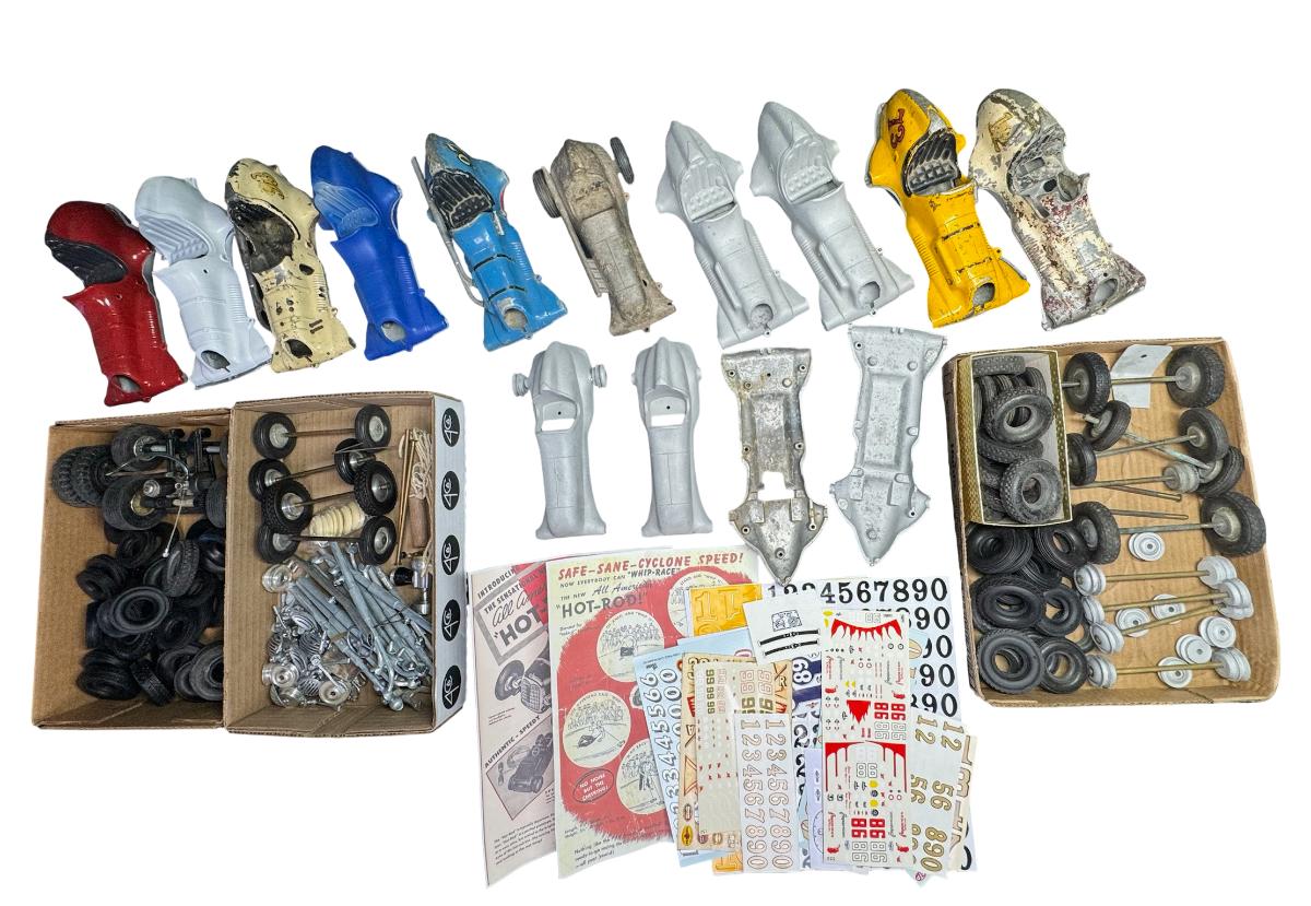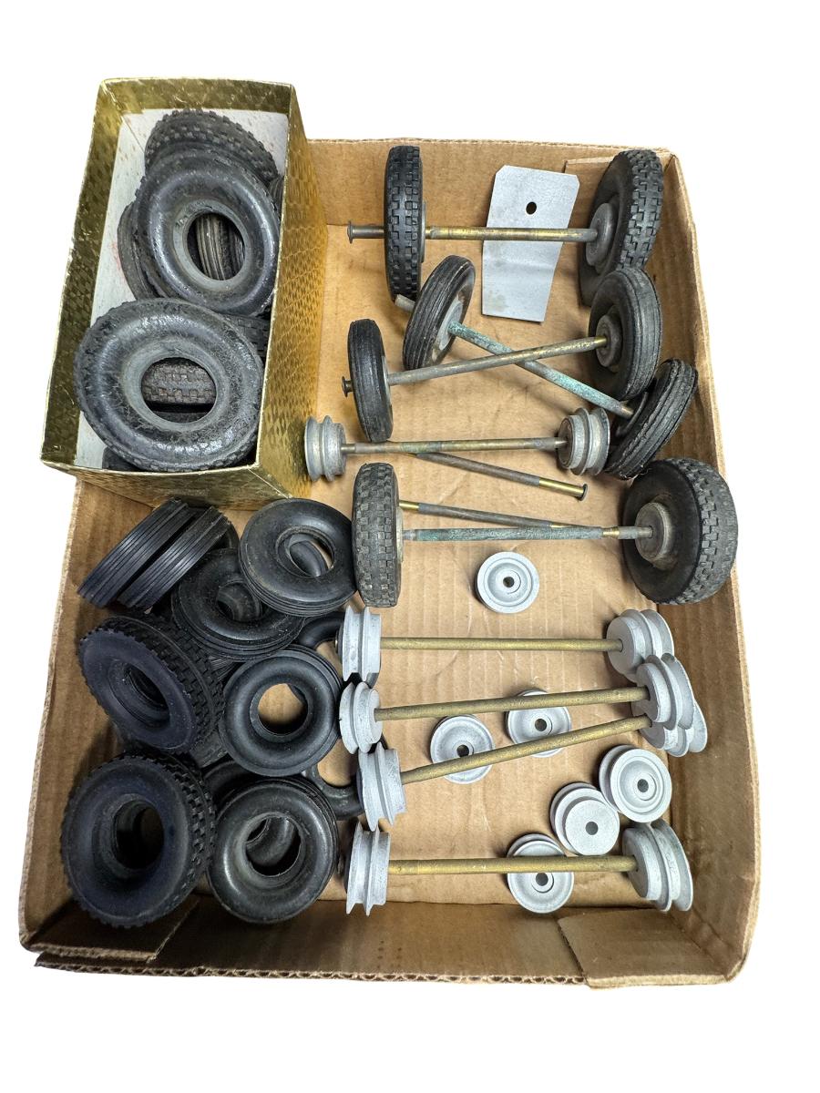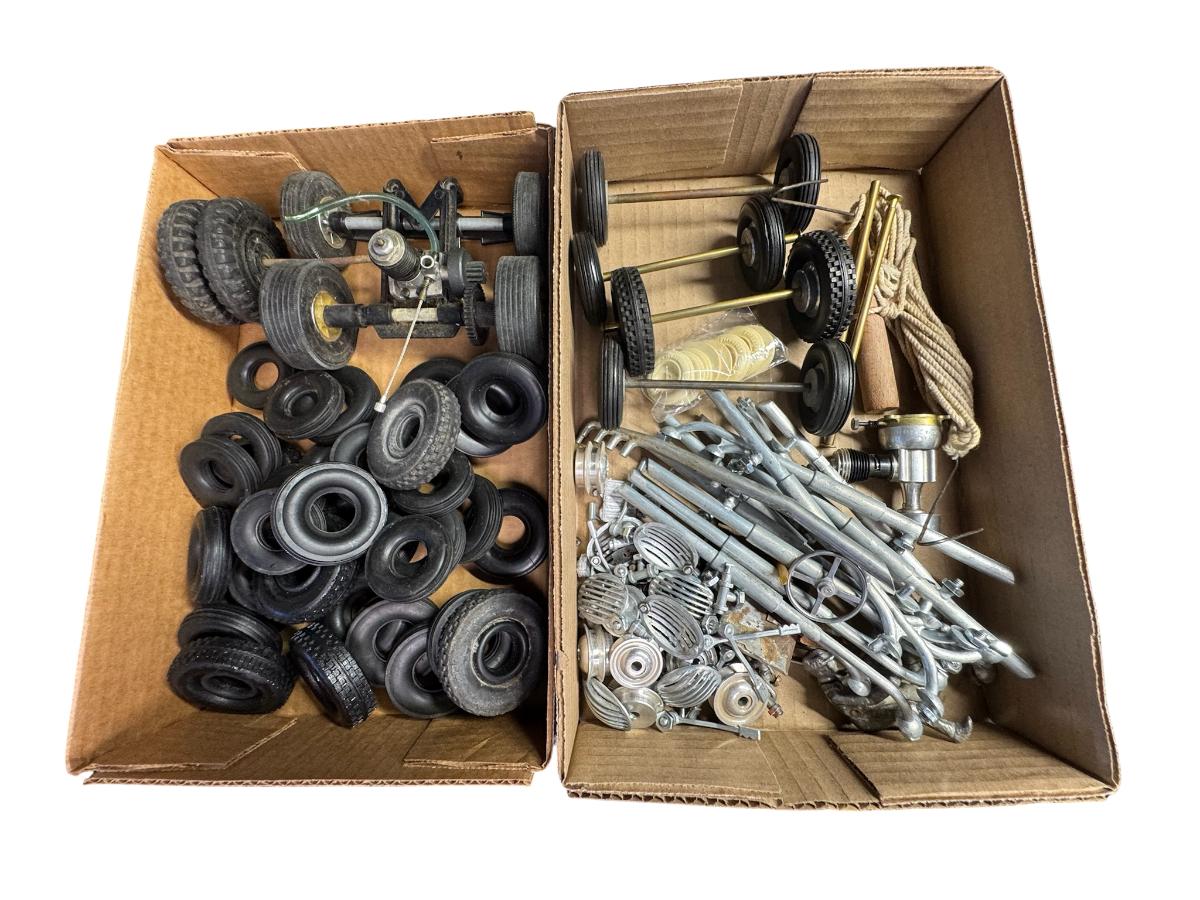 Includes car bodies, loads of solid rubber tires, grills, axles, pipes, and more. Total of 100+ pieces. Some pieces are NOS. There is some paint loss to the cars. [JL]