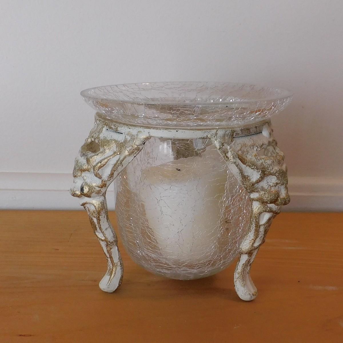 What a unique crackled glass votive candle holder! It has a pretty stand. It is would look fabulous on a mantle. It is about 4" x 3 1/4".