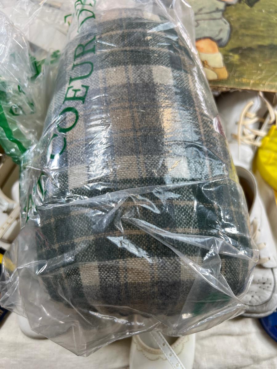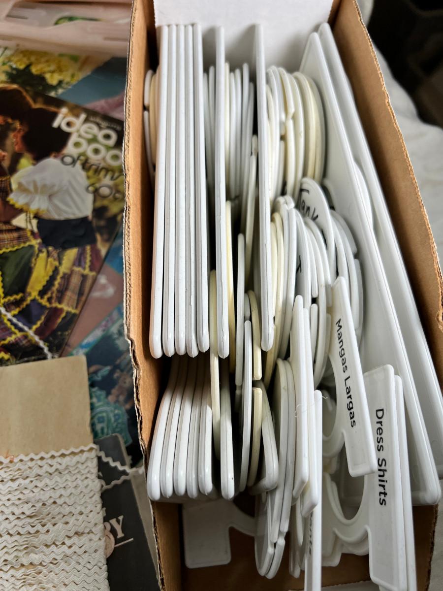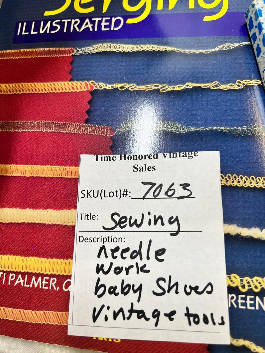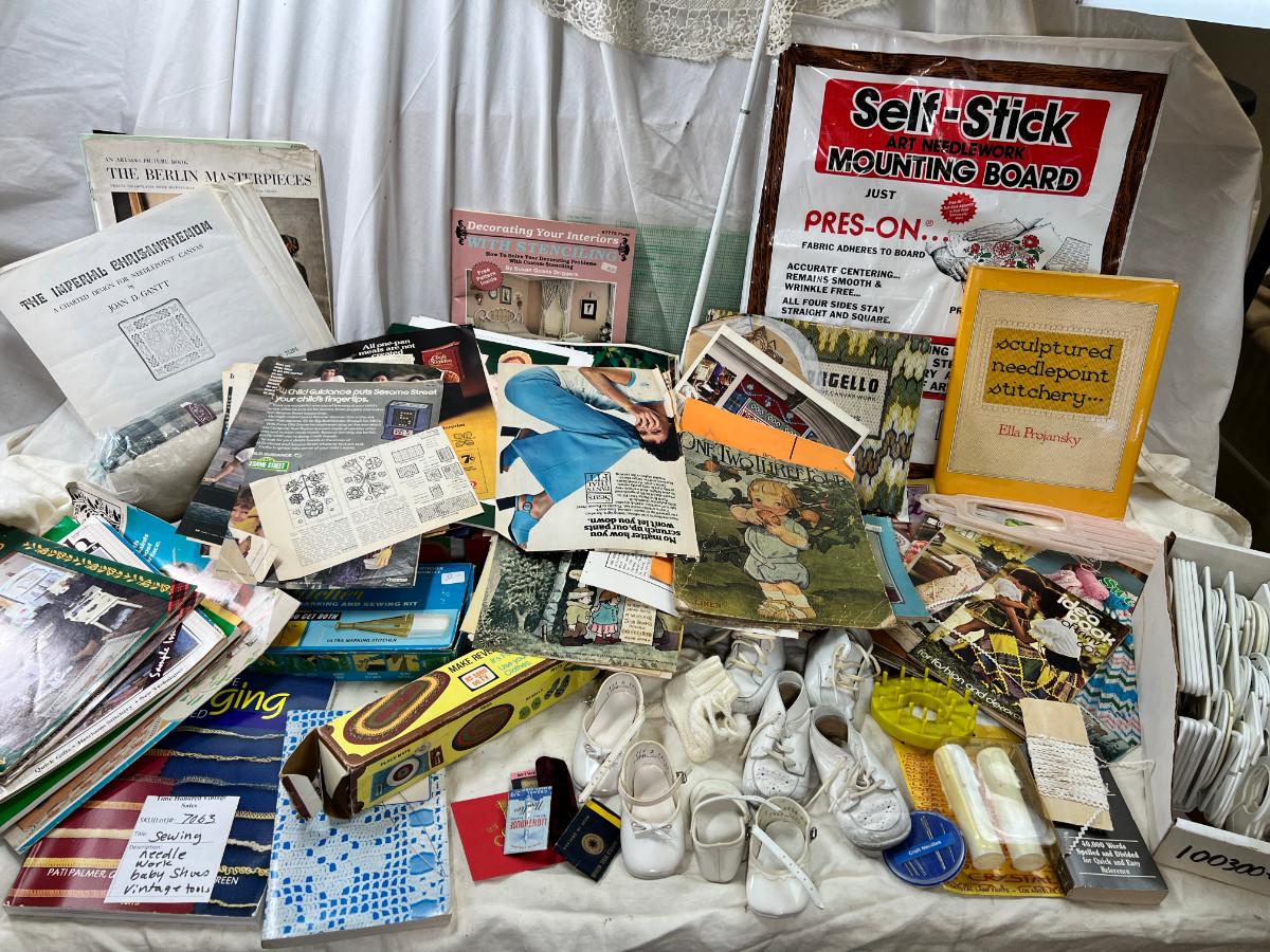 Vintage leather baby shoes, lots of vintage magazine ephemera, books, set of closet organizers. Wool sewing ham for pressing.