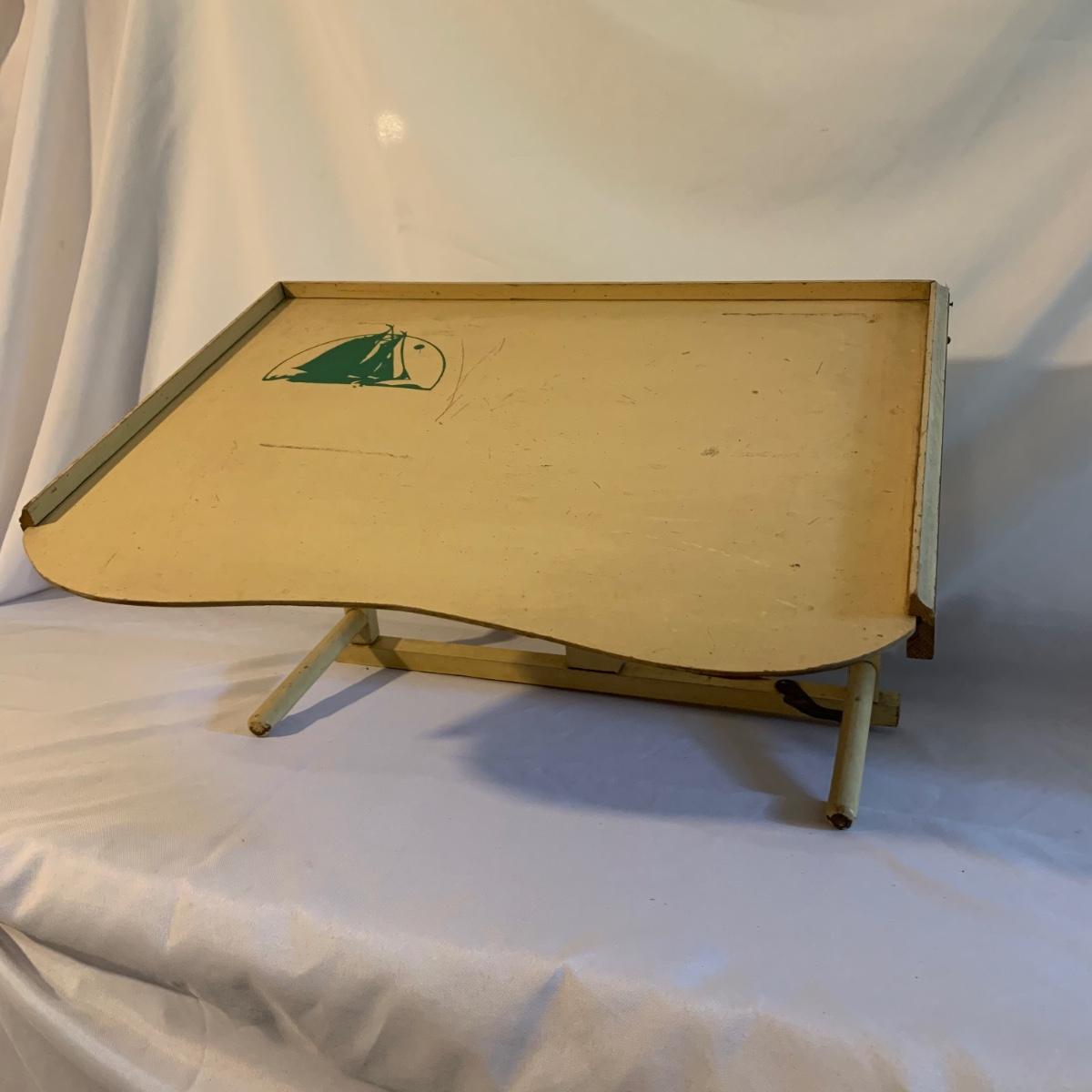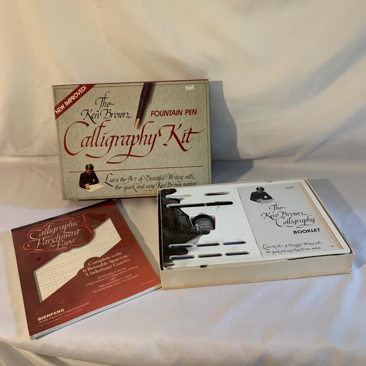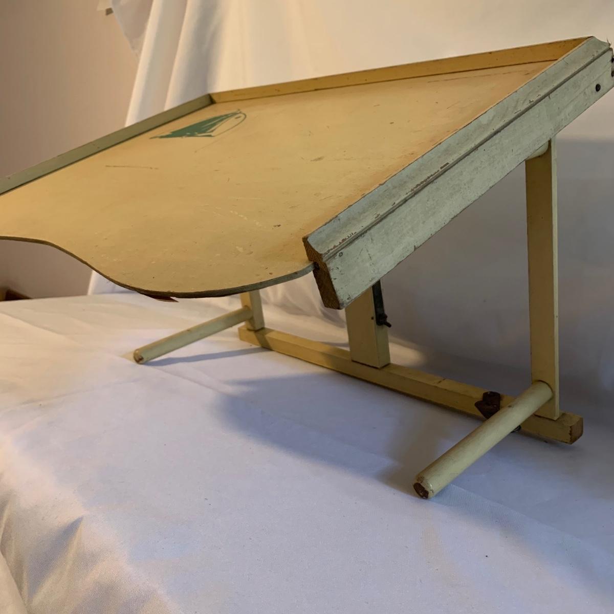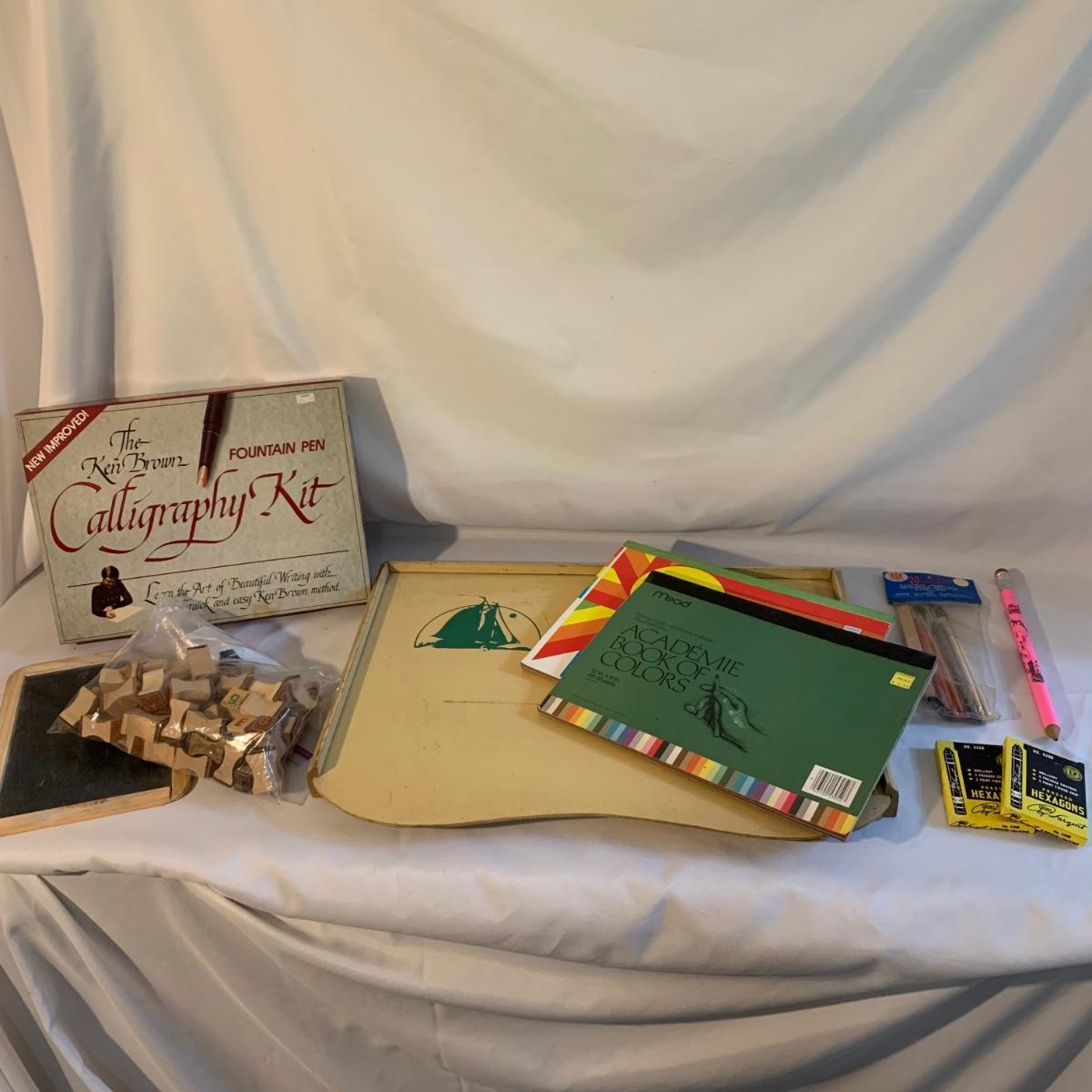 This lot includes vintage tools and supplies for different crafts and art. A drawing desk, a calligraphy set, paint brushes, stamps, coloring books, and more are included. Conditions for pieces in this lot range from fair to good with some items having marks and wear. The desk measures about 15in x 21in when folded. Shipping available.