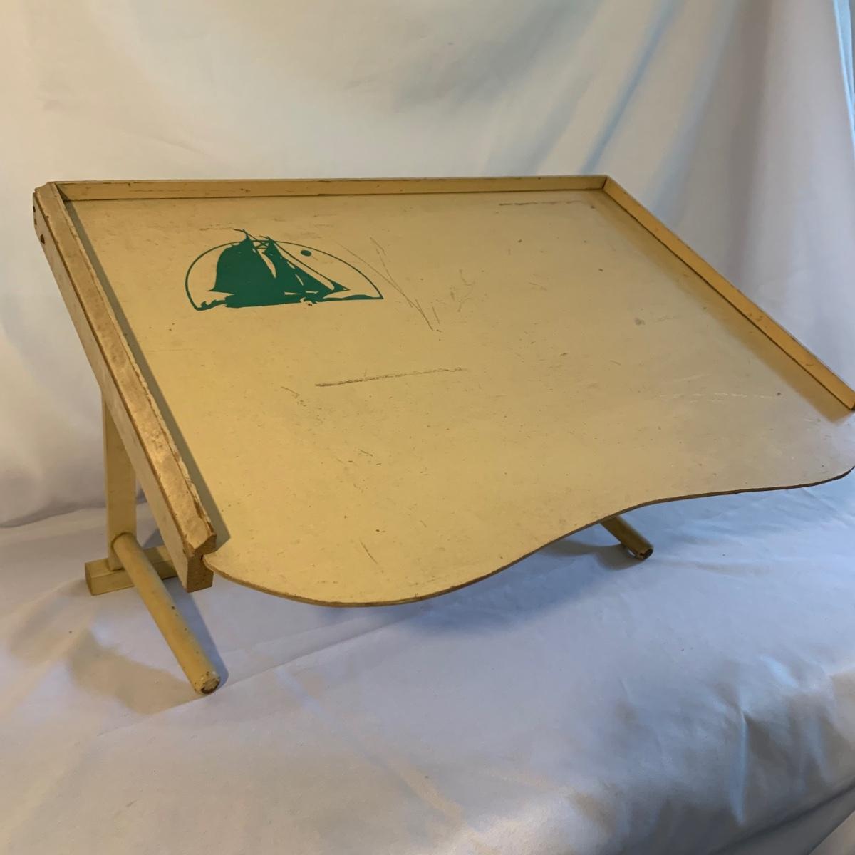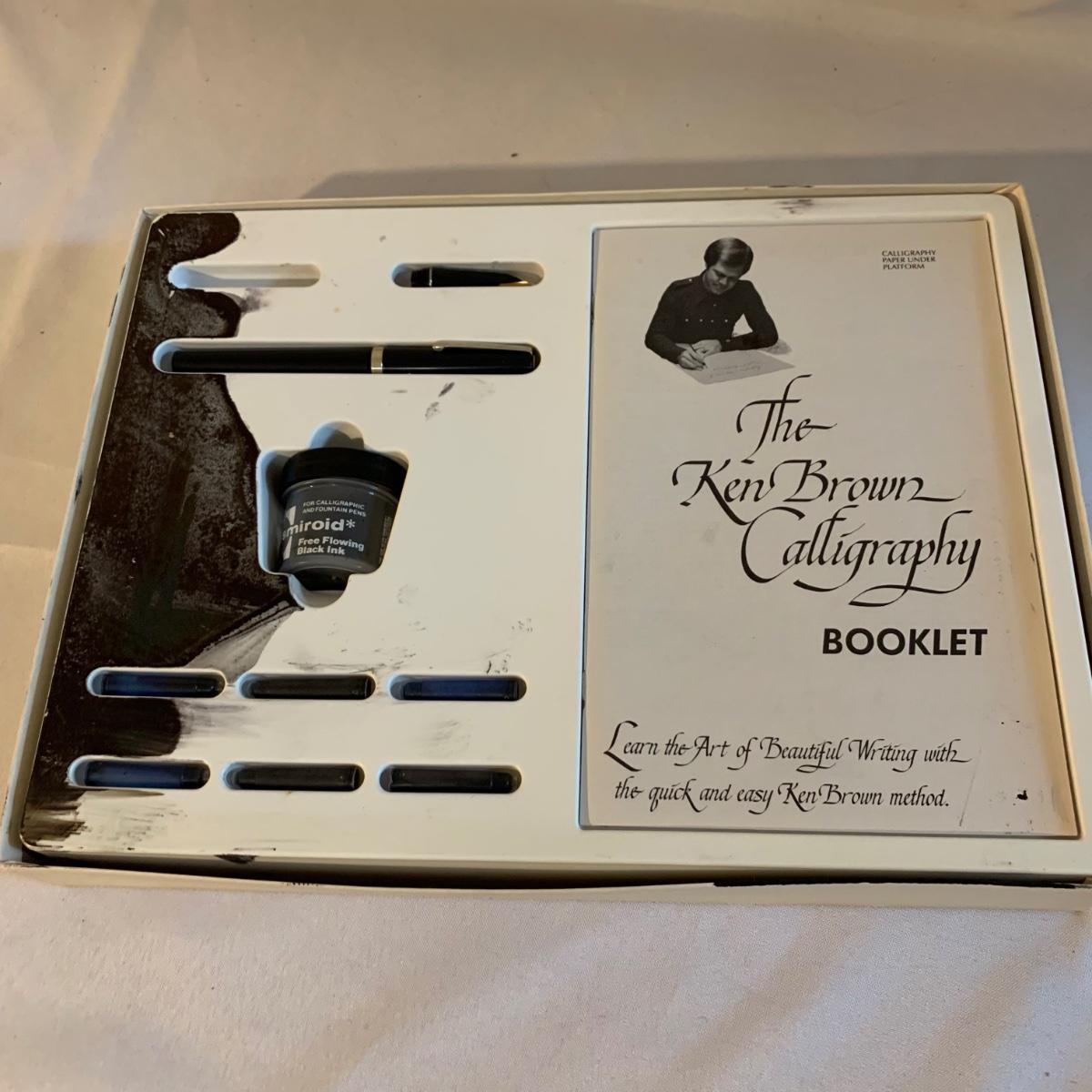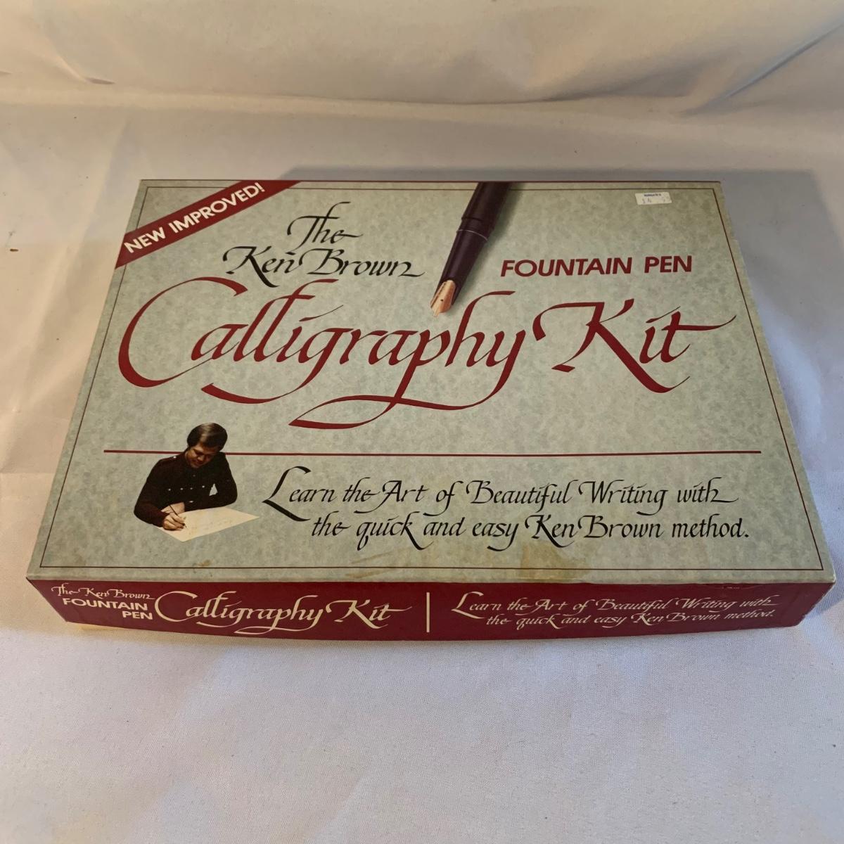 This lot includes vintage tools and supplies for different crafts and art. A drawing desk, a calligraphy set, paint brushes, stamps, coloring books, and more are included. Conditions for pieces in this lot range from fair to good with some items having marks and wear. The desk measures about 15in x 21in when folded. Shipping available.