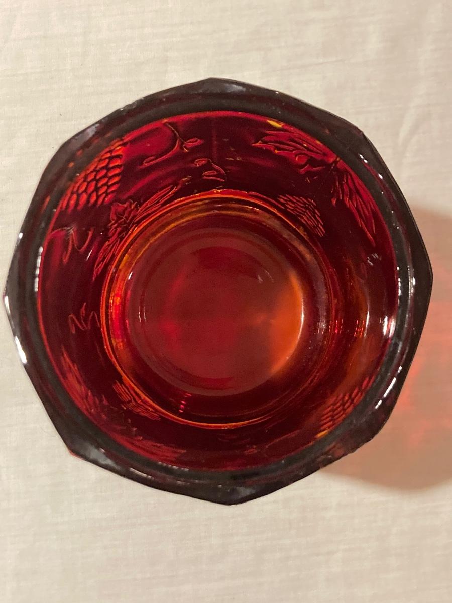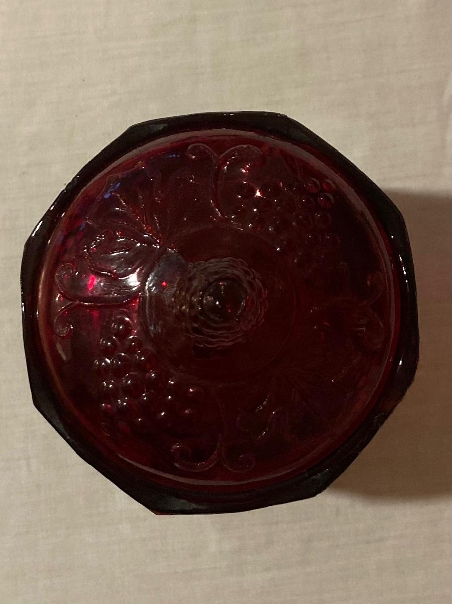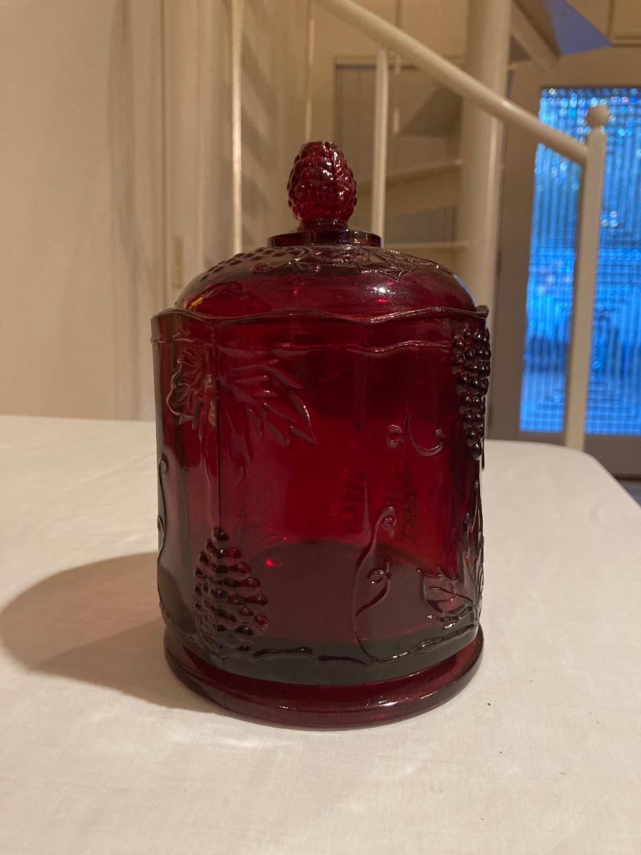 Vintage cranberry depression glass biscuit jar with lid VG condition 8 tall 5 diameter