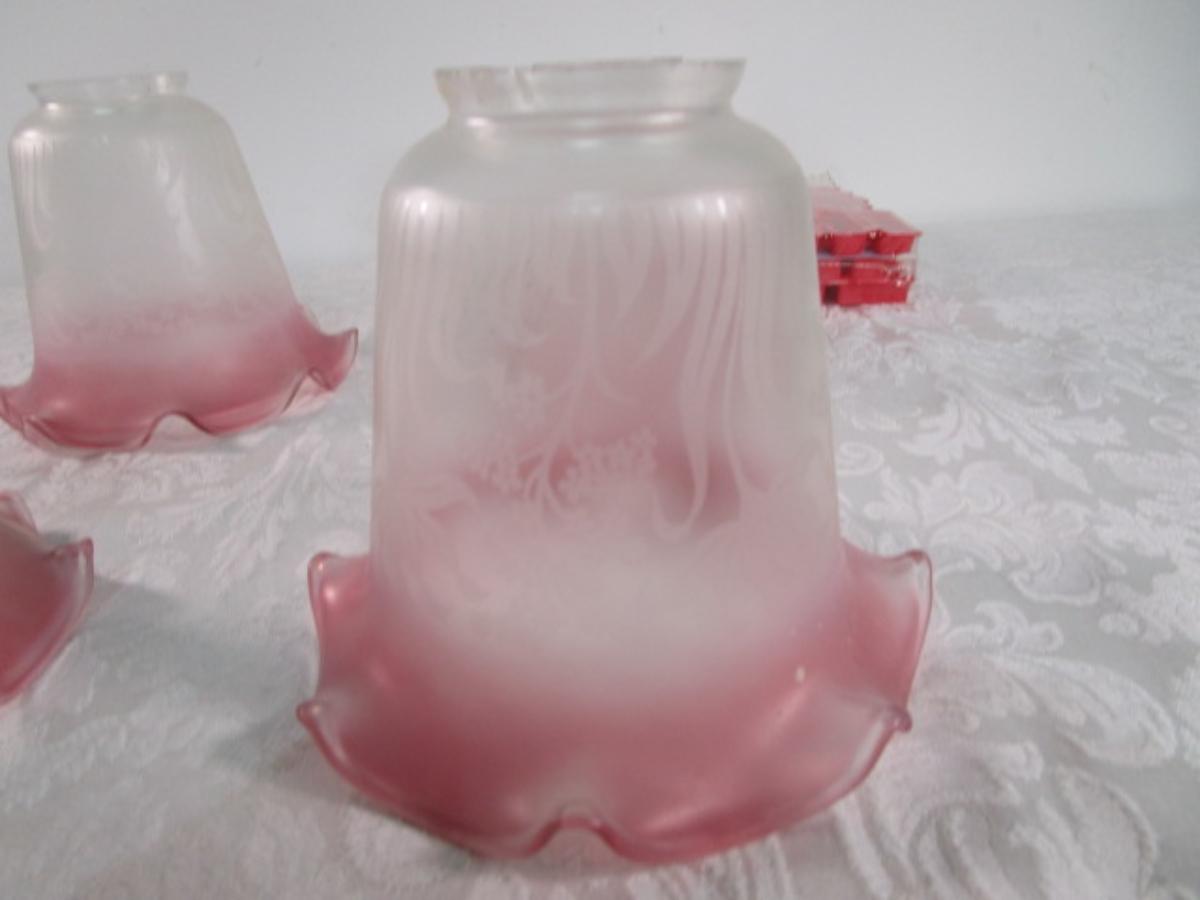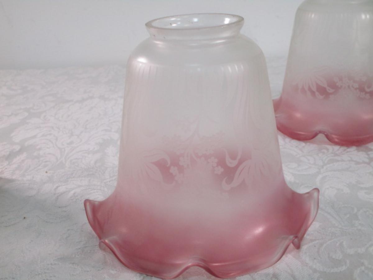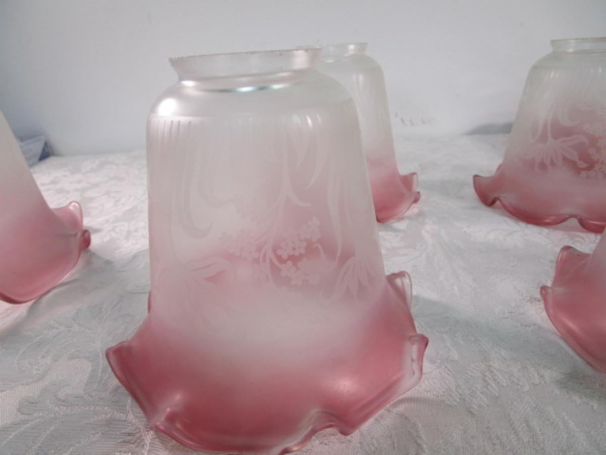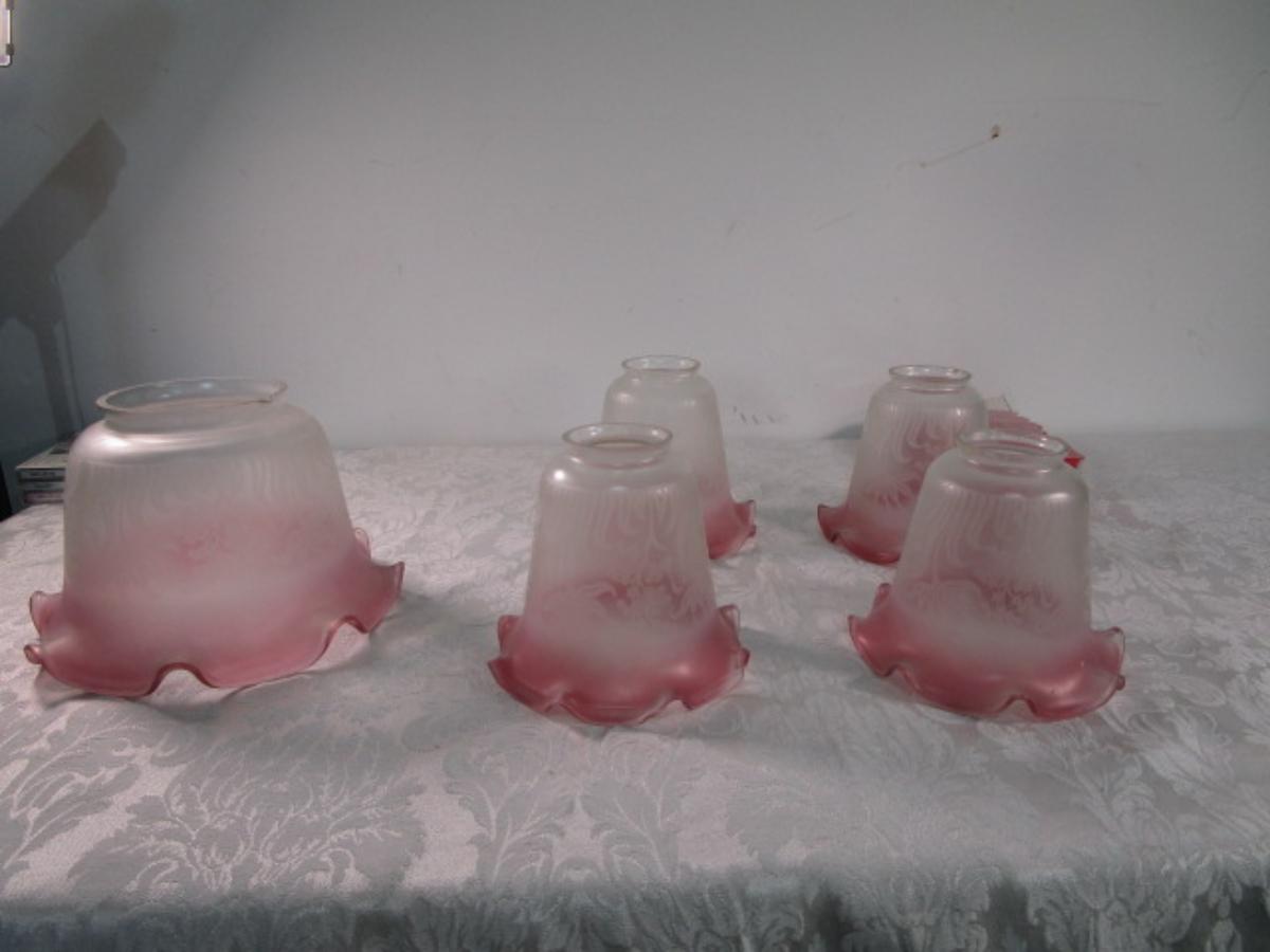 One large shade is 3-3/4" across on foot 5-3/4" tall, frosted & etched design, Four smaller shades are 5-1/4" tall x 2" across on the foot, see pictures
