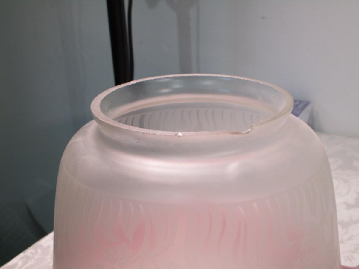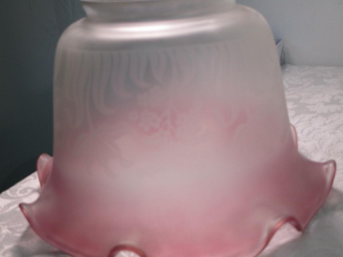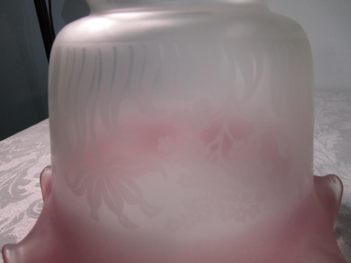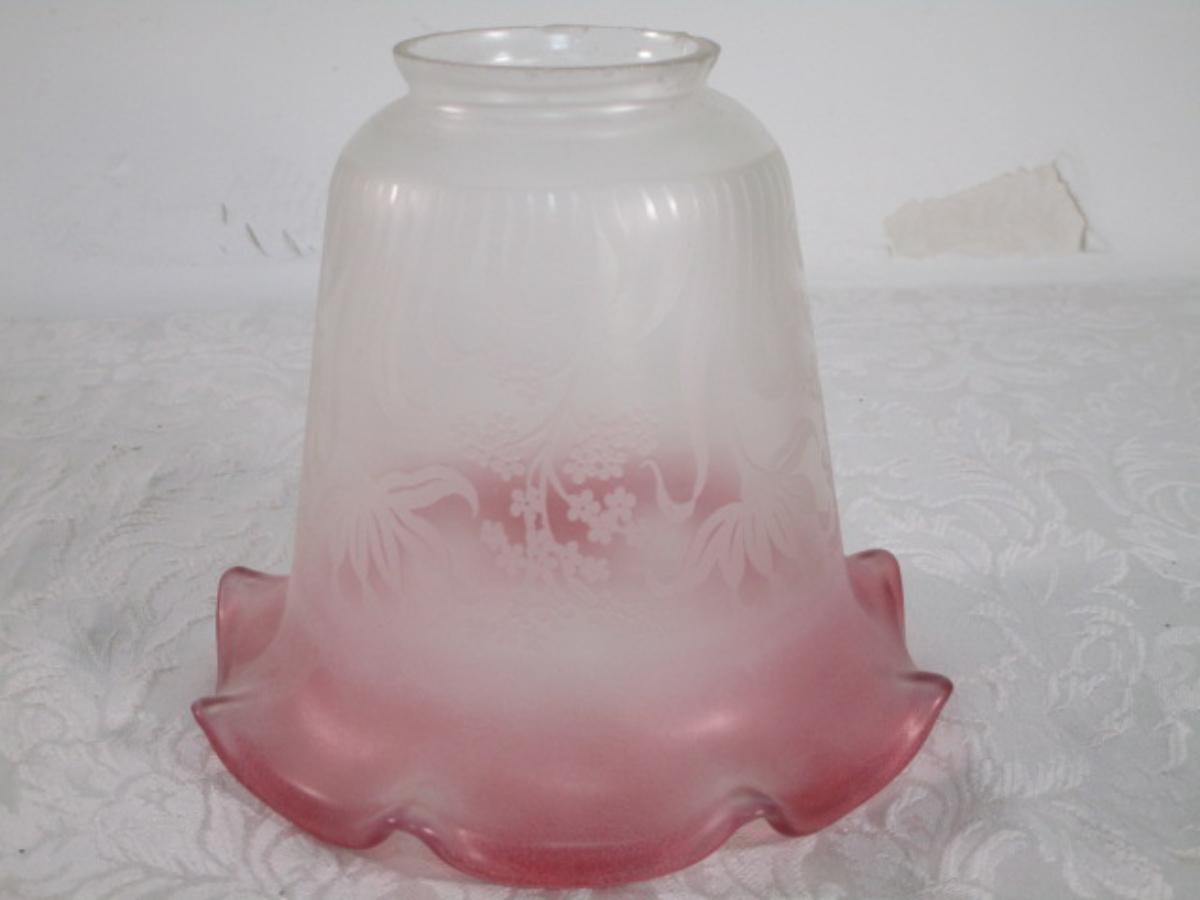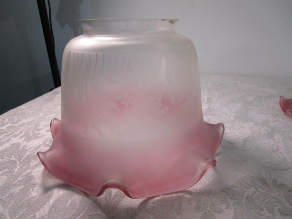 One large shade is 3-3/4" across on foot 5-3/4" tall, frosted & etched design, Four smaller shades are 5-1/4" tall x 2" across on the foot, see pictures