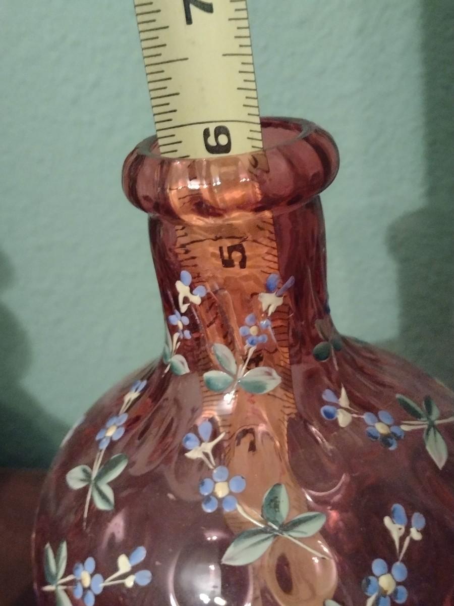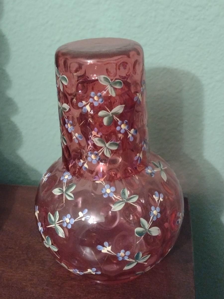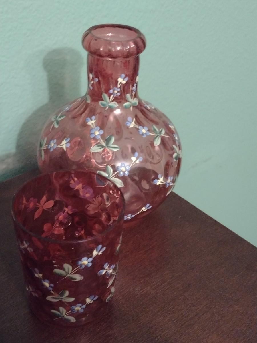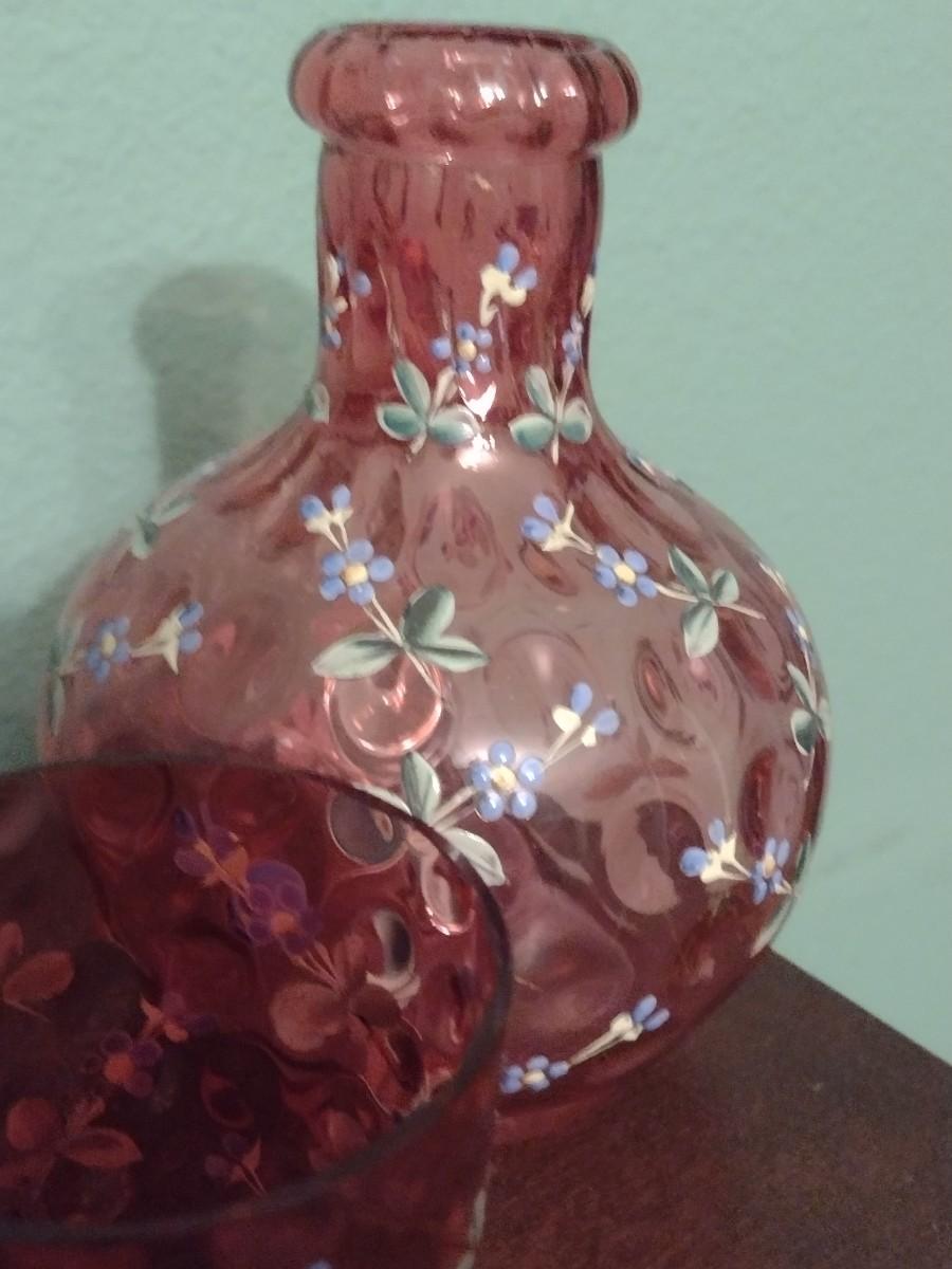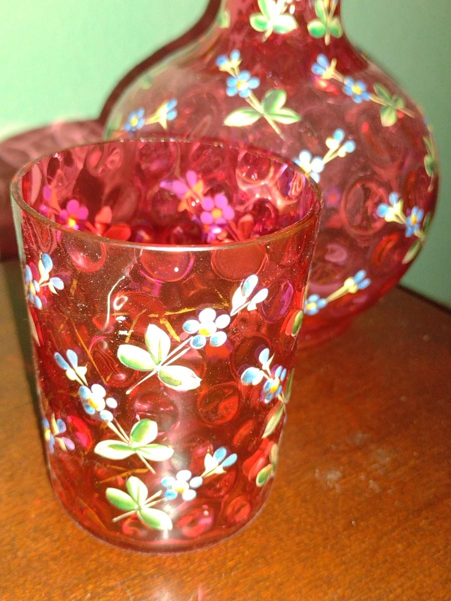 Vintage Cranberry Hand Painted Glass Decanter and Drinking Glass