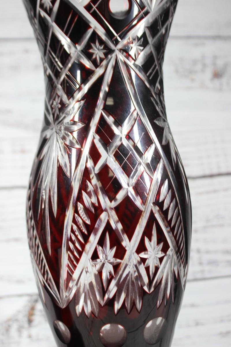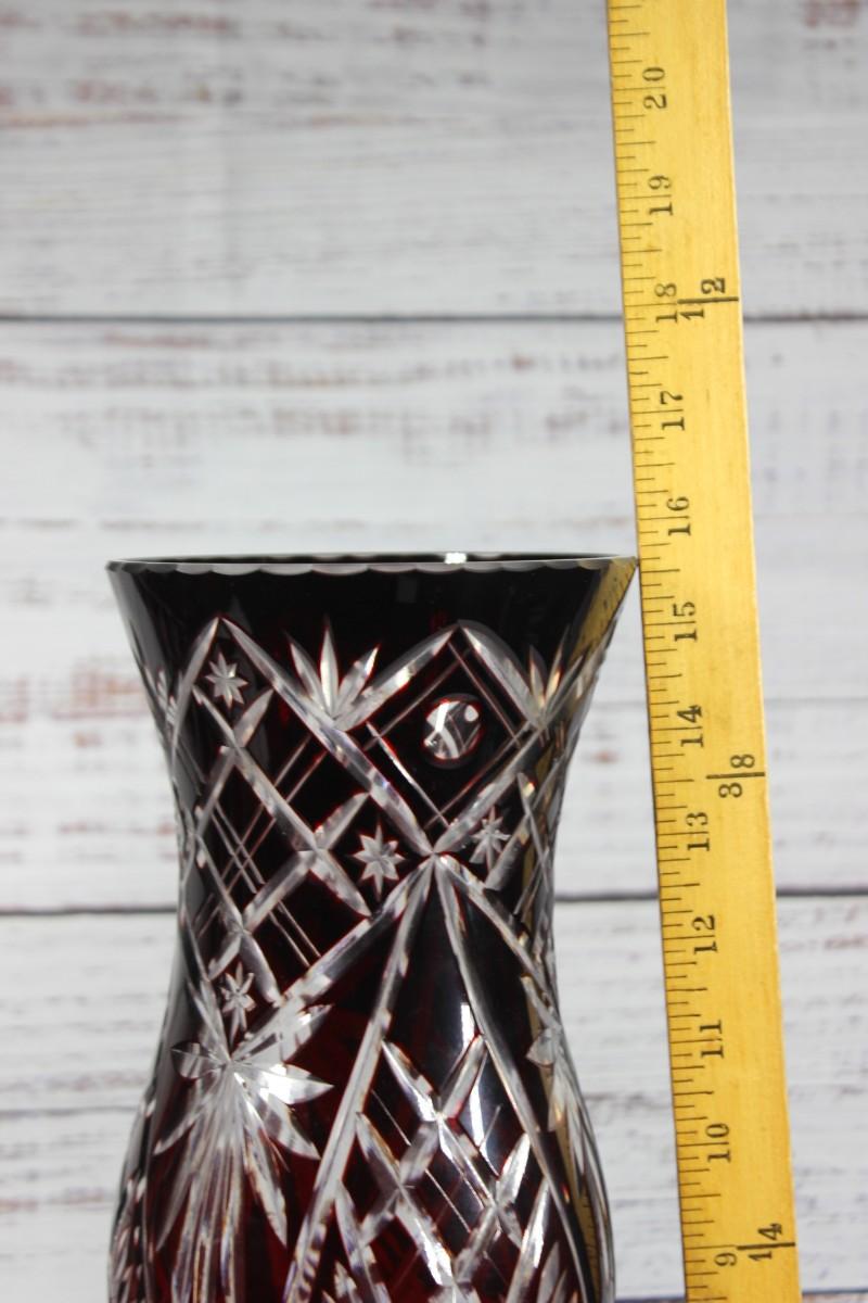 Beautiful dark cranberry cut to clear crystal hurricane style candle holders. Would also work as vases. Slight variation in cut and size, handmade. About 16" tall. No chips or damage noticed.