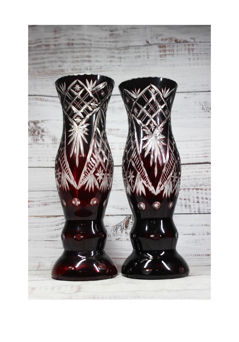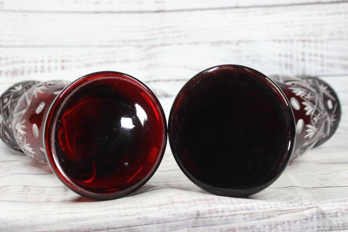 Vintage Cranberry Red Cut to Clear Bohemian Czech Glass Hurricane Vase Candle Holder Pair