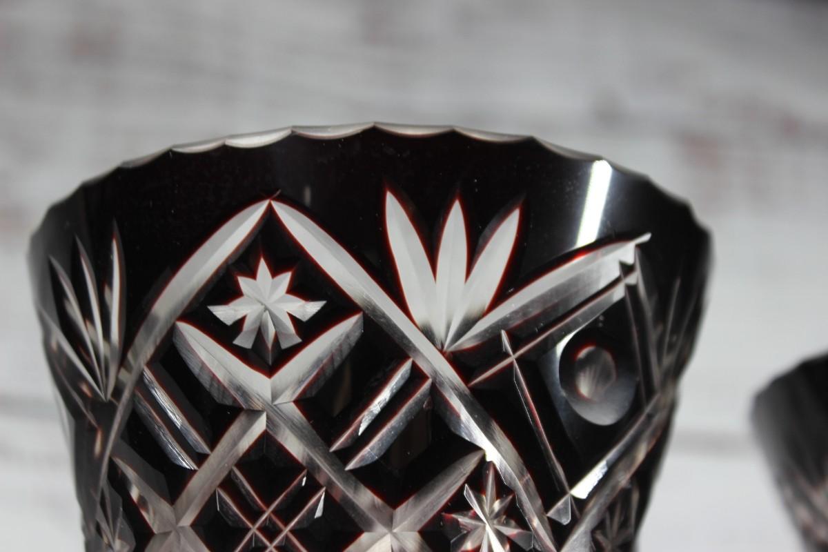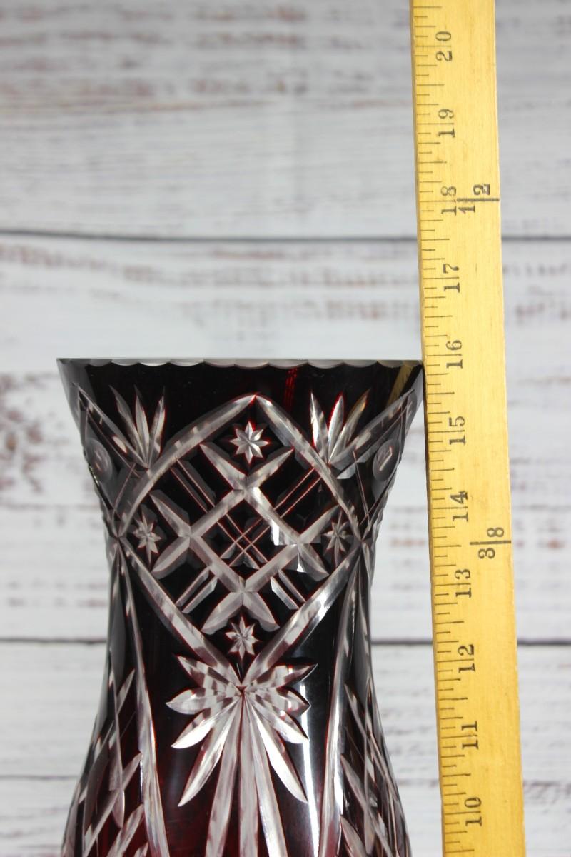 Beautiful dark cranberry cut to clear crystal hurricane style candle holders. Would also work as vases. Slight variation in cut and size, handmade. About 16" tall. No chips or damage noticed.
