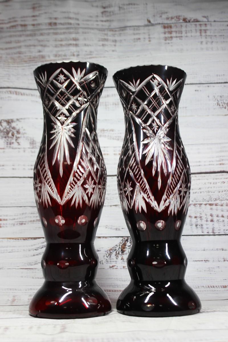 Vintage Cranberry Red Cut to Clear Bohemian Czech Glass Hurricane Vase Candle Holder Pair