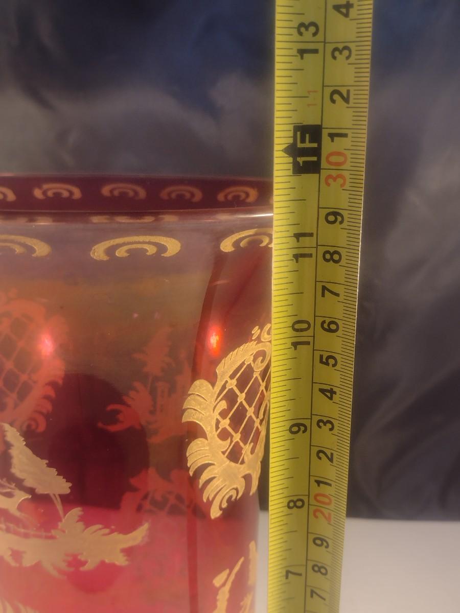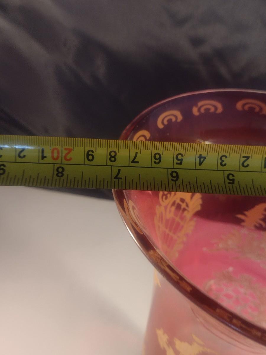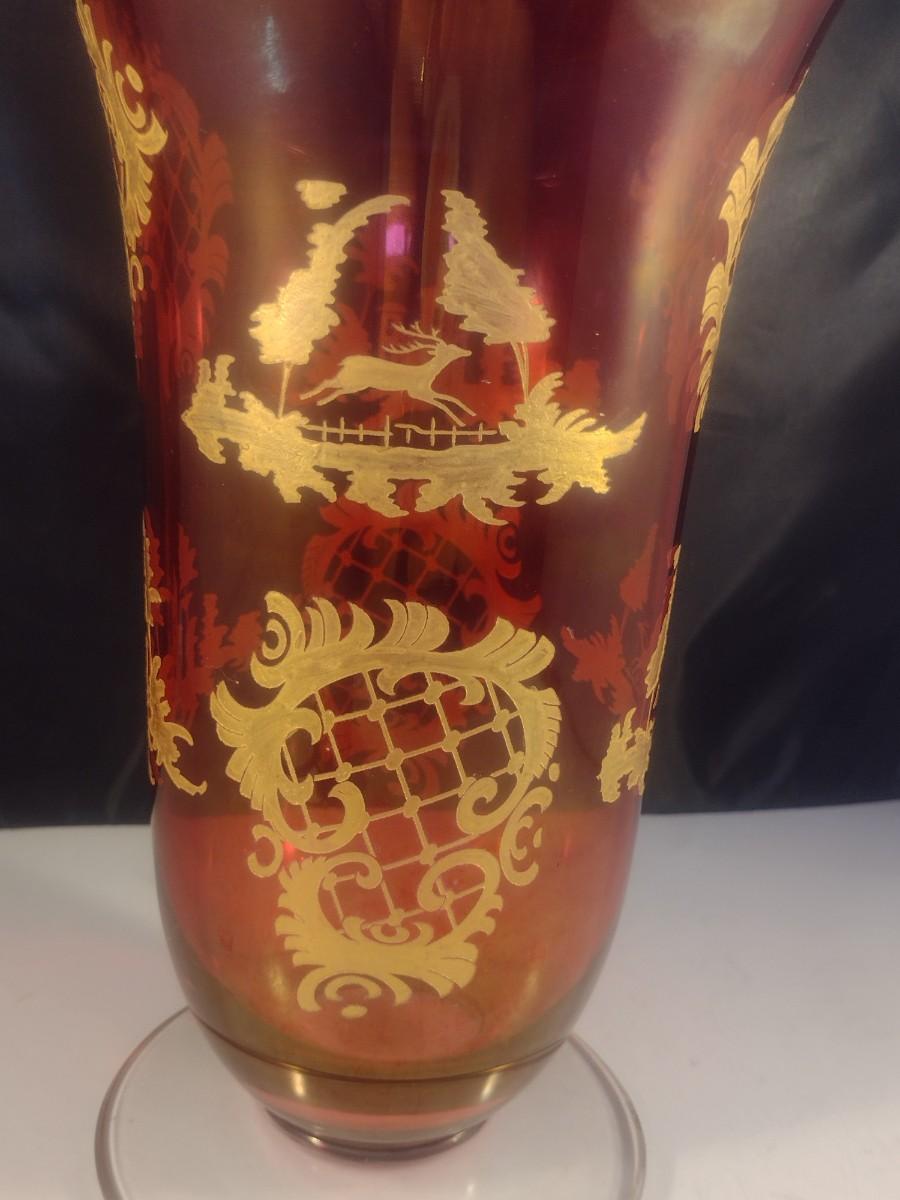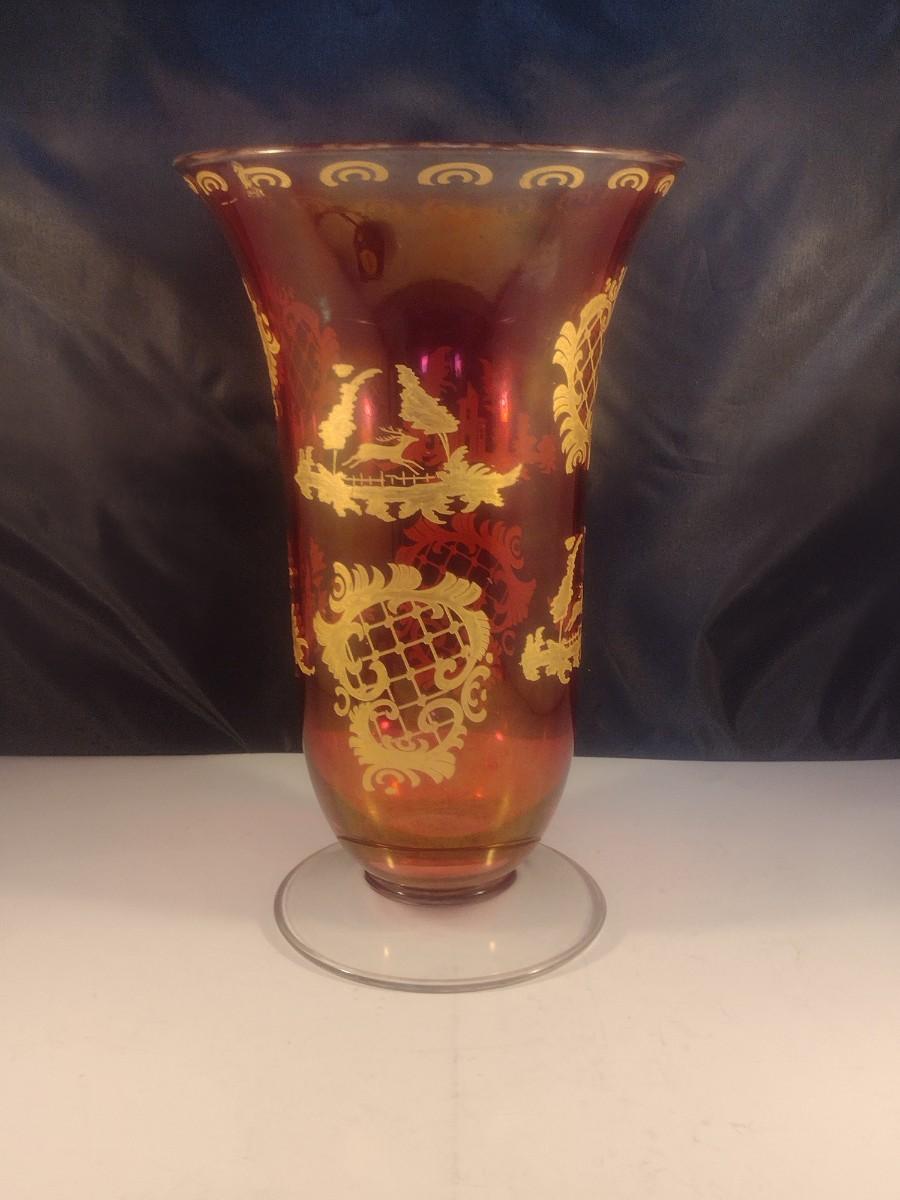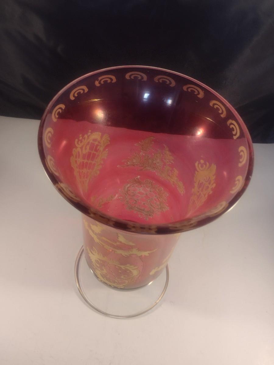 Vintage Cranberry with Gilded Design Moser Style Bohemian Footed Glass Vase