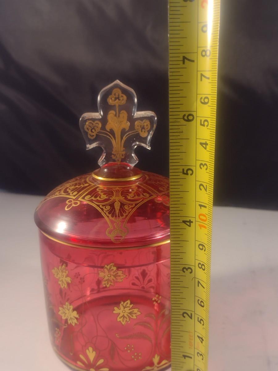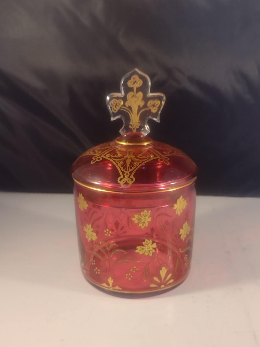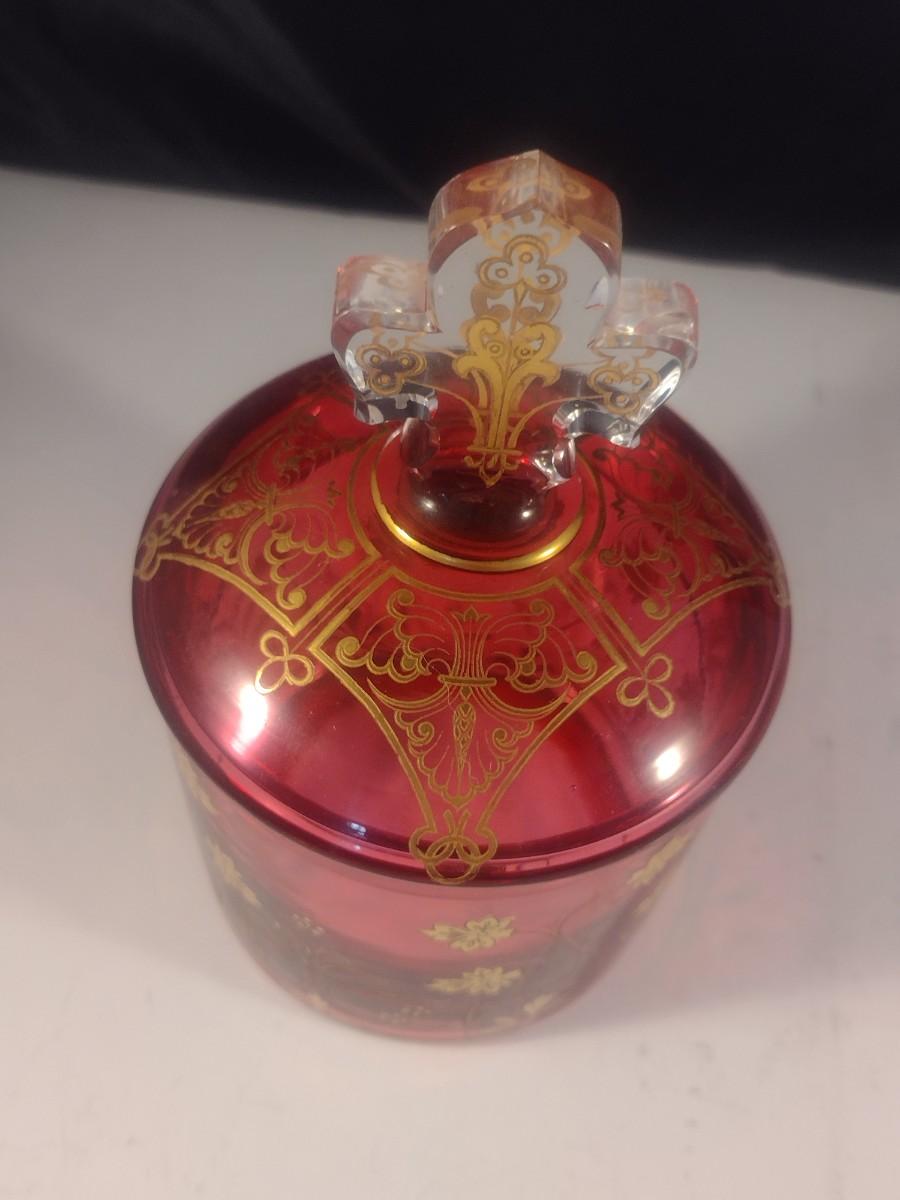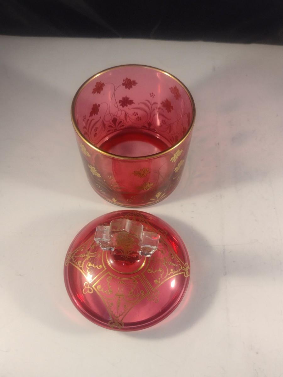 Vintage Cranberry with Gilded Design Moser Style Bohemian Lidded Glass Dish