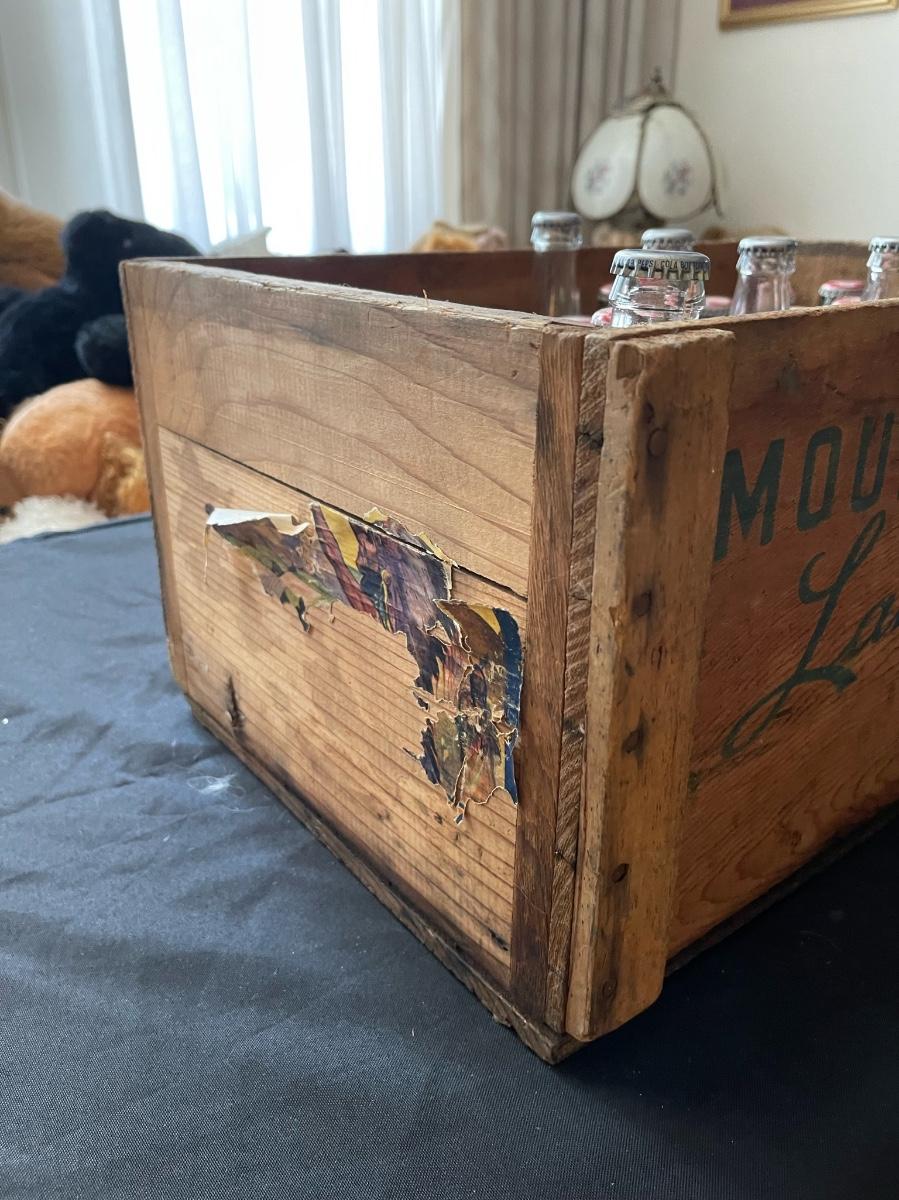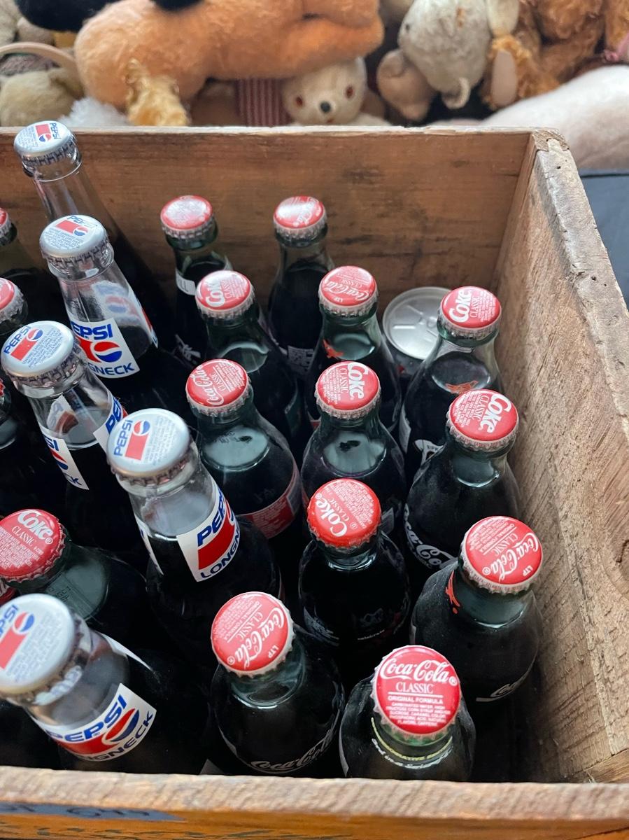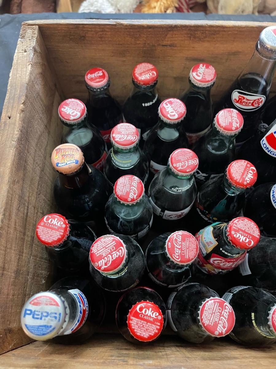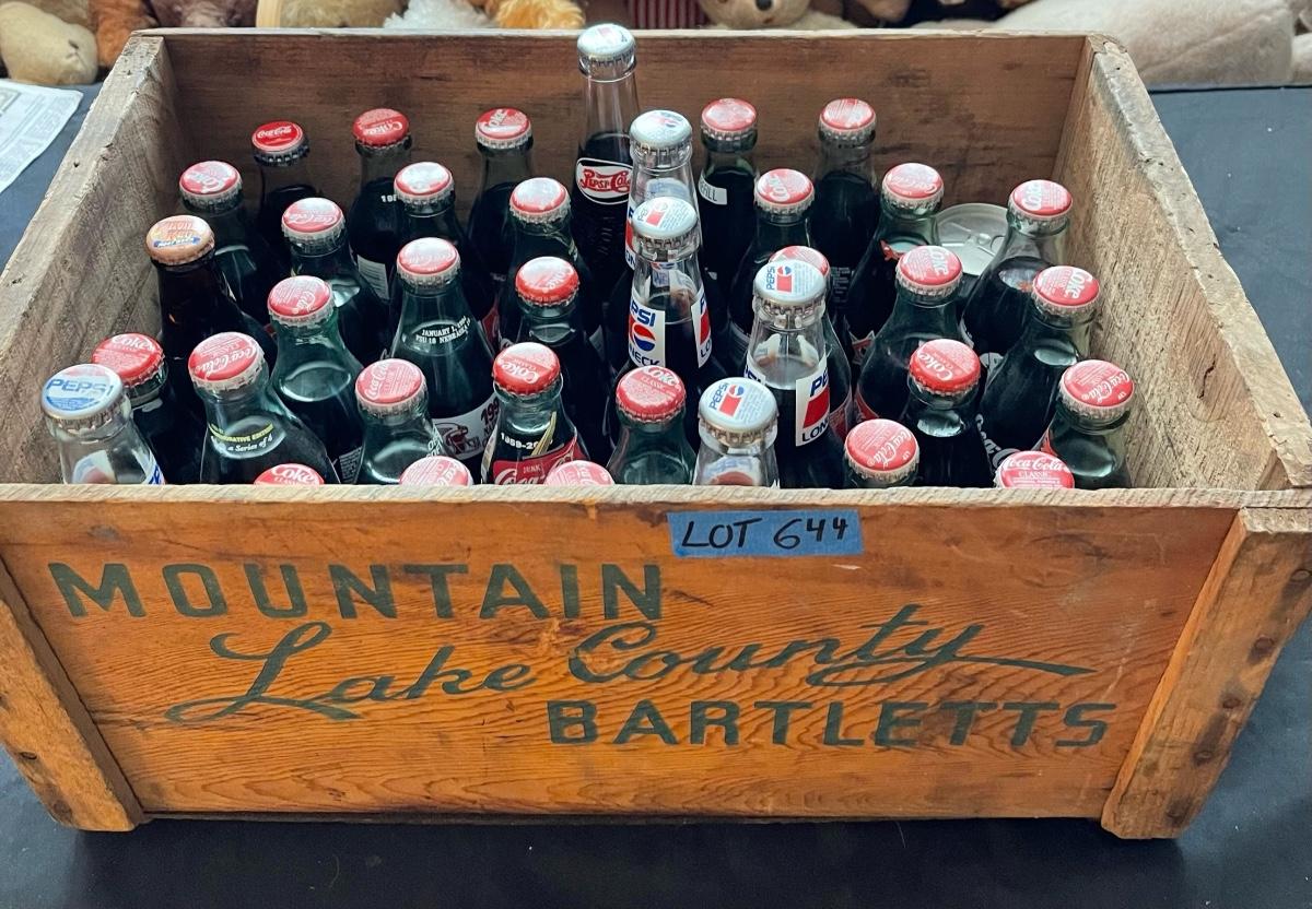 Vintage Mountain Lake Country Bartletts crate with 38 miscellaneous full coke bottles, Pepsi, Pirates keg, all old!