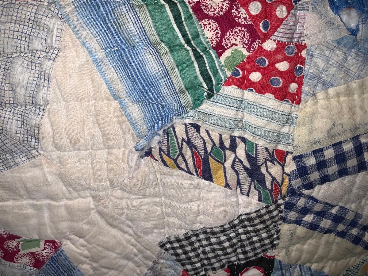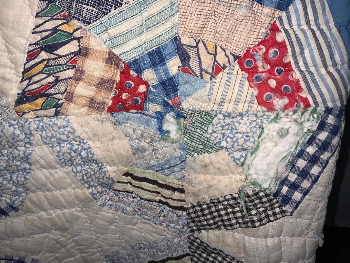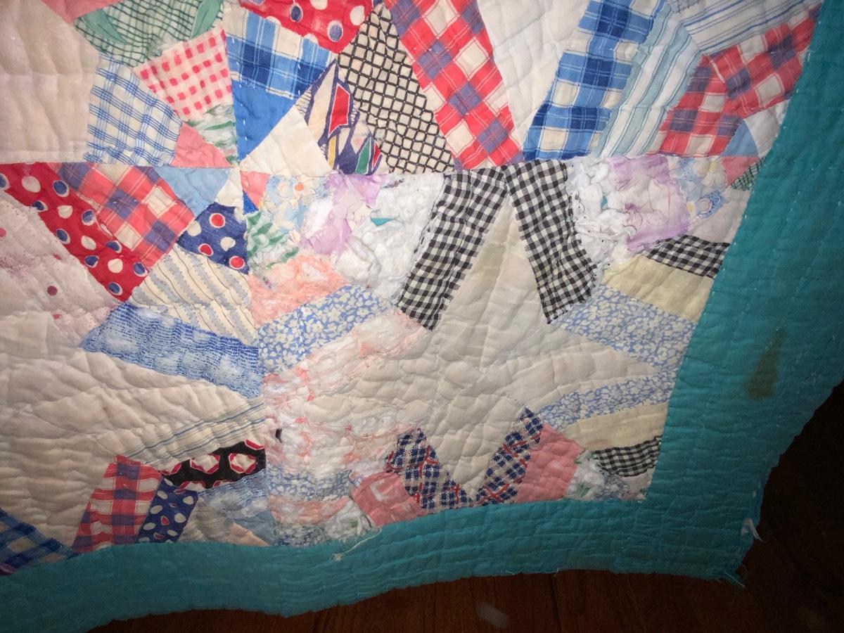 Vintage Crazy String Quilt 60” x 70”. Would make a great cutter quilt as there are many rips, tears, and stains