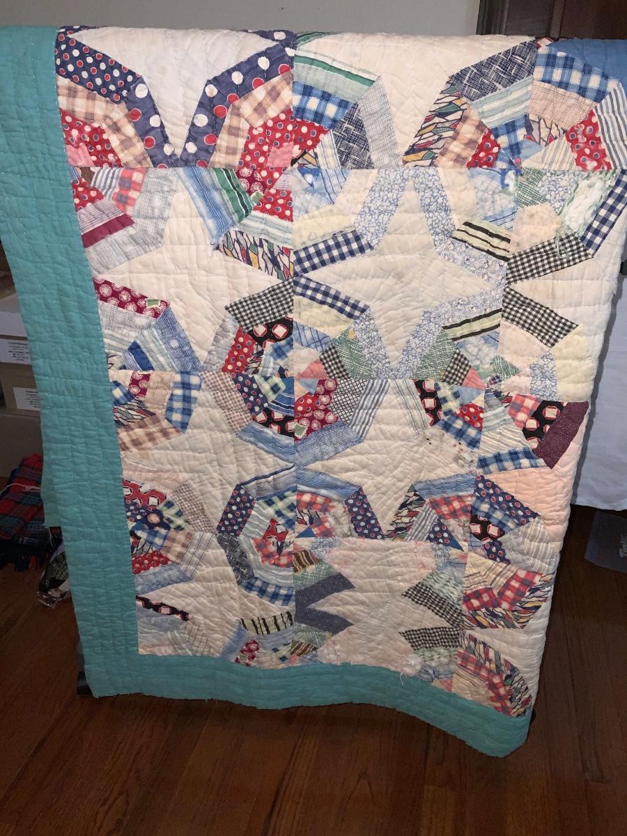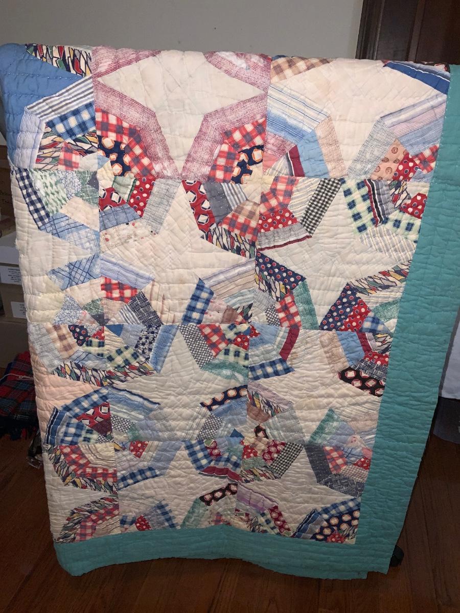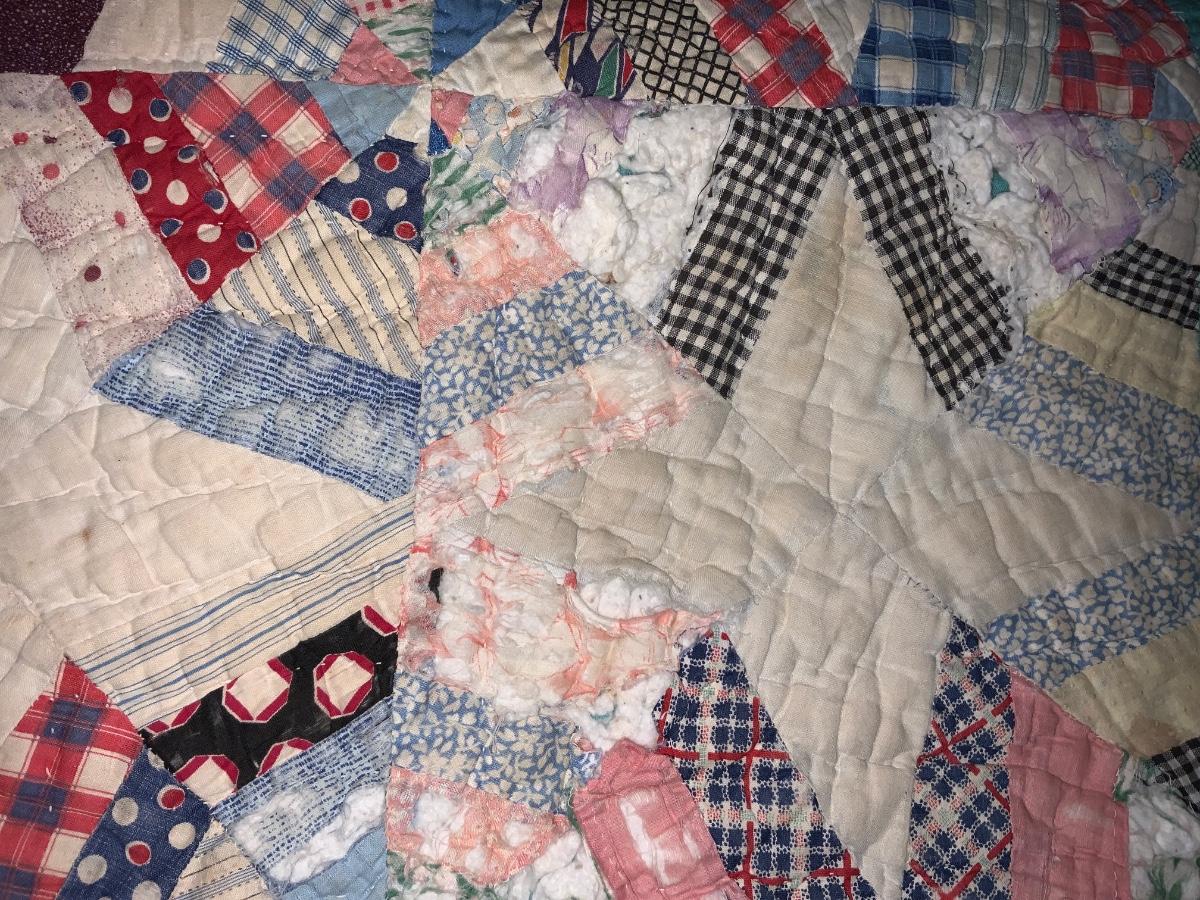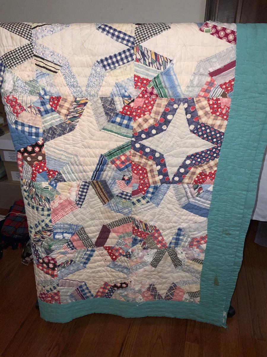 Vintage Crazy String Quilt 60” x 70”. Would make a great cutter quilt as there are many rips, tears, and stains