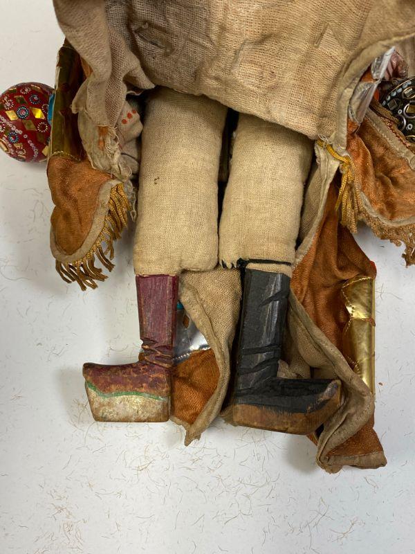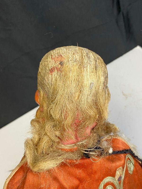 Vintage Chinese opera old man/demon hand puppet. Kinda creepy looking. About 18" size. Has a lot of wear but displays good. His hair and robe are falling apart. I think previous owner added the ball ornaments to his hands. Puppets were made in Mainland China or Taiwan. Circa 1960s 1970s.
