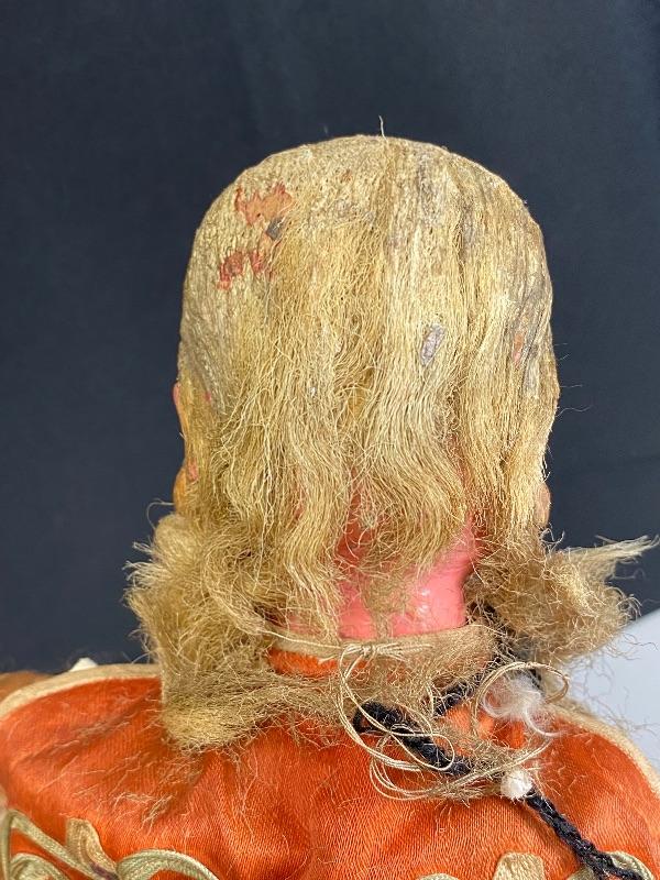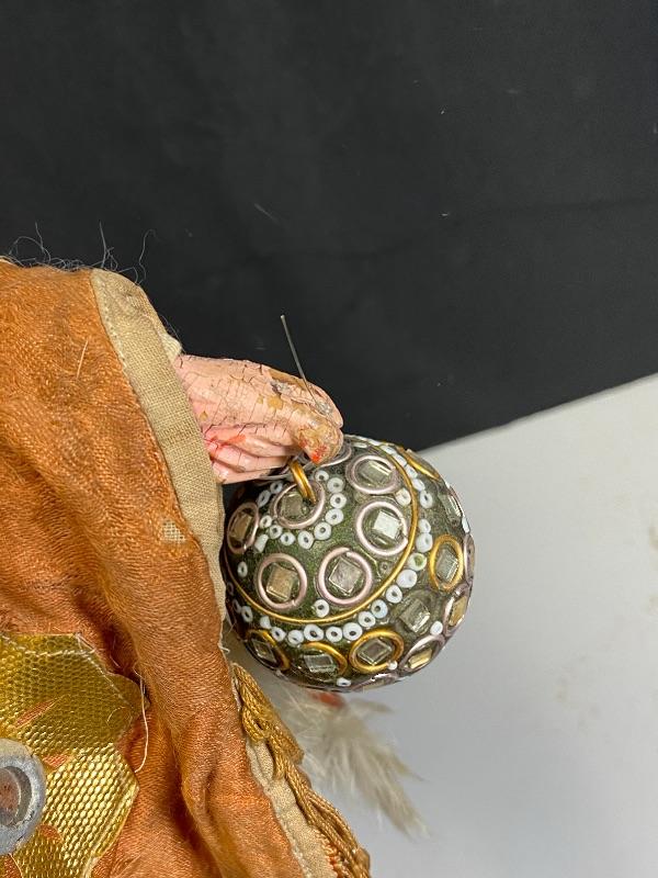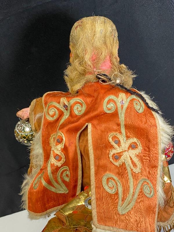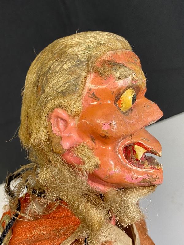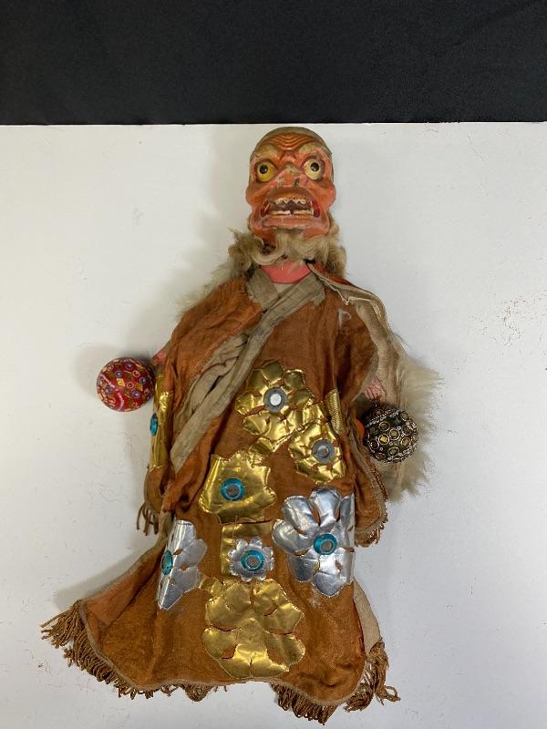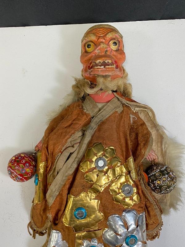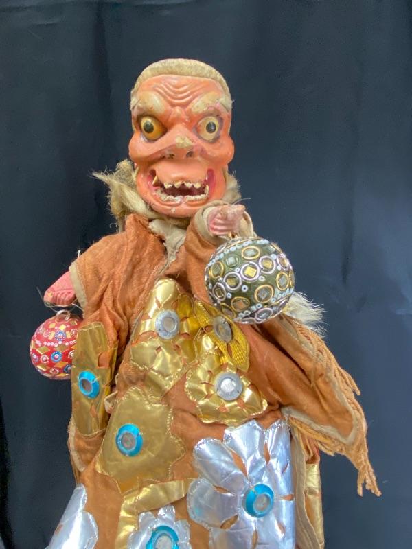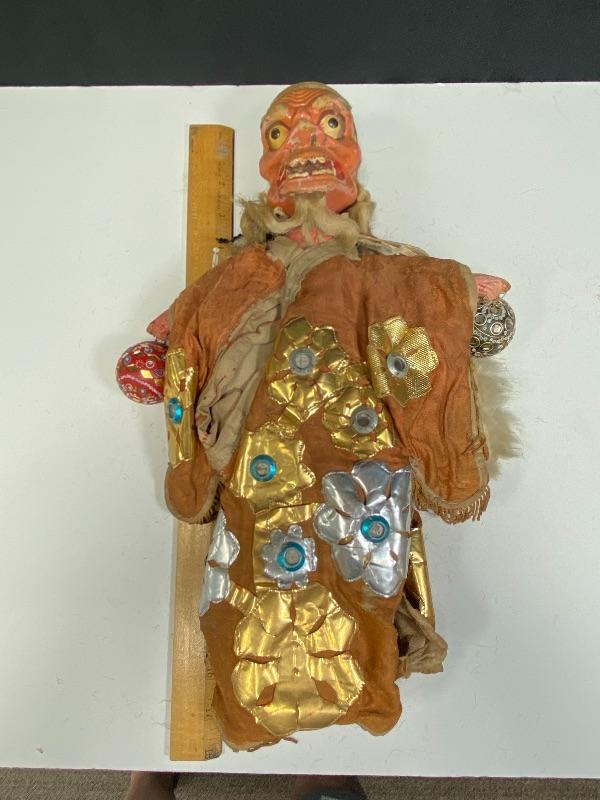 Vintage Chinese opera old man/demon hand puppet. Kinda creepy looking. About 18" size. Has a lot of wear but displays good. His hair and robe are falling apart. I think previous owner added the ball ornaments to his hands. Puppets were made in Mainland China or Taiwan. Circa 1960s 1970s.