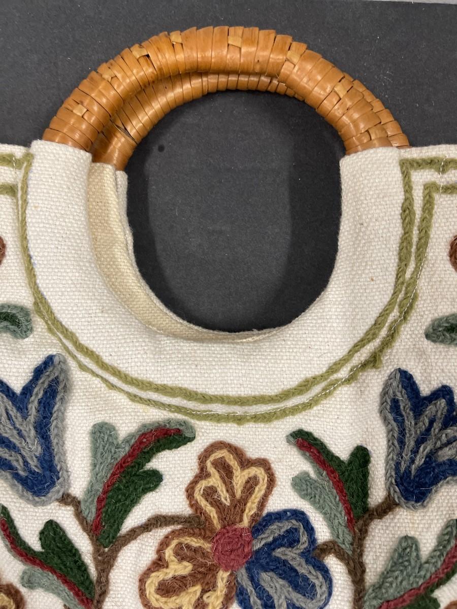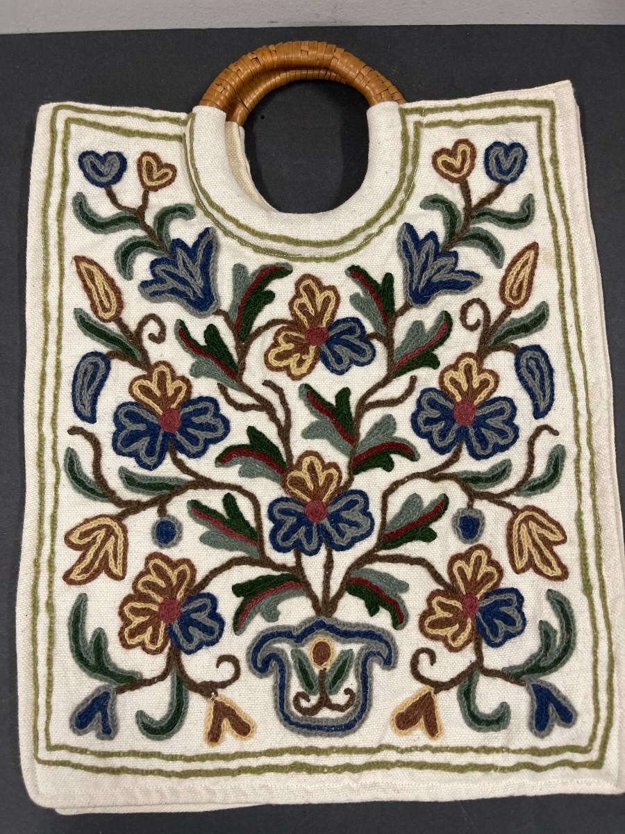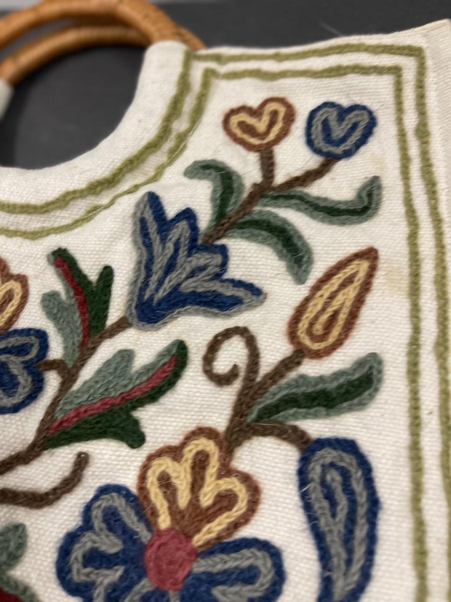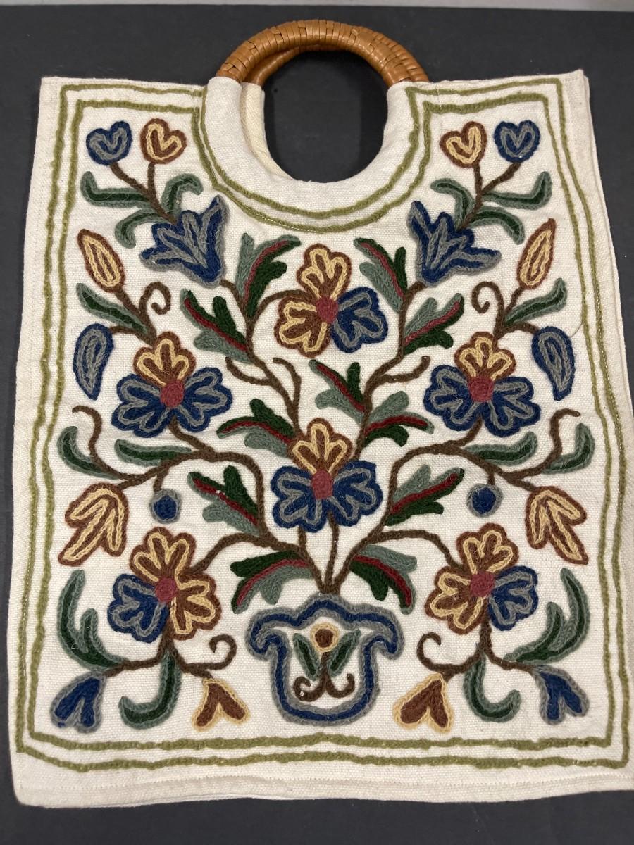 Vintage crewel work, hand embroidered rectangular tote bag. Excellent, like new condition. 14" x 16"