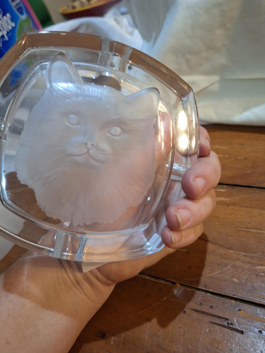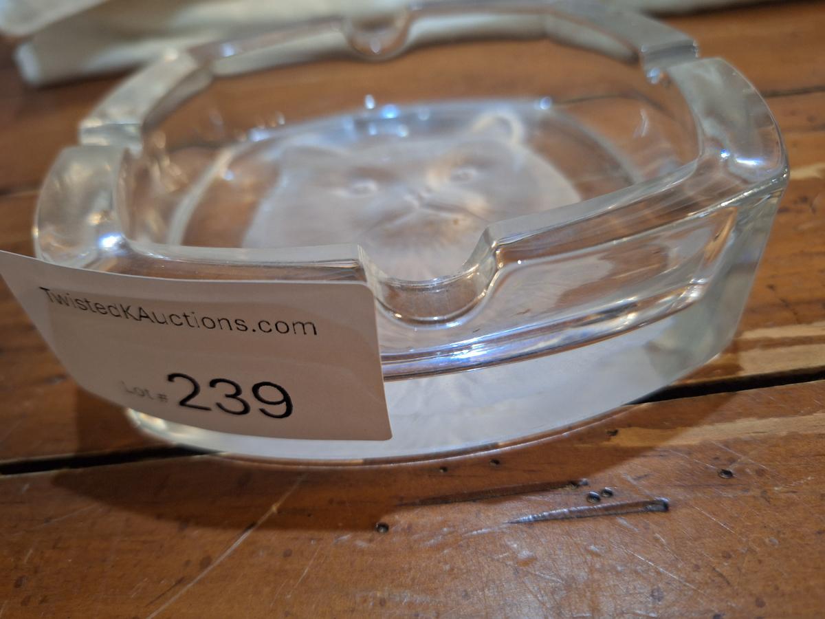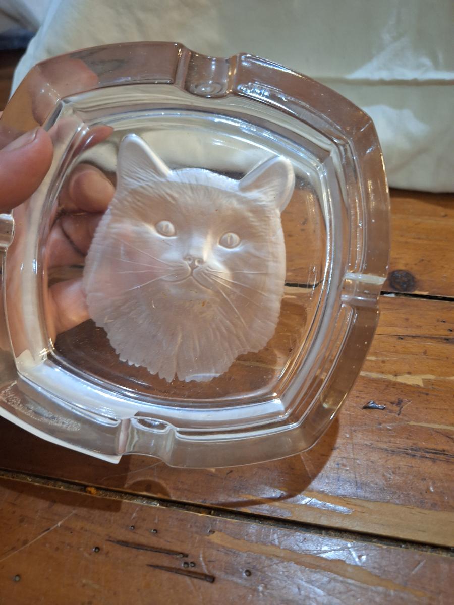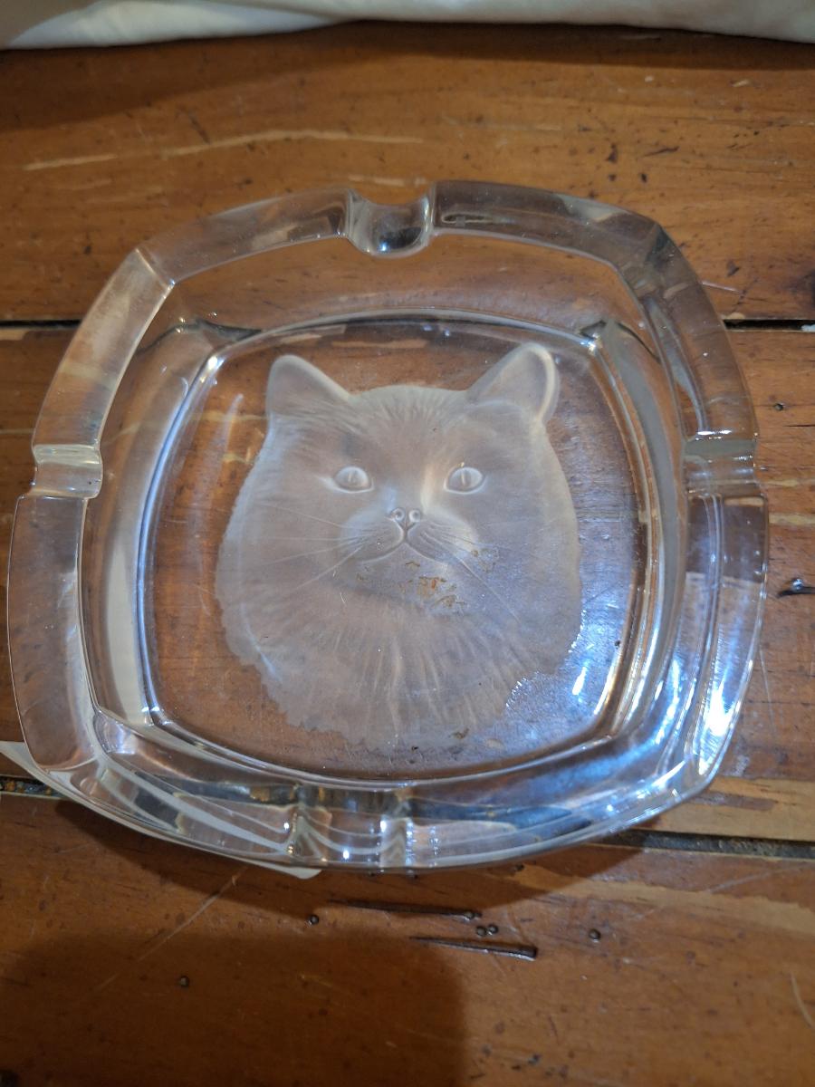 vintage Cristal d'Arques or Cristal de Sevres etched cat crystal ashtray