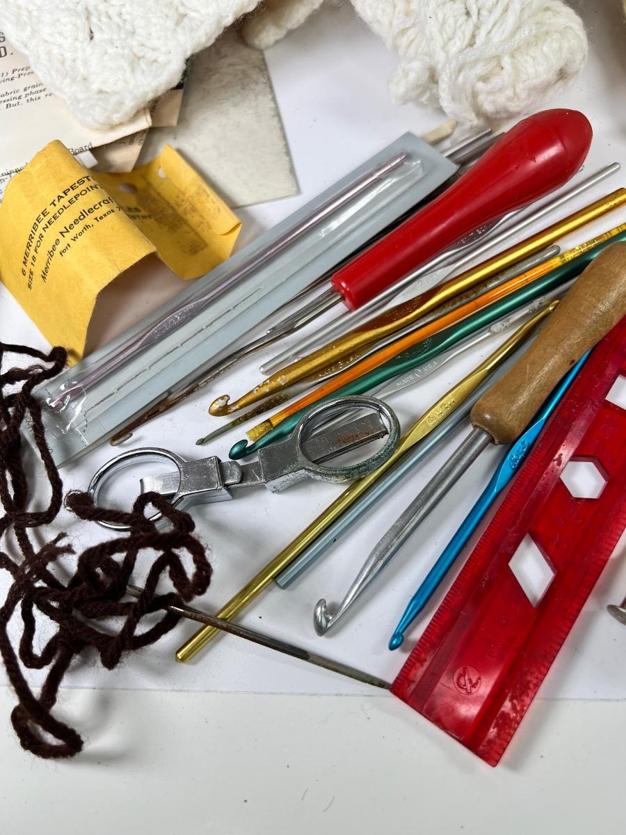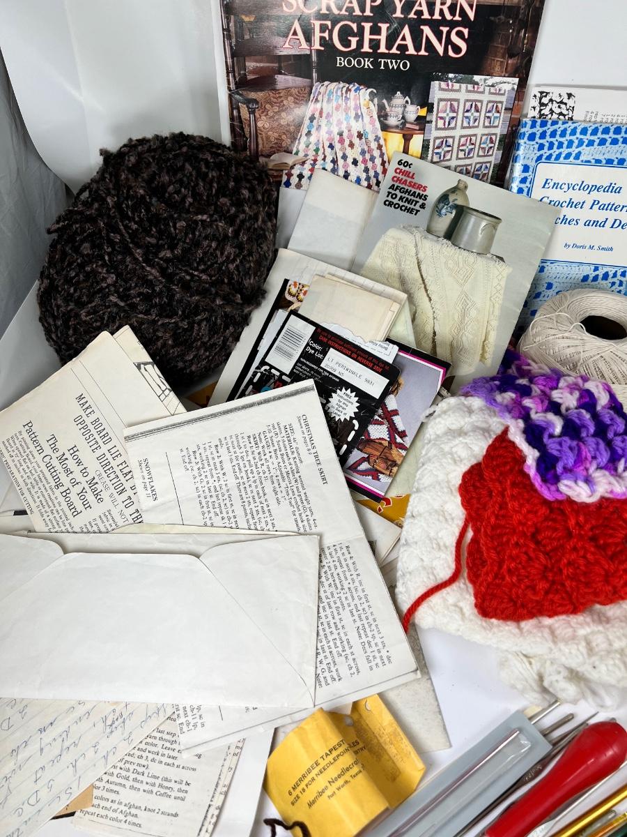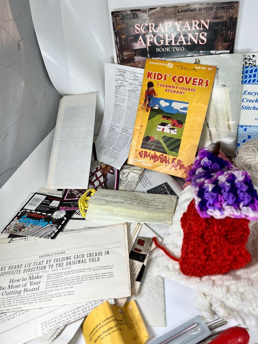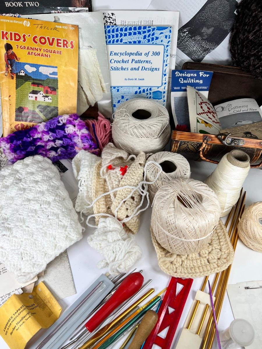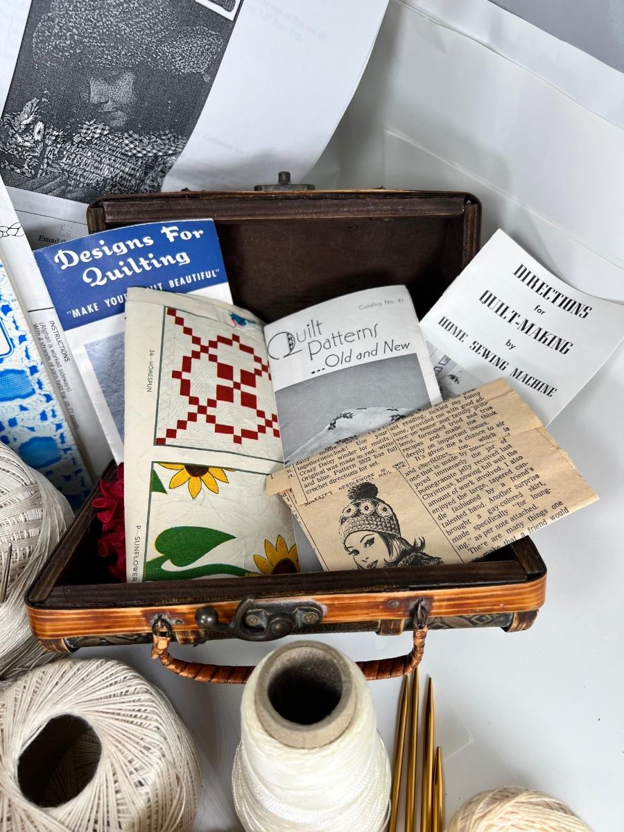 Vintage patterns, crochet hooks, needles, cord, tarn, leisure arts vintage quilt pattern book. Lots of hand written instructions. Rattan case with latch.